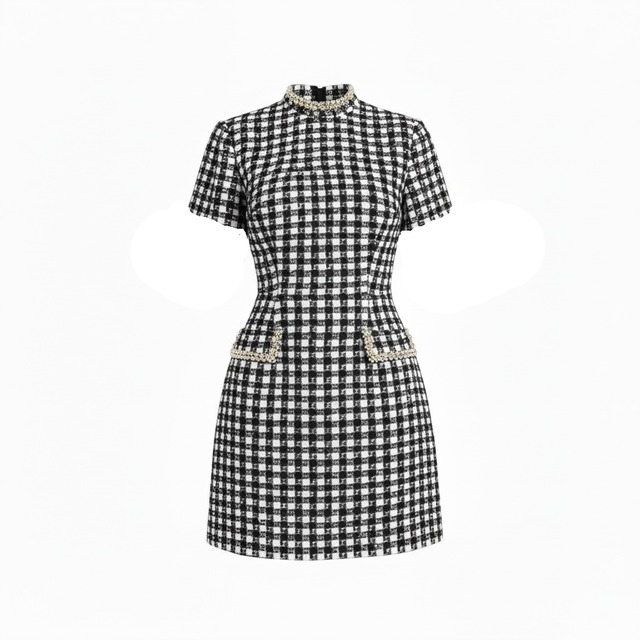■サイズ M ■実寸 身幅 44cm 肩幅 40cm 袖丈 15cm 着丈 79cm ■素材 ポリエステル ■カラー ブラック ホワイト ■ディテール チェック/半袖/パールトリム/モックネック/厚手ツイード/裏地あり/バックジッパー