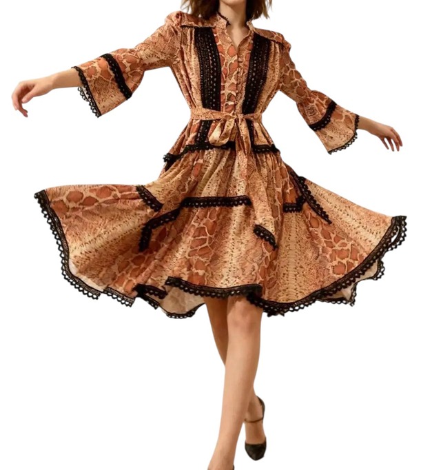 ■サイズ M ■実寸 身幅 54cm 肩幅 34cm 袖丈 48cm 着丈 93cm-108cm ■素材 ポリエステル ■カラー ブラウン ■ディテール スネークパターン/レーストリム/スタンドカラー/バックジッパー