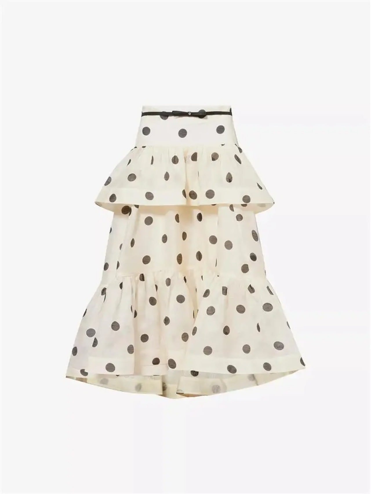 ■サイズ M ■実寸 ウエスト幅 33 cm 着丈 70-98 cm ■素材 ポリエステル ■カラー アイボリー ■ディテール ティアード/リボンベルト/ポルカドット/ラッフル/後ろウエストゴムのギャザー/サイドジッパー/後ろ丈長め/裏地あり