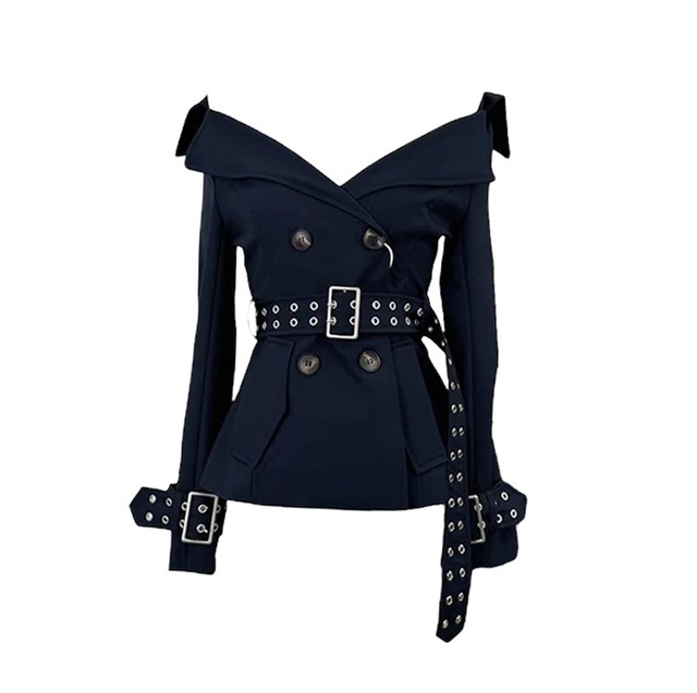 ■サイズ S ■実寸 身幅 44cm 肩幅 39cm 袖丈 59cm 着丈 54cm ■素材 ポリエステル ■カラー ネイビー ■ディテール トレンチ/ショートジャケット/オフショルダー/ベルト/裏地