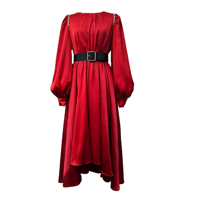 ■サイズ M ■実寸 身幅 42cm 肩幅 34cm 袖丈 66cm 着丈 106cm-121cm ■素材 ポルエステル ■カラー レッド ■ディテール 厚手サテン/パフスリーブ/ビジュー/後ろ丈長め/ベルト/ジッパー/ポケット