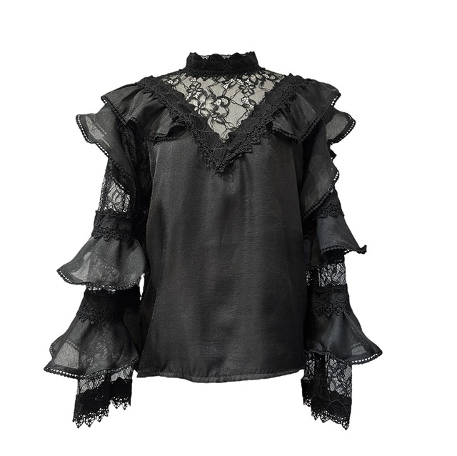 ■サイズ M ■実寸 身幅 52cm 肩幅 38cm 袖丈 63cm 着丈 56cm ■素材 ポリエステル ■カラー 2Color ■ディテール レース/カットアウトレース/ハートモチーフ/コンビ素材/ラッフル/スタンドカラー/メタリック/ジッパー/ティアードスリーブ