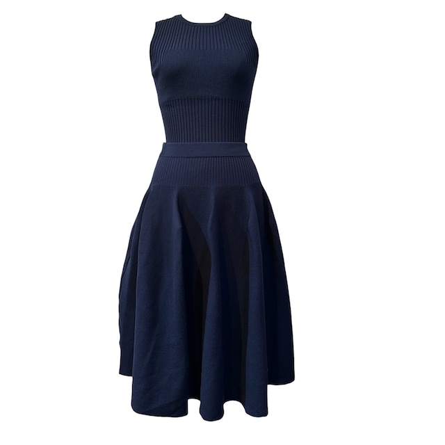 ■サイズ M ■実寸 身幅 28cm 着丈 52cm スカートウエスト幅 31cm スカート着丈 62cm ■素材 ポリエステル55% レーヨン35% スパンデックス10% ■カラー ネイビー ■ディテール スカートセットアップ/リブニット/ストレッチ/立体シルエット