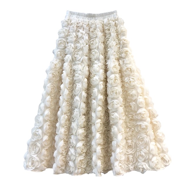 ■サイズ ワンサイズ ■実寸 ウエスト幅 28cm 着丈 80cm ■素材 ポリエステル ■カラー 2Color ■ディテール ウエストゴムのギャザー/ローズコサージュ/プルオン/裏地なし