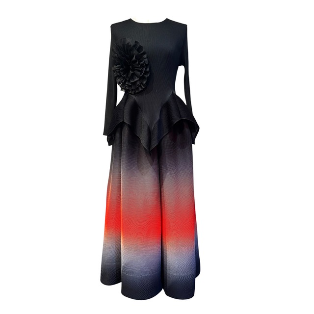 ■サイズ M ■実寸 身幅 30cm 肩幅 32cm 袖丈 49cm 着丈 350cm スカートウエスト幅 33cm(ゴムのギャザーのため伸縮性あり) スカート着丈 91cm ■素材 ポリエステル ■カラー ブラック ■ディテール プリーツ/スカートセットアップ/ペプラムトップス/ビッグコサージュ/プルオーバー/グラデーション/ボリュームスカート/プルオン
