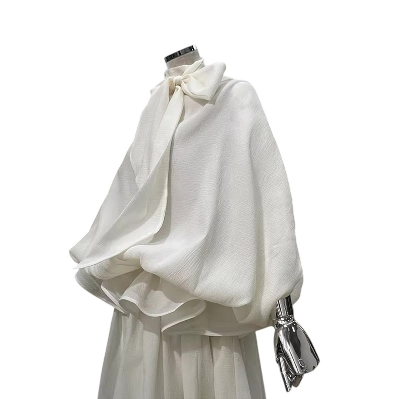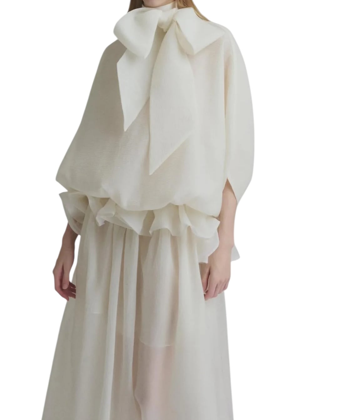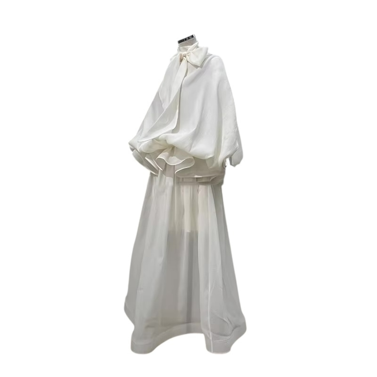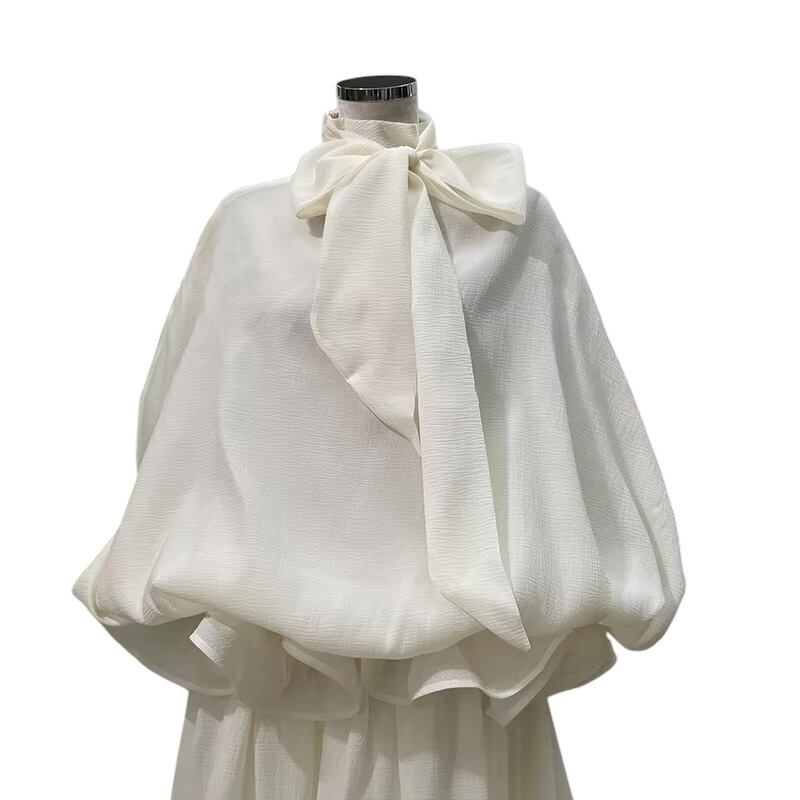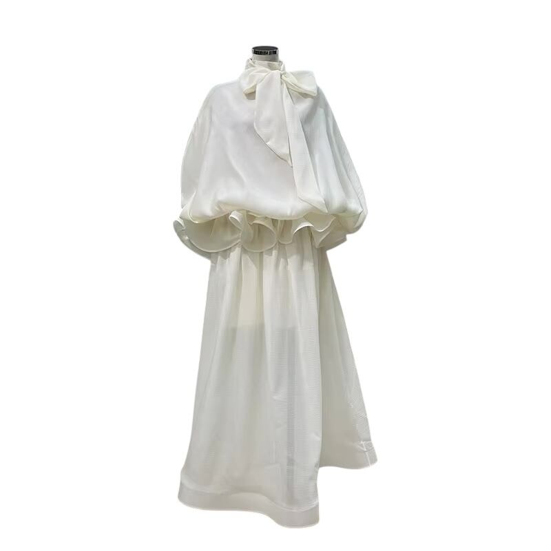 ■ディテール エンボス/シフォン/ボウタイ/ペプラムラッフル/ロング/ドルマンスリーブ/ウエストゴムのギャザー
