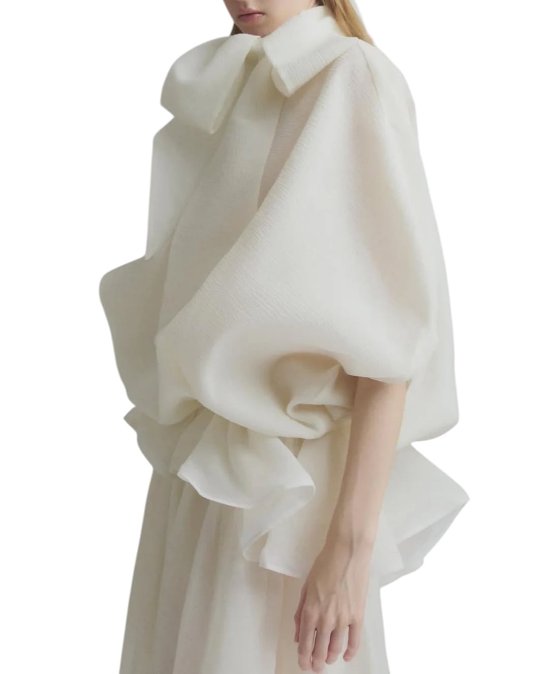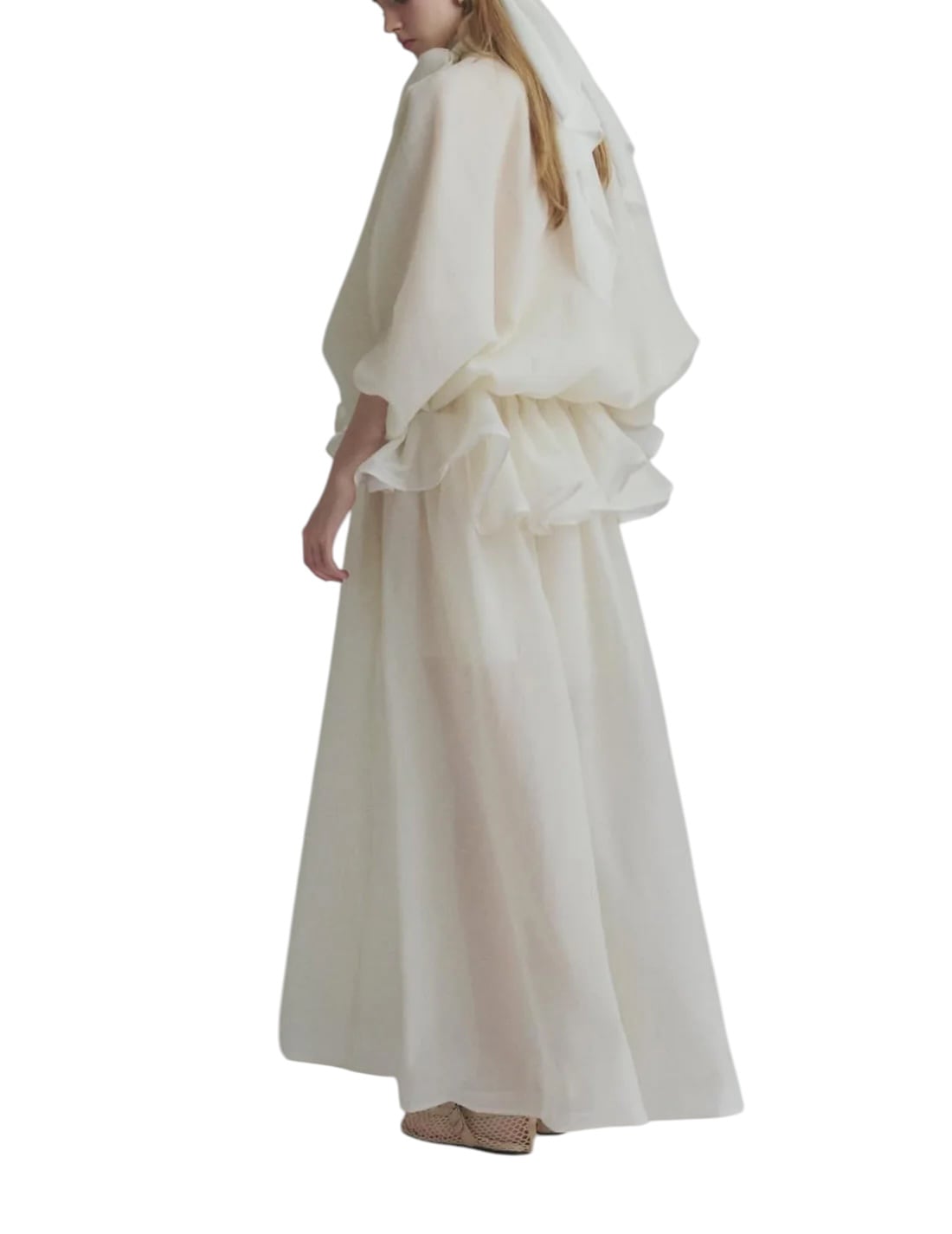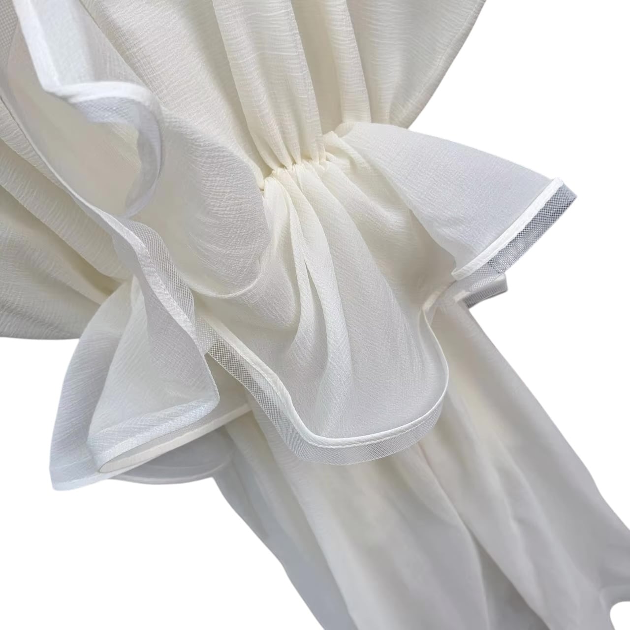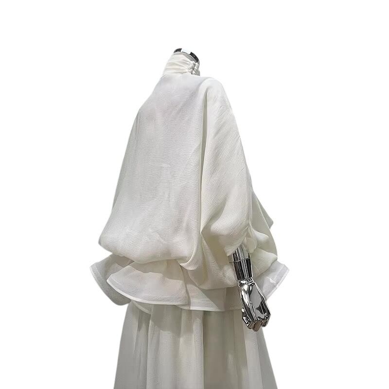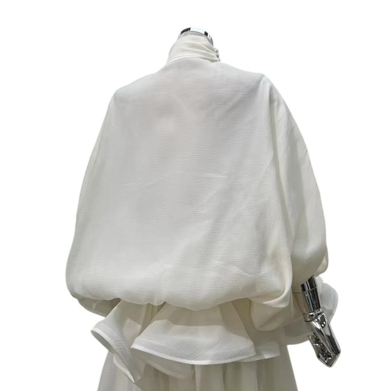 ■ディテール エンボス/シフォン/ボウタイ/ペプラムラッフル/ロング/ドルマンスリーブ/ウエストゴムのギャザー