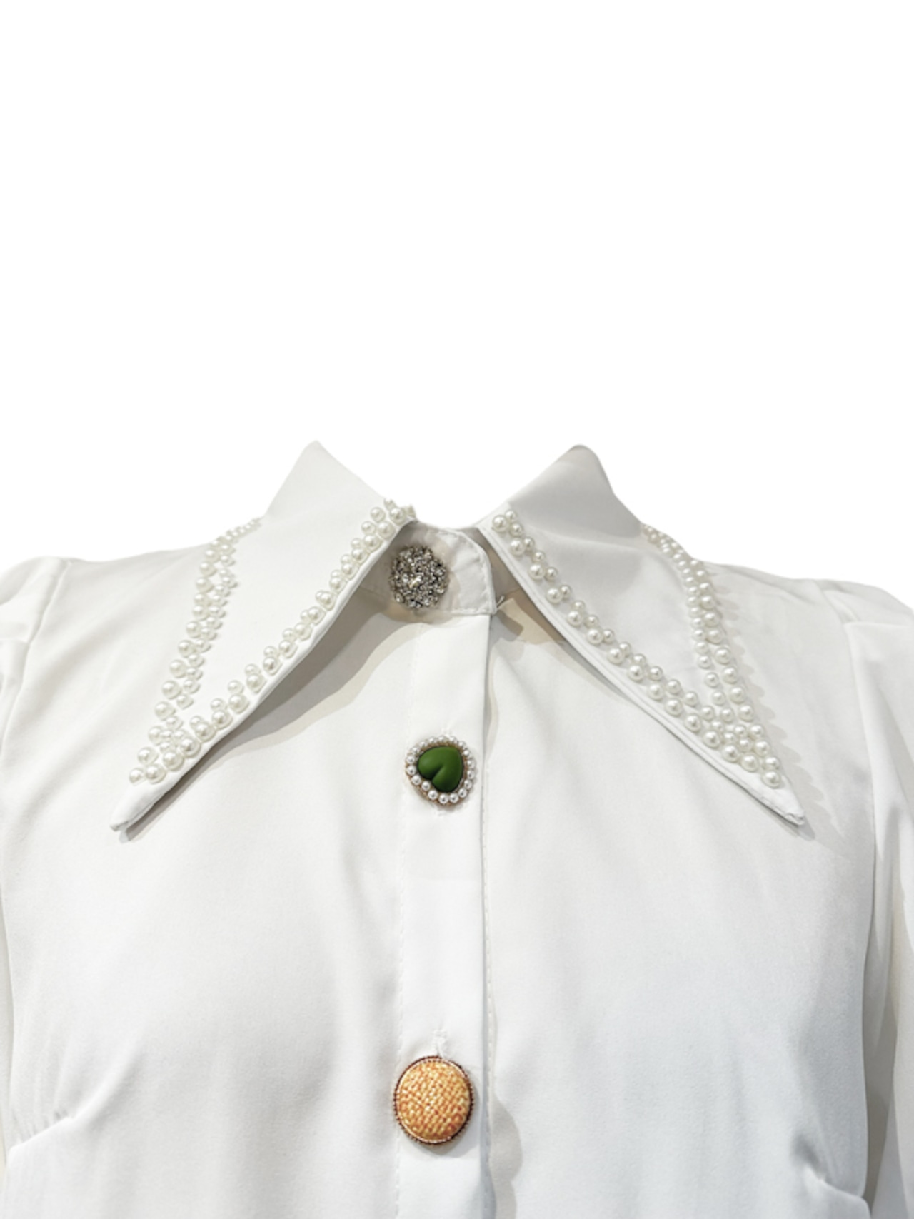 ■ディテール クロス/パールトリミングの襟/アシンメトリーなボタン/ビジュー/パフスリーブ