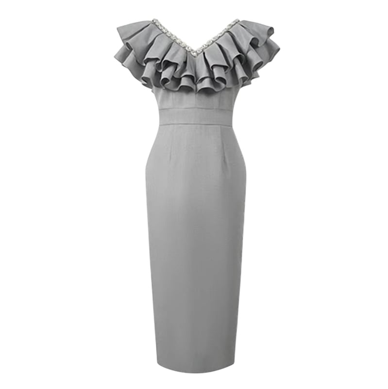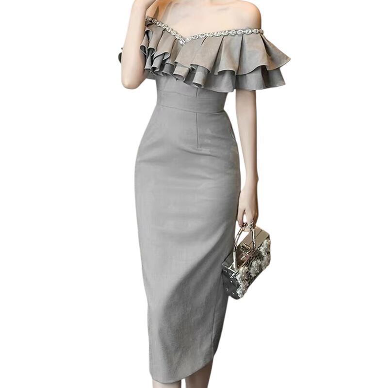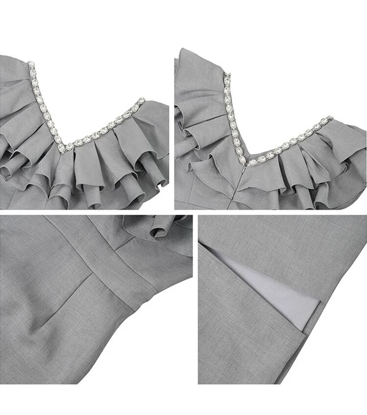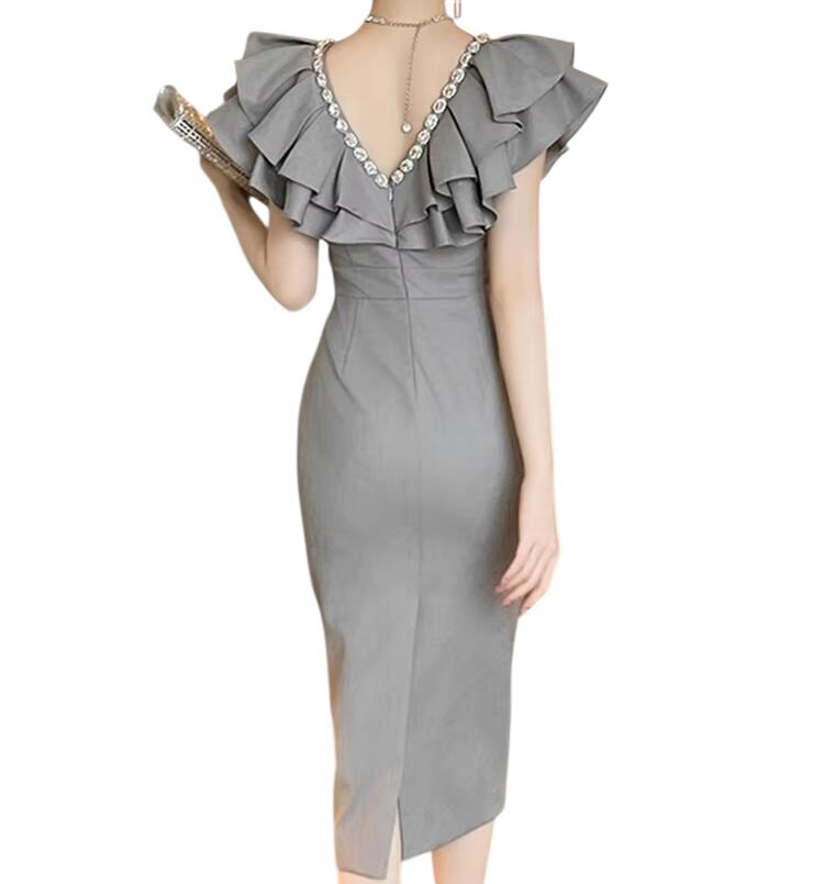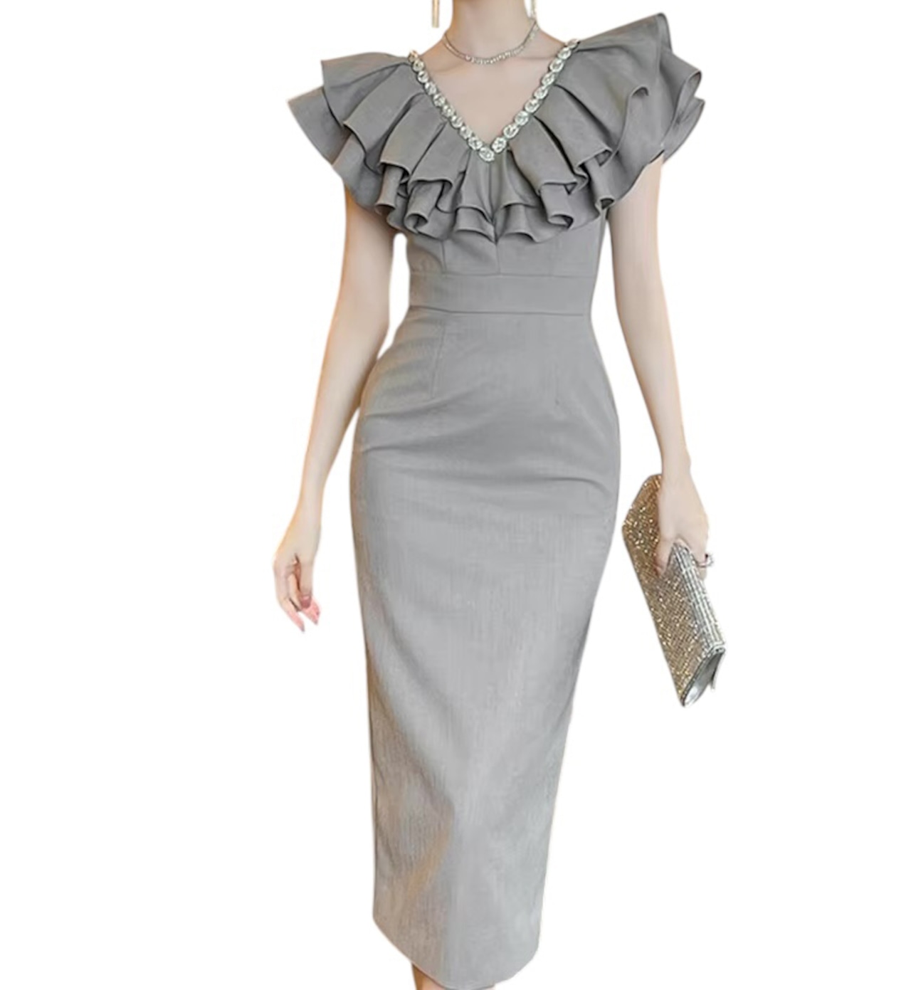 ■ディテール ラッフルカラー/ビジュートリム/タイトシルエット/スリット/裏地