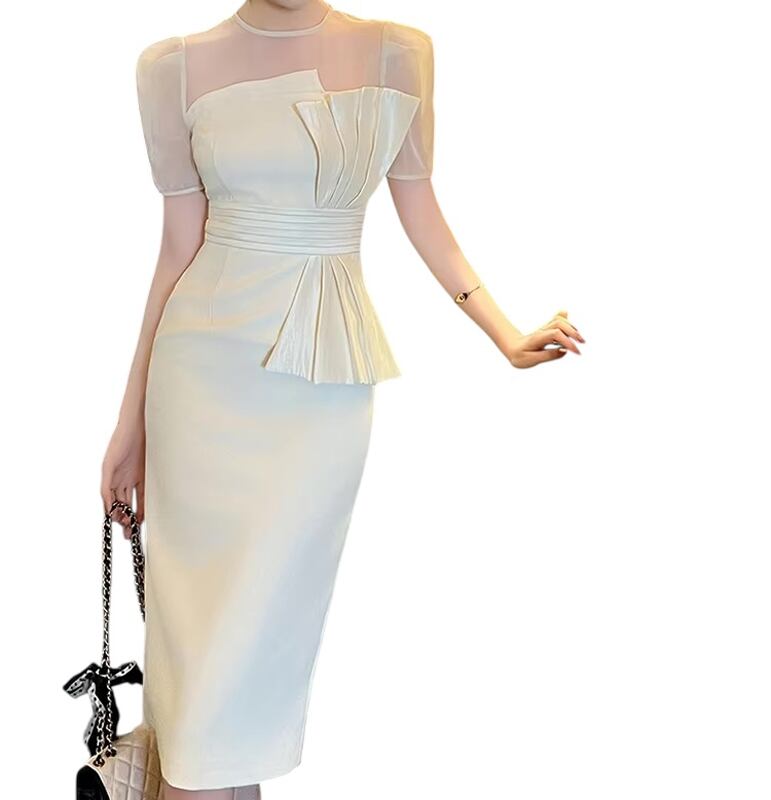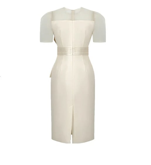 ■ディテール メタルスレッドのピンストライプ/オーガンジー切り替え/BOW /サテンカマーベルト/ジッパー