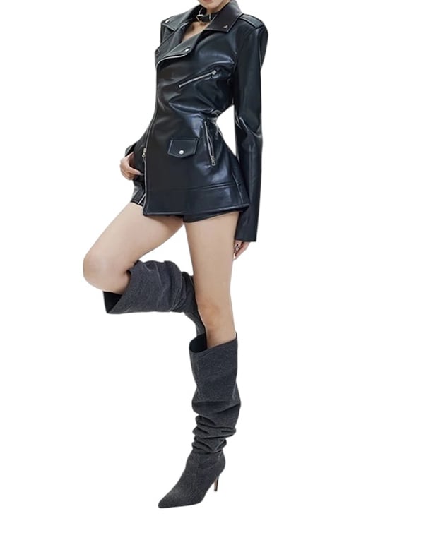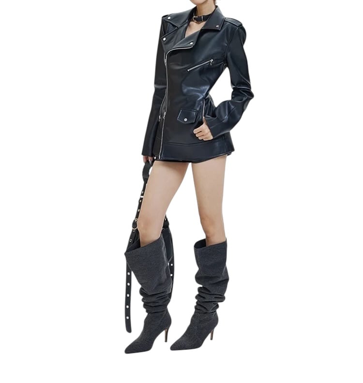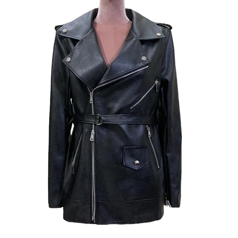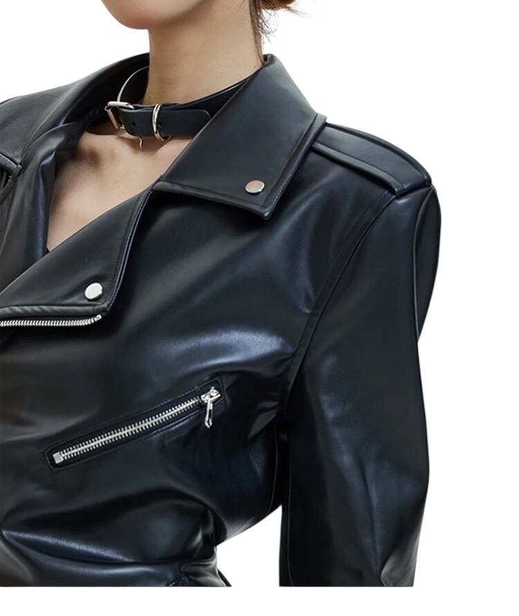 ■ディテール PUレザー/バイカー/ベルト/ショルダーパッド/ジッパー/丈長め
