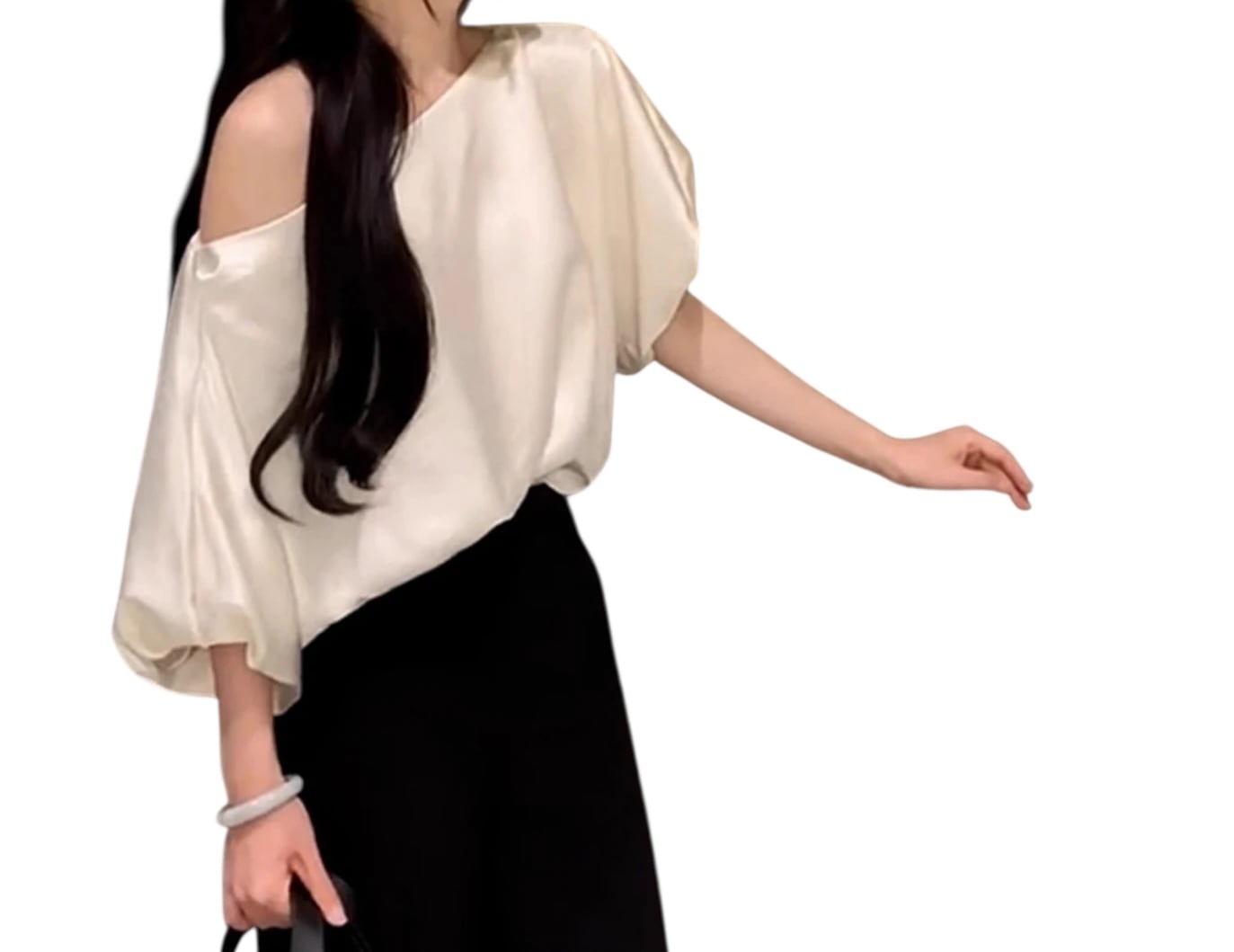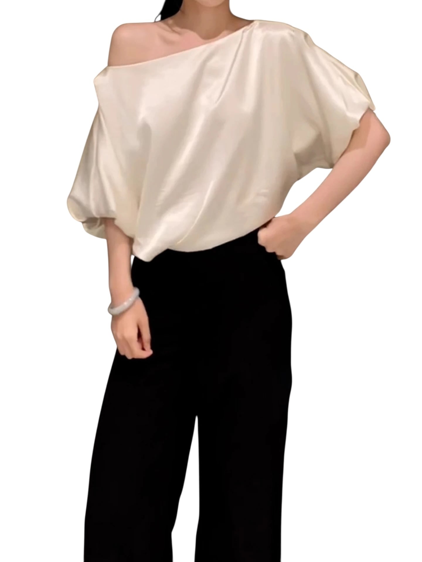 ■ディテール サテン/オフショルダー/バルーンスリーブ/バルーンヘム/プルオーバー/クロップド丈