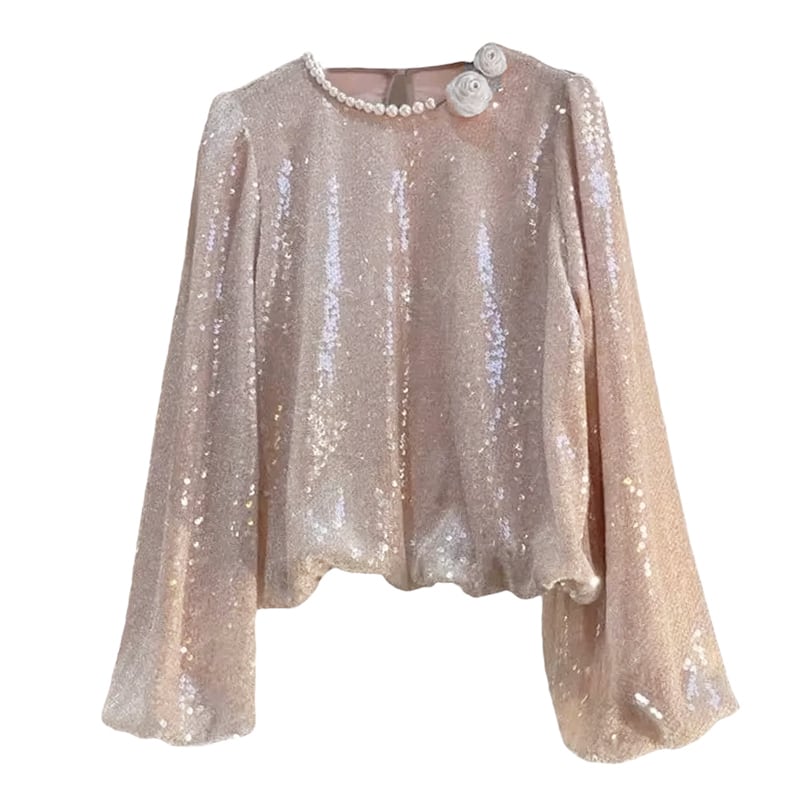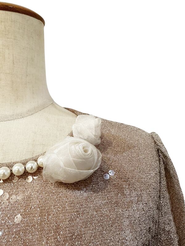 ■ディテール スパンコール/パールトリム/バルーンヘム/バルーンスリーブ/ミニコサージュブローチ/プルオーバー/裏地あり