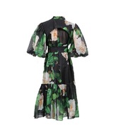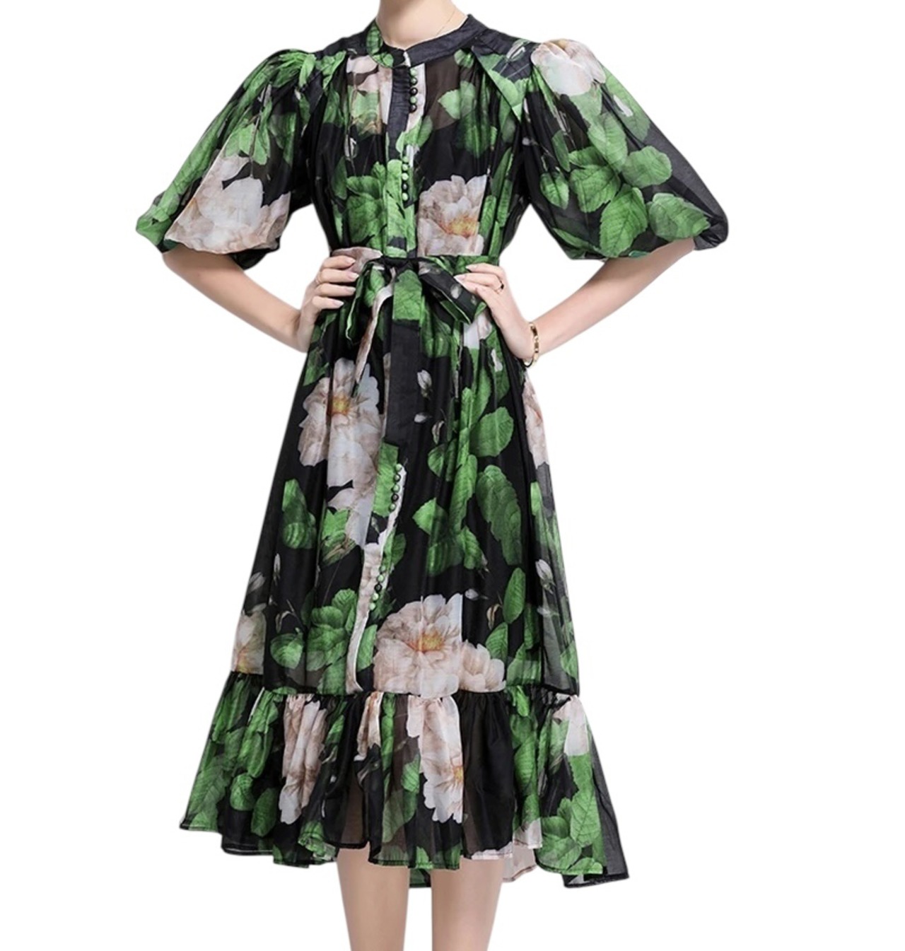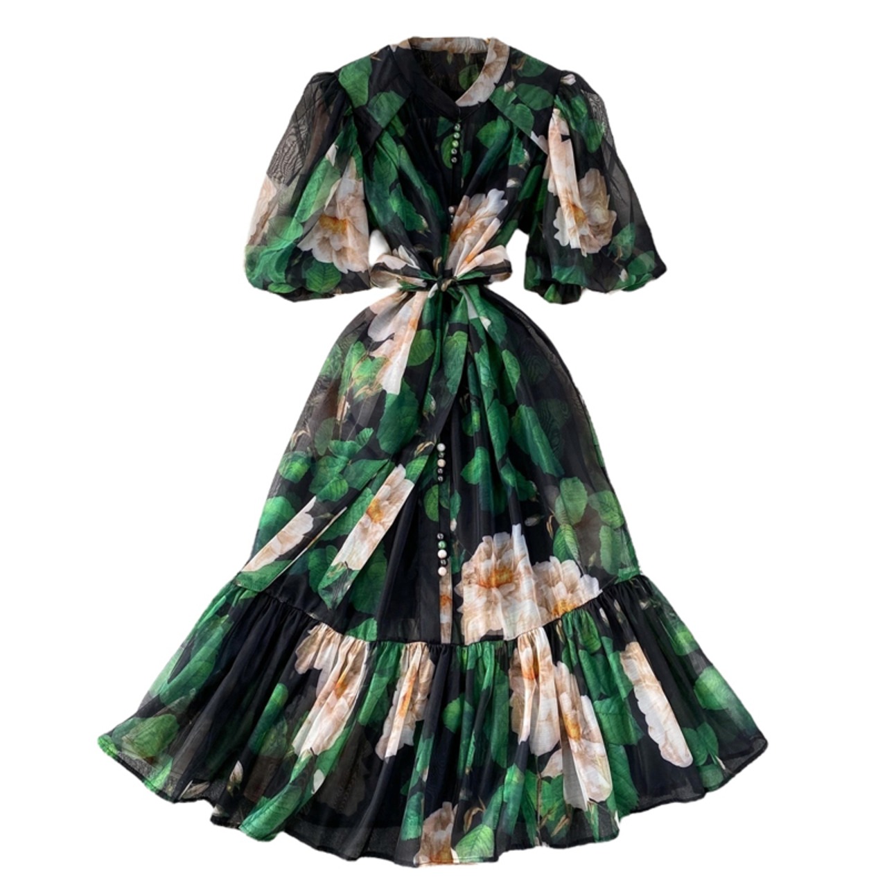 ■ディテール シャツドレス/パフスリーブ/チャイニーズカラー/くるみぼたん/フラワーパターン/インナードレス