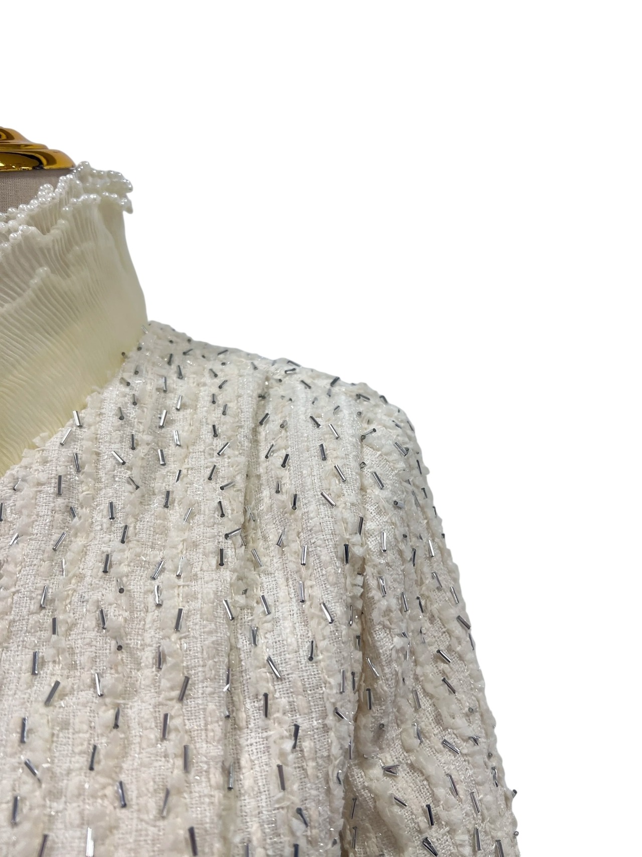 ■ディテール ツイードジャケット/ビーズ装飾/ビジューボタン装飾/オーガンジプリーツ/パールトリム/クロージャー無し