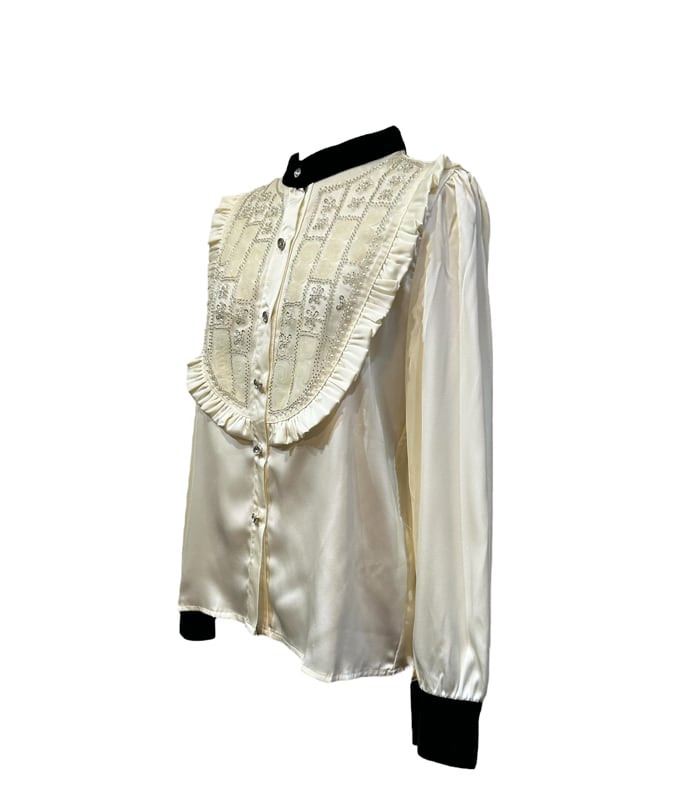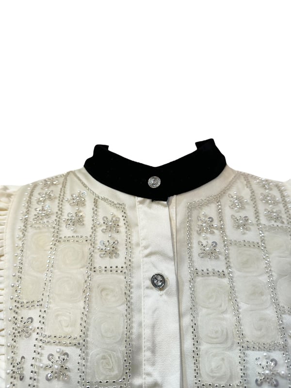 ■ディテール サテンブラウス/厚手のベロア切替/チャイニーズカラー/フロントラッフル/ビジュー/チュールコサージュ/ベルベットのリボンブローチ