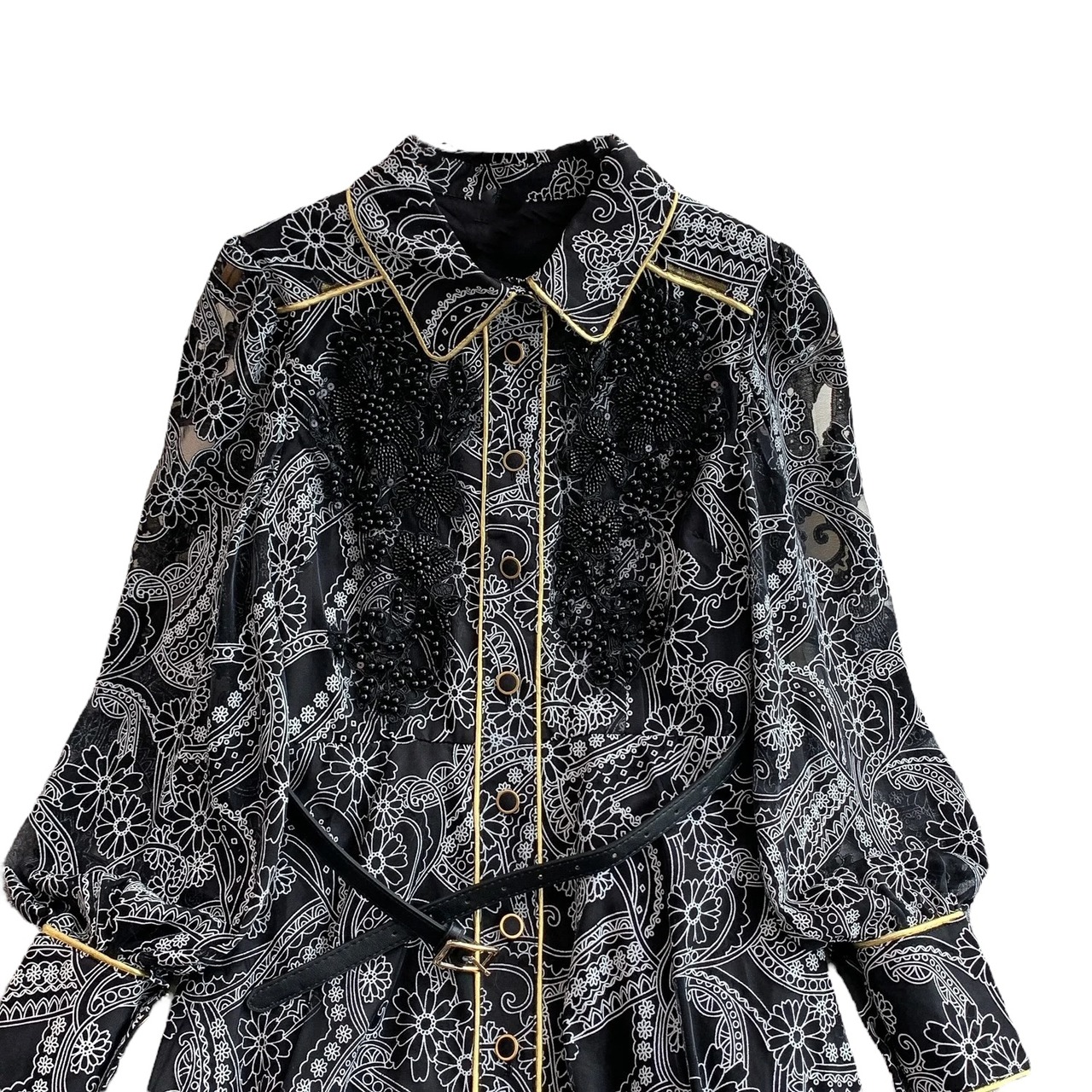 ■ディテール シャツドレス/レース/フレア/クラシックカラー/ベルト/ビジュー/ゴールドのパイピング/袖のみ透け感あり