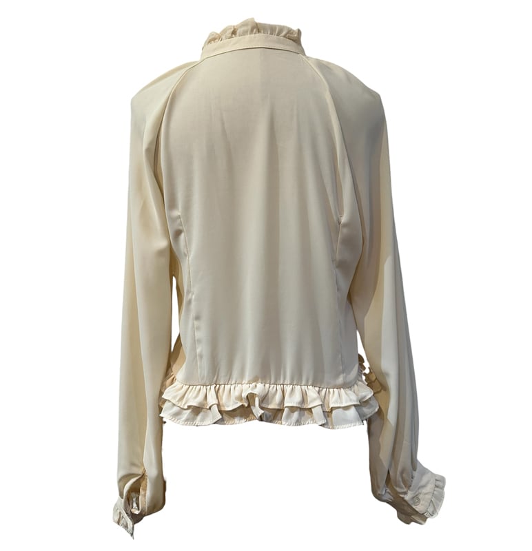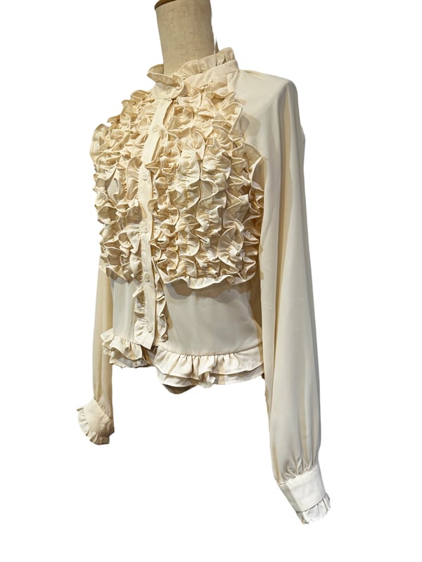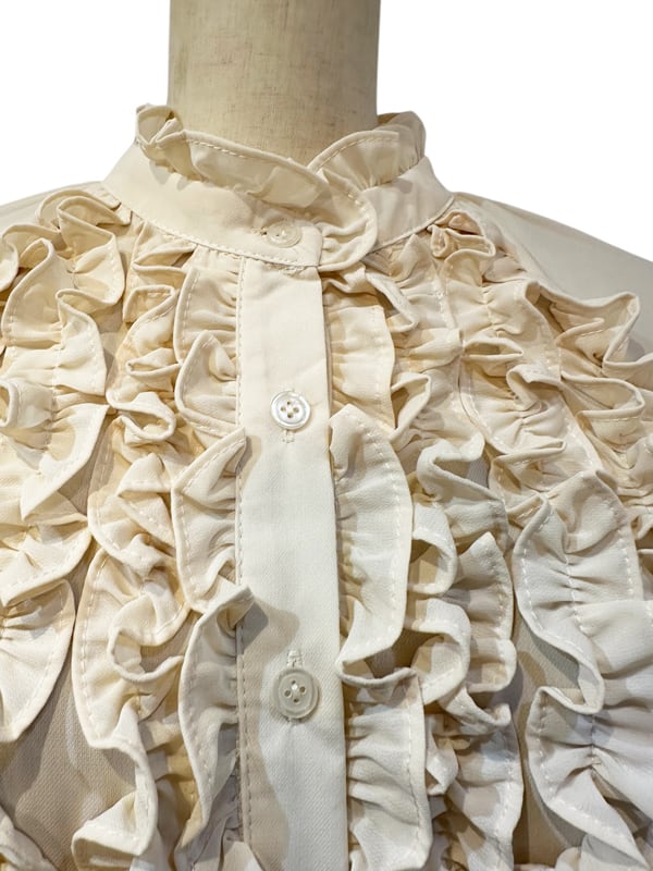 ■ディテール シフォン/スタンドカラー/ラッフル/ベルベットのリボンブローチ