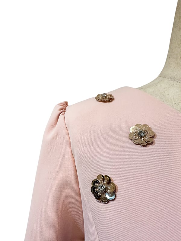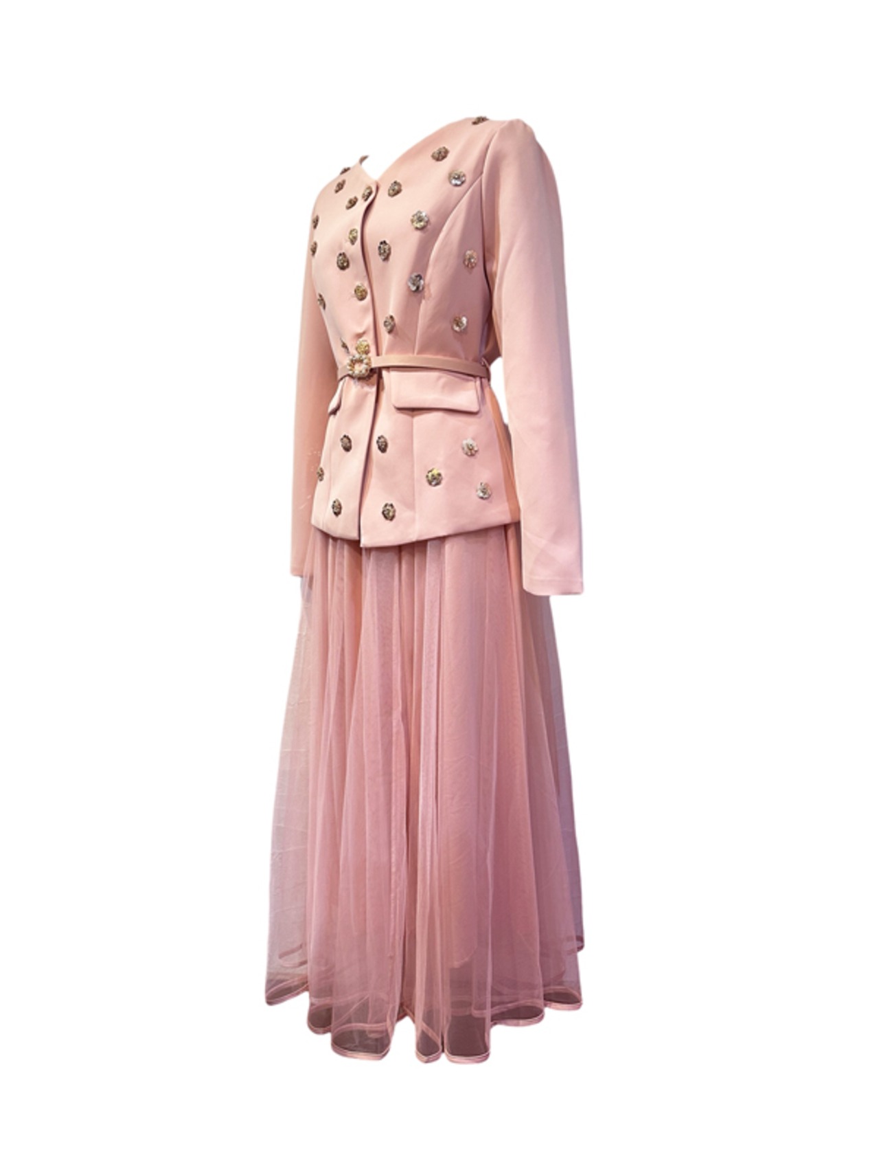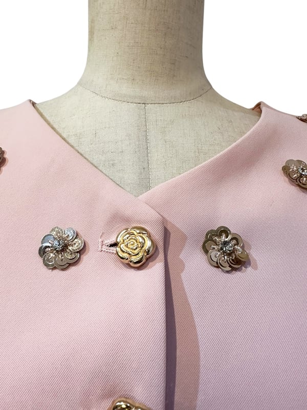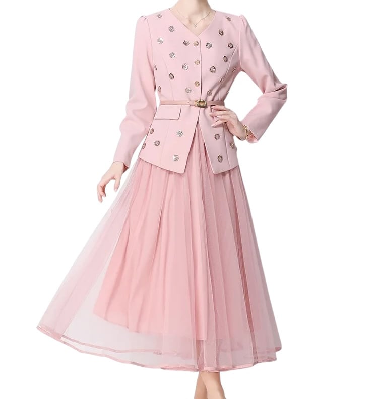 ■ディテール スカートセットアップ/チュールスカート/メタルフラワー/Vネックジャケット/パフスリーブ/ベルト