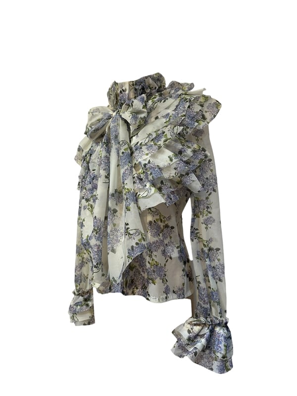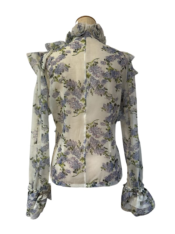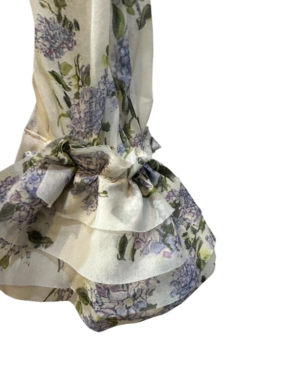 ■ディテール スタンドカラー/ラッフル/ティアード/コサージュ/シフォン/アジサイパターン