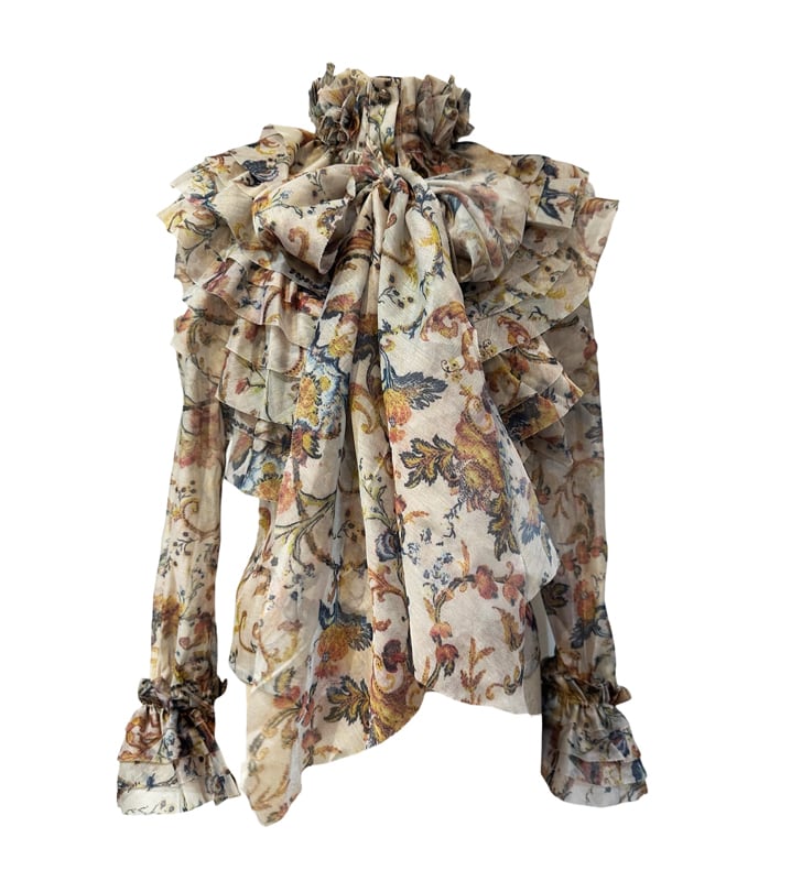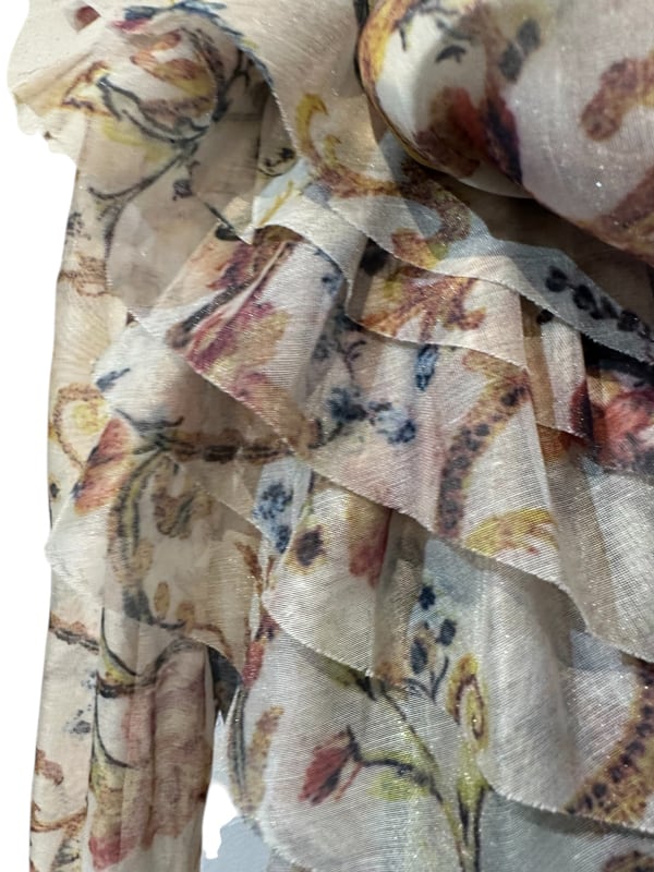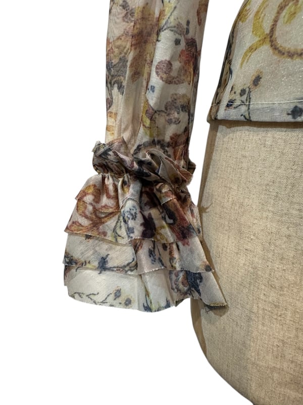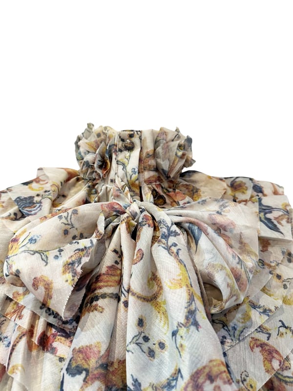 ■ディテール スタンドカラー/ラッフル/ティアード/コサージュ/シフォン/フラワーパターン/カットオフ