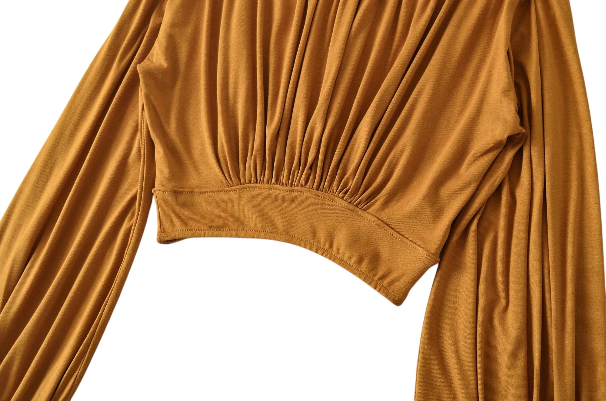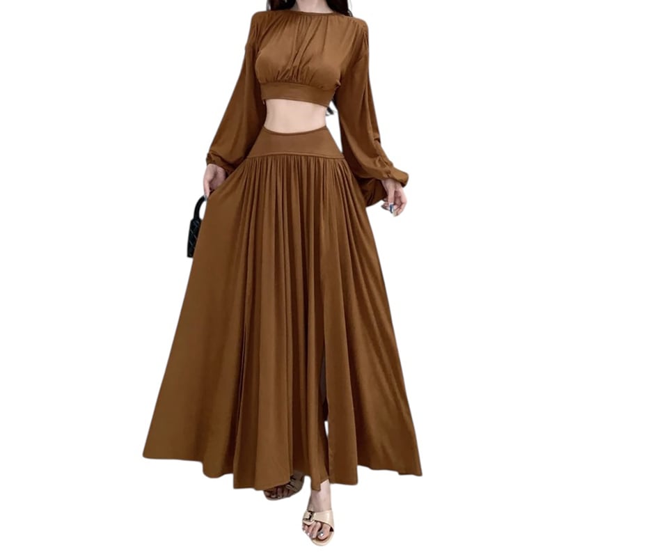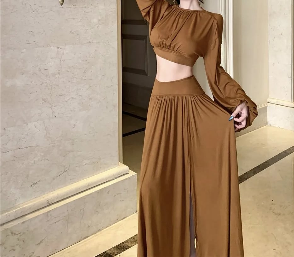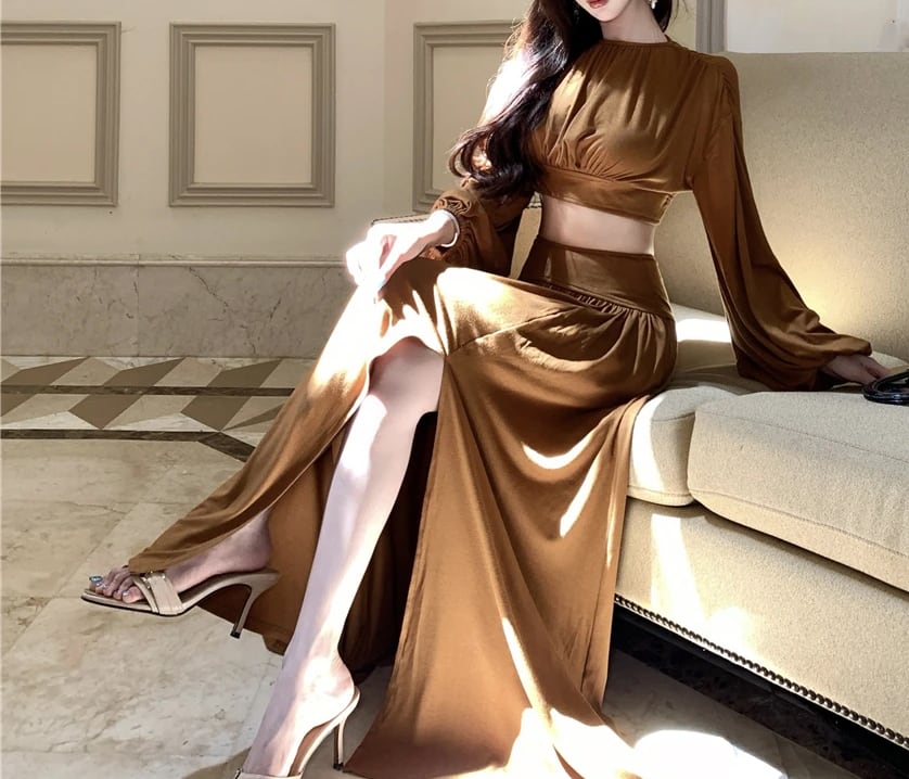 ■ディテール スカートセットアップ/レーヨンジャージー/クロップトップ/トップスクロージャー:サイドジッパー/スカートフロントスリット