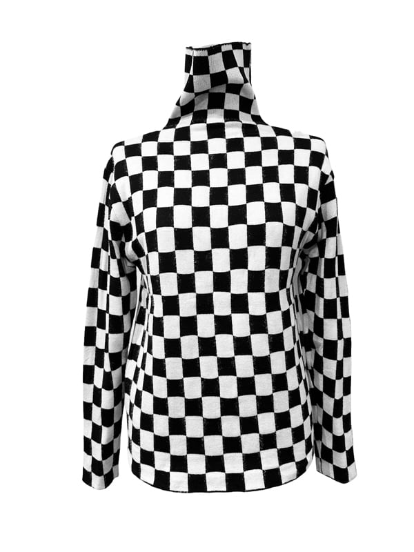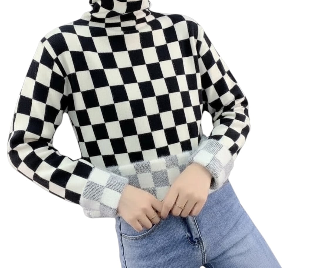 ■ディテール ストレッチニット/ハイネック/ソフトタッチ/ブロックチェック/厚手