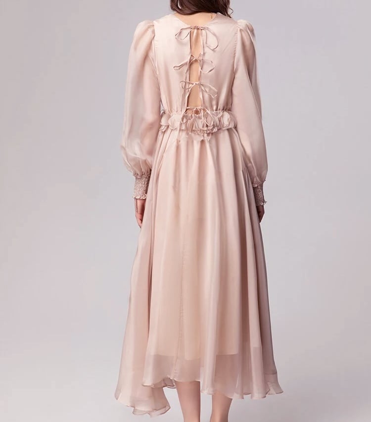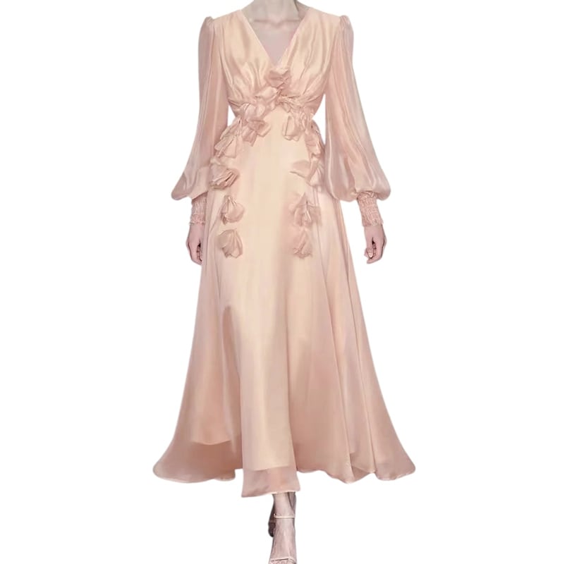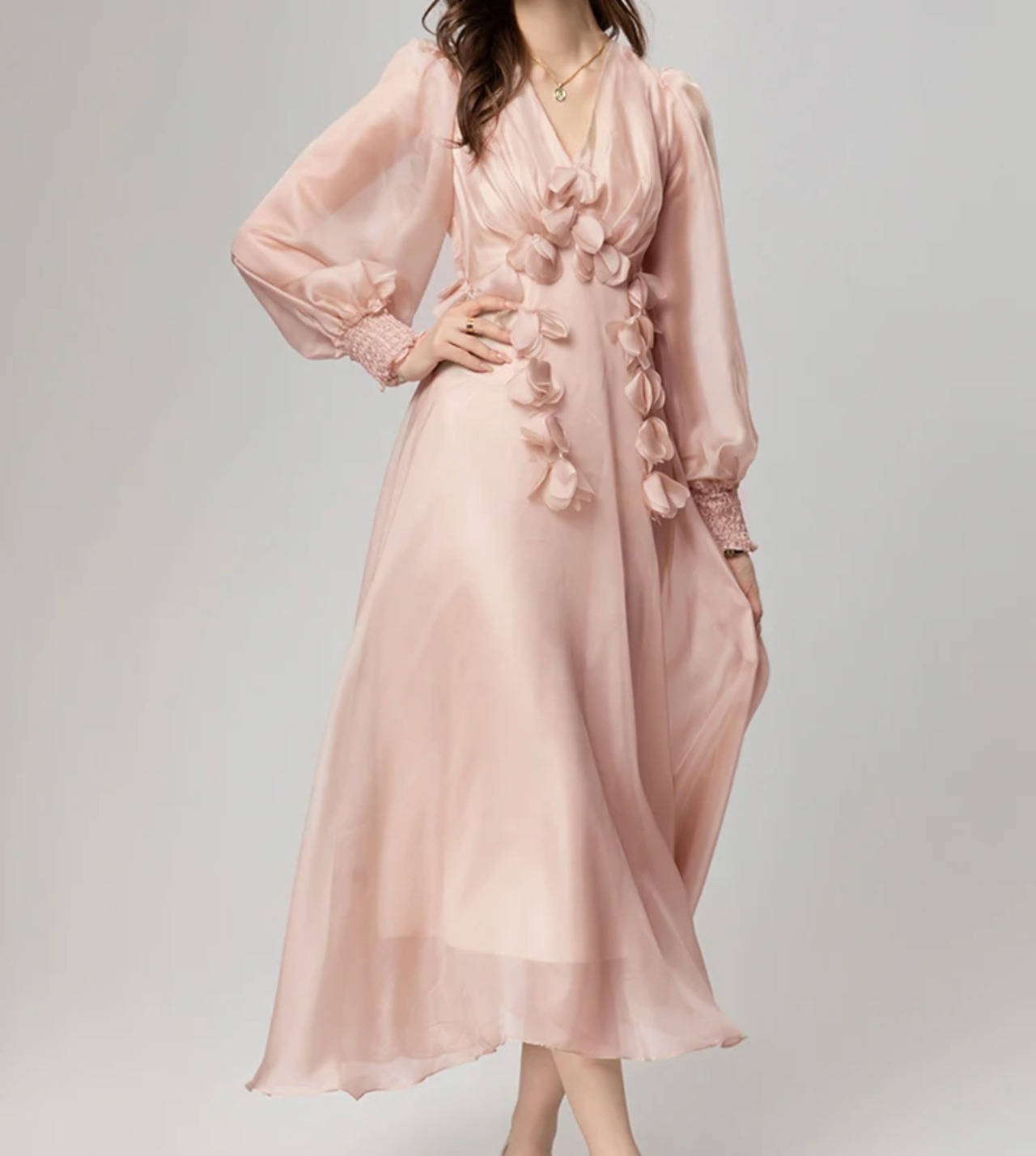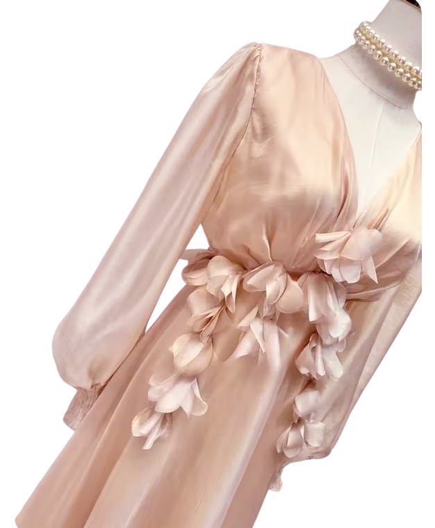 ■ディテール シフォン/パフスリーブ/花びらモチーフ/Vネック/ウエストゴムのギャザー/プルオーバー/裏地あり
