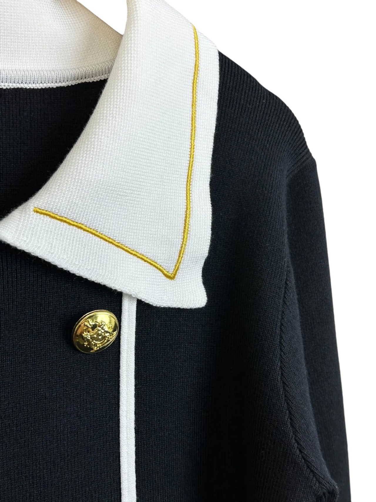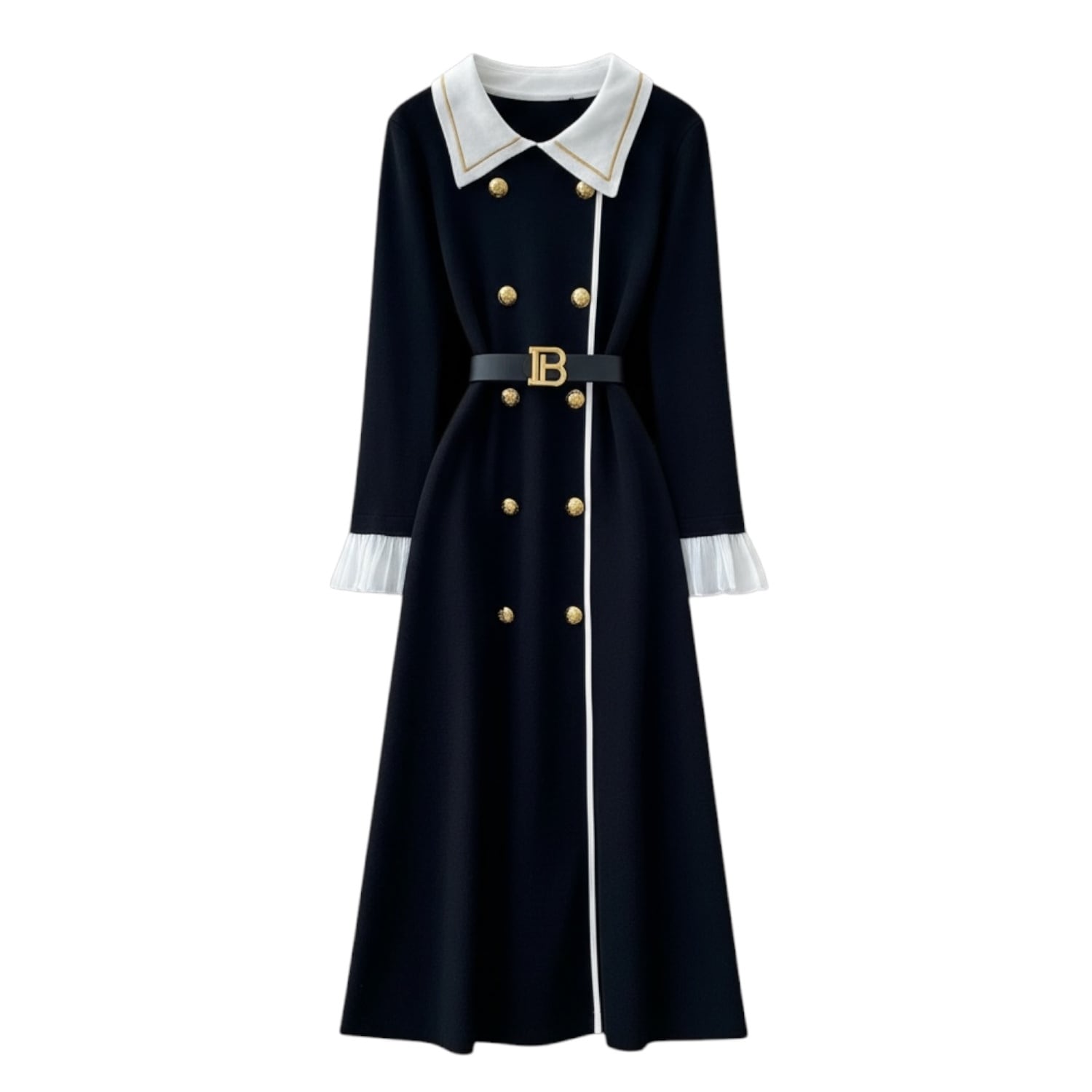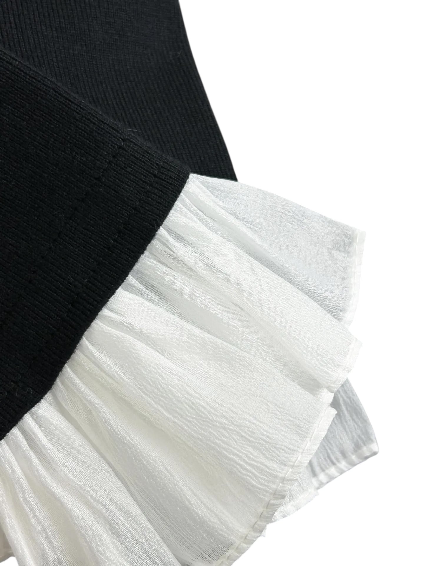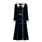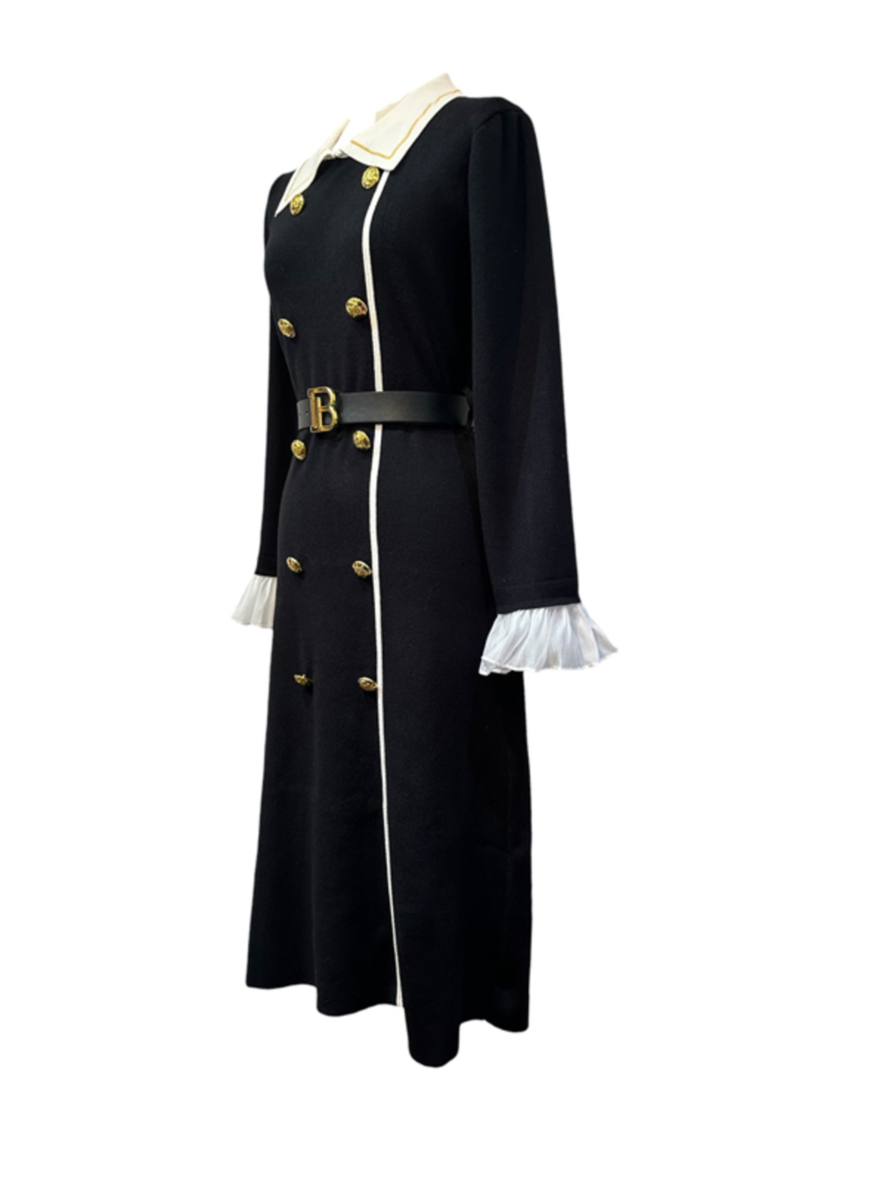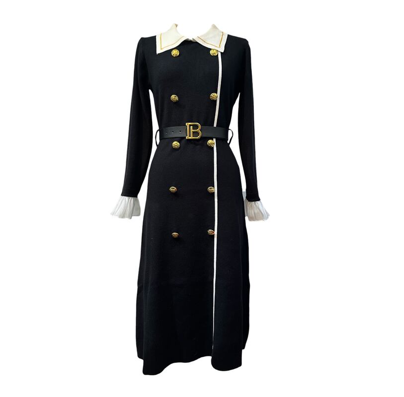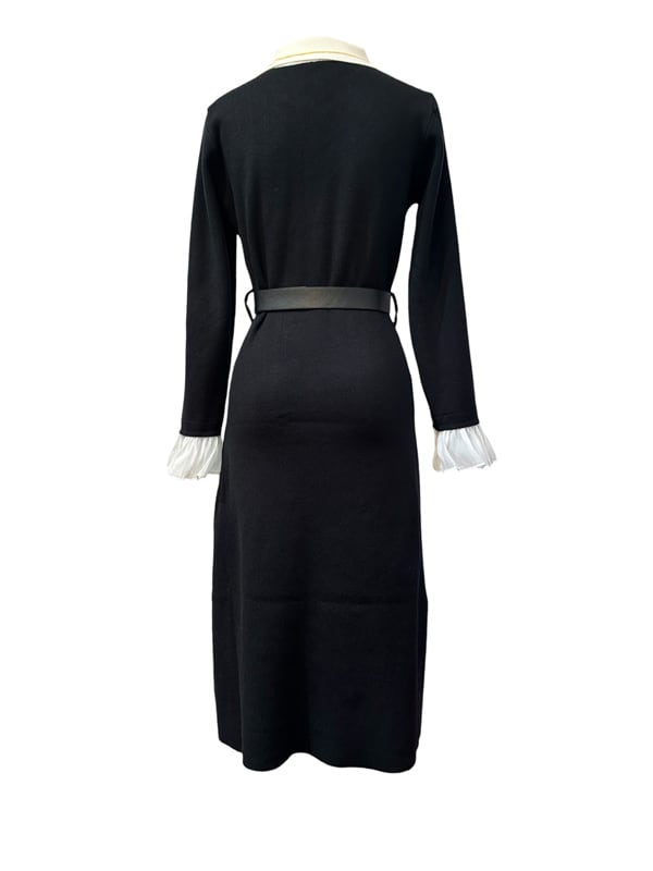 ■ディテール ニットドレス/シフォンの袖口/ベルト/クラシックカラー/ストレッチ