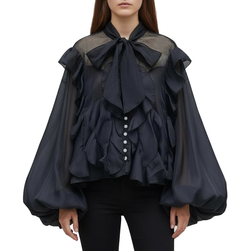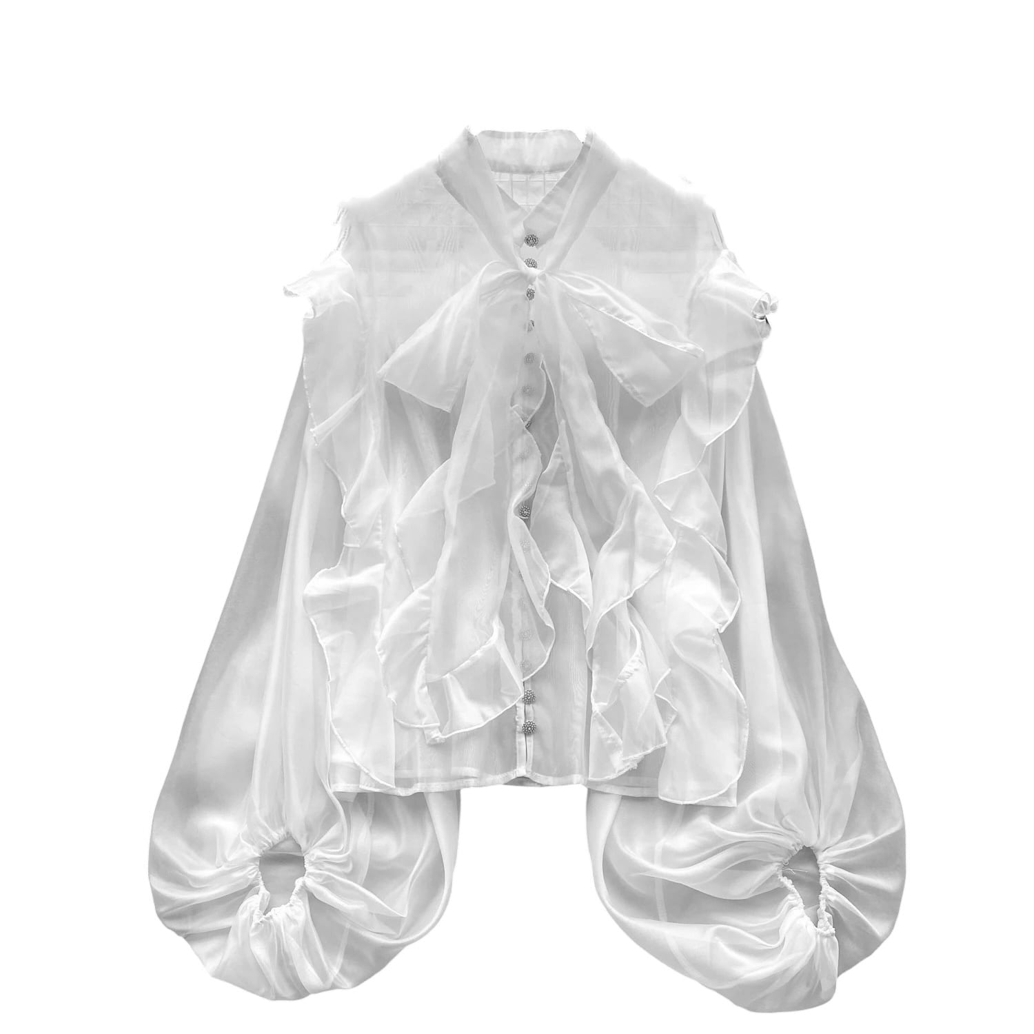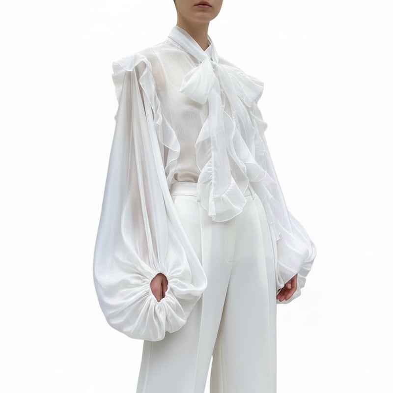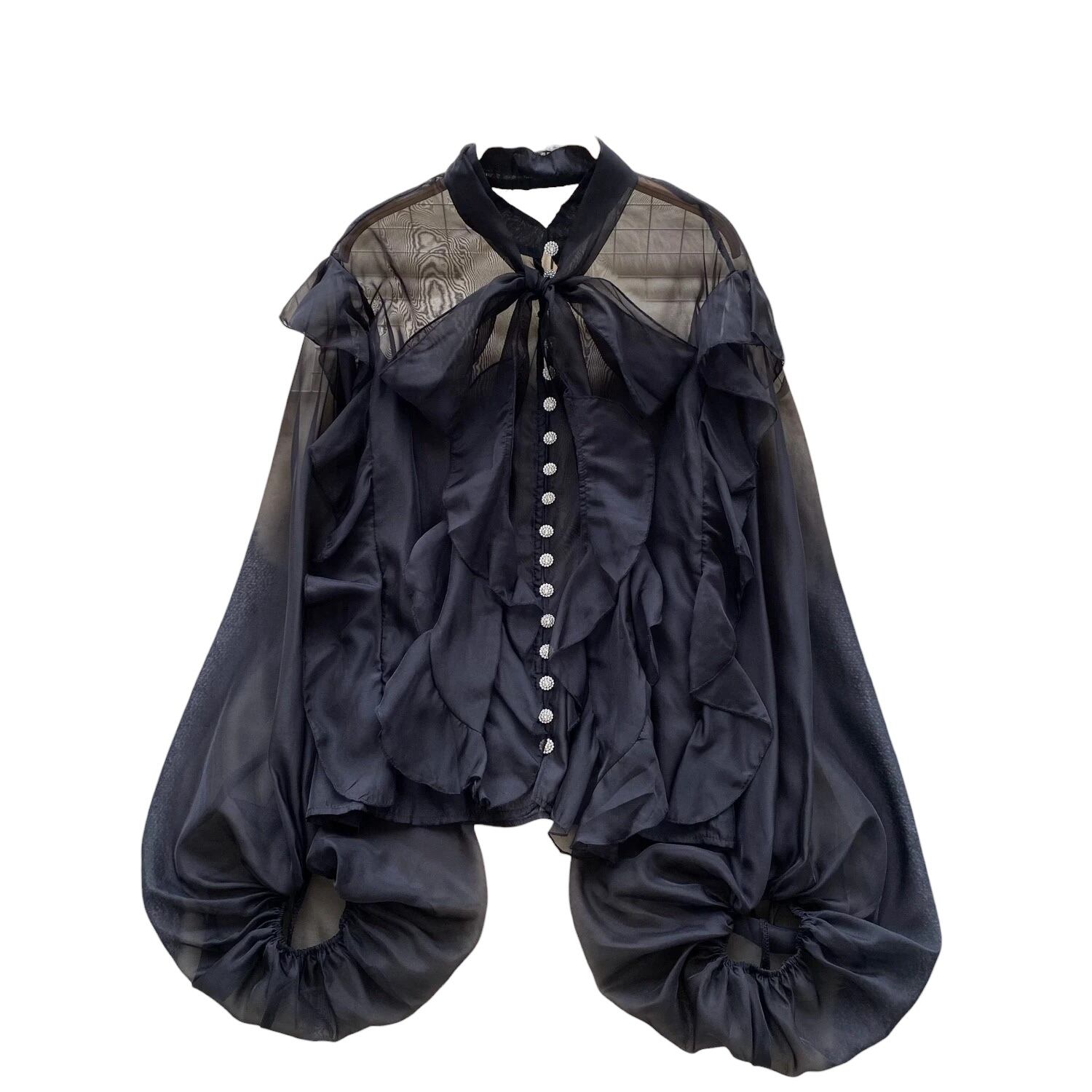 ■ディテール シフォン/チャイニーズカラー/ワイドフィット/ボリュームスリーブ/ボウタイ(取り外し可能)/ビジューボタン