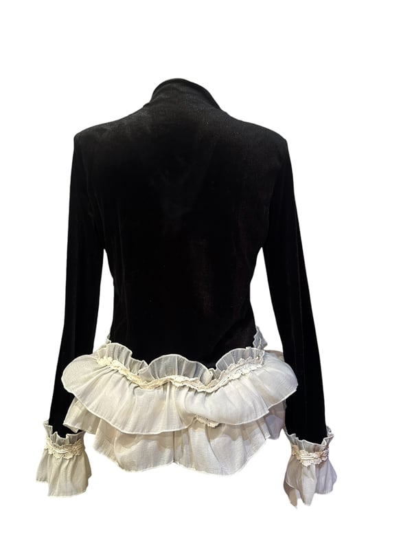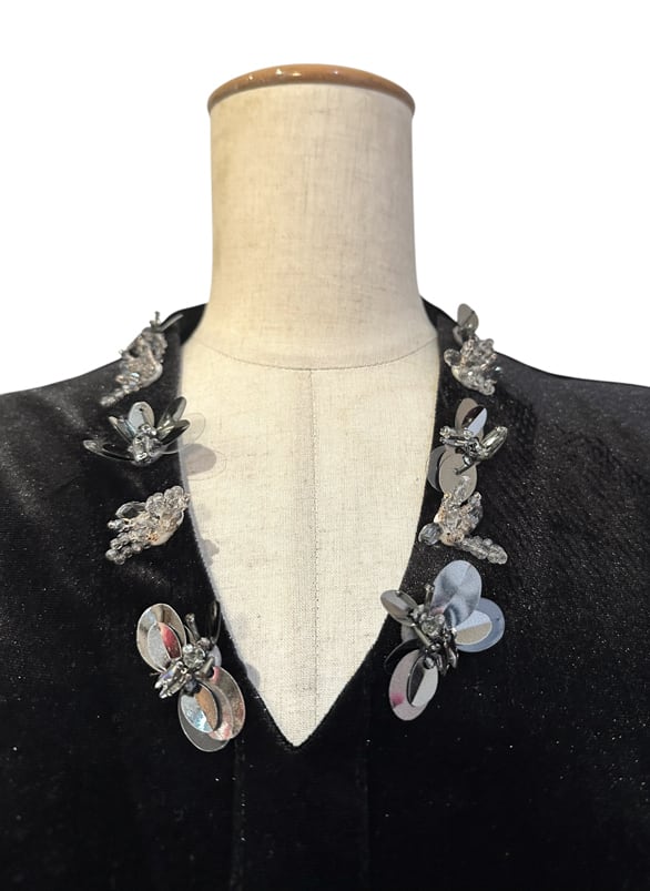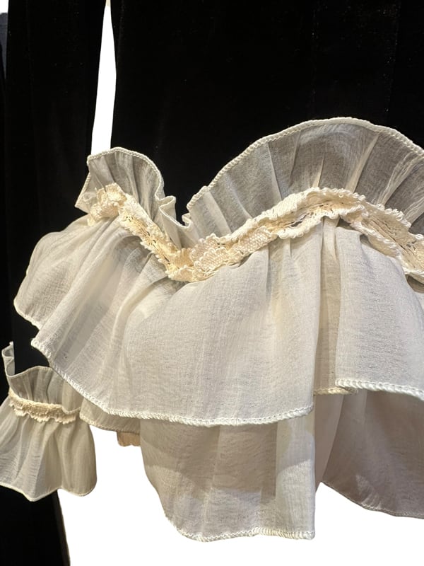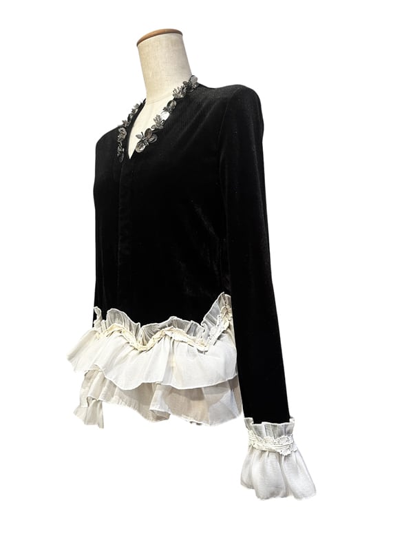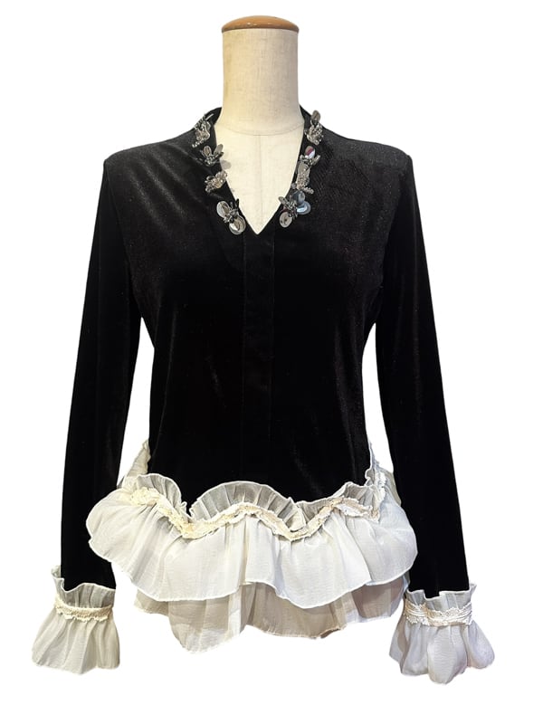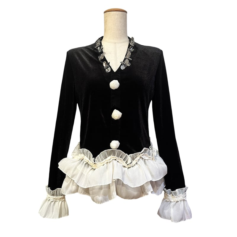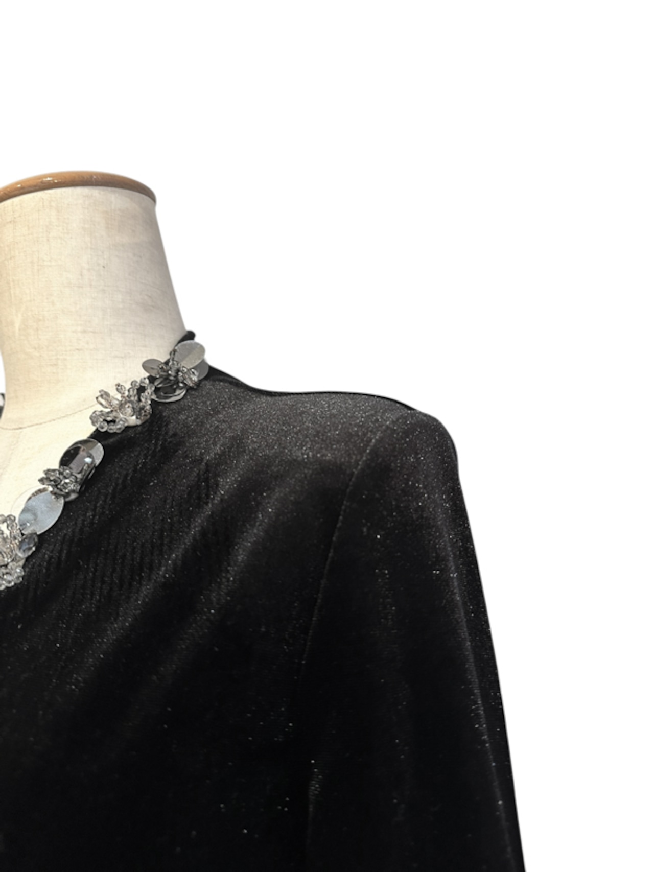 ■ディテール ソフトベルベット/Vネック/ビジュー/レーストリム/ティアード/プルオーバー/ローズコサージュは取り外し可能