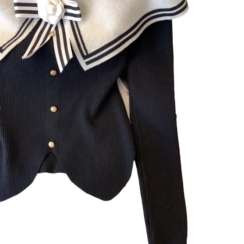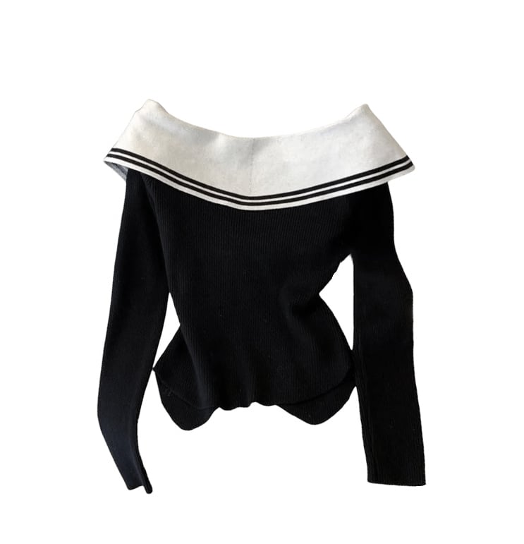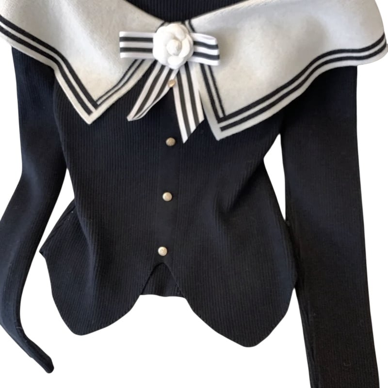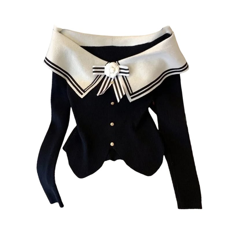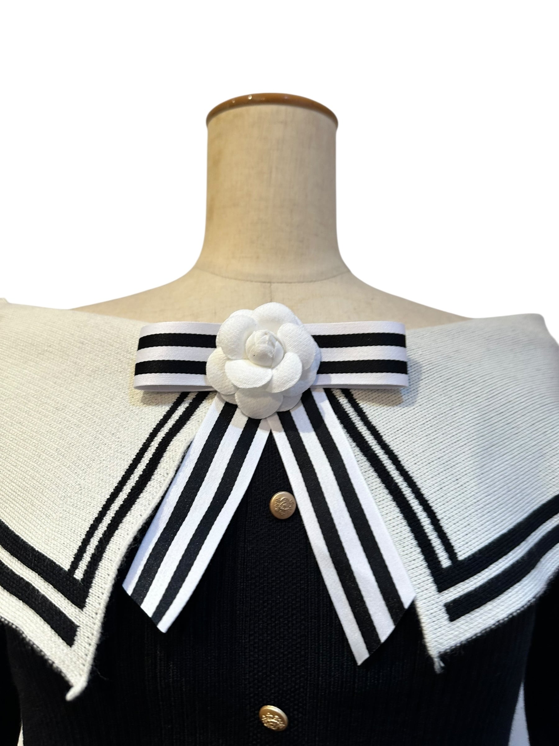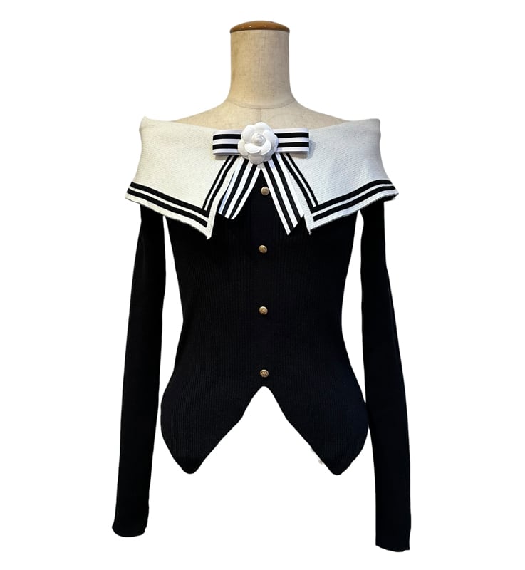 ■ディテール リブニット/ボートネック/ベルスリーブ/プルオーバー/カメリアコサージュのブローチ