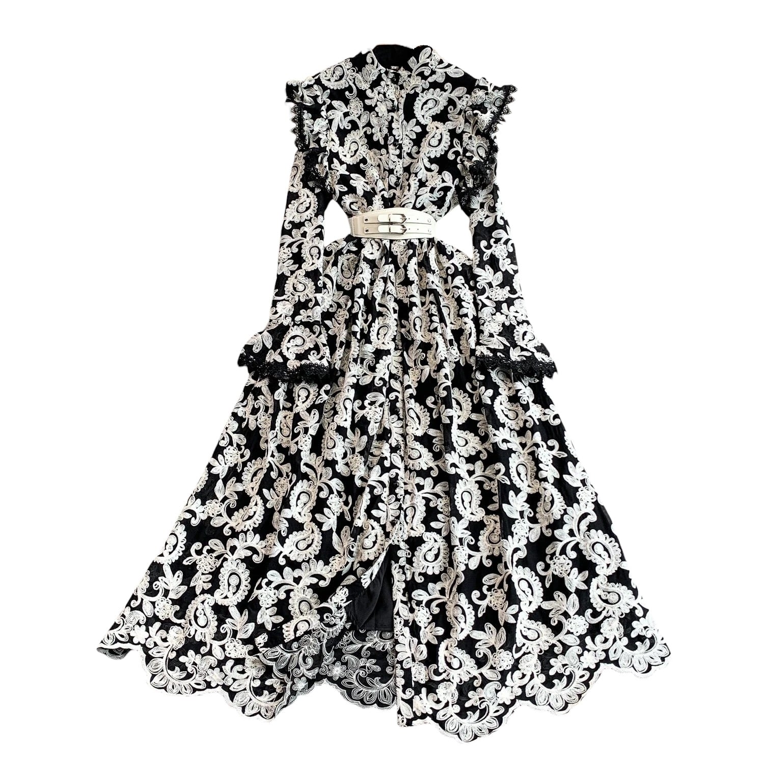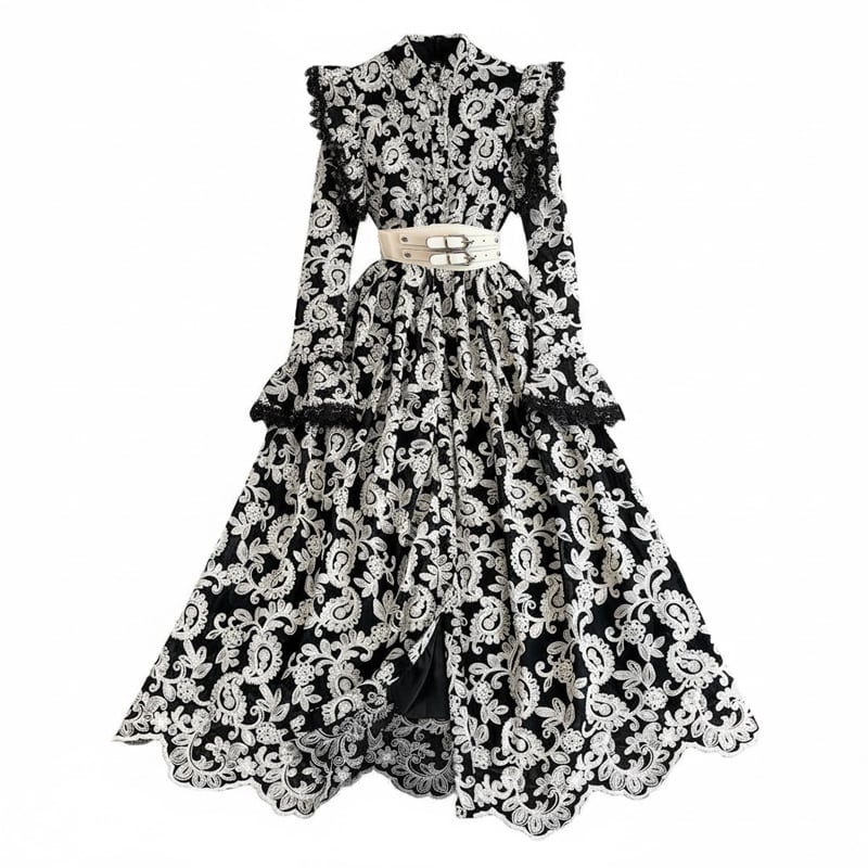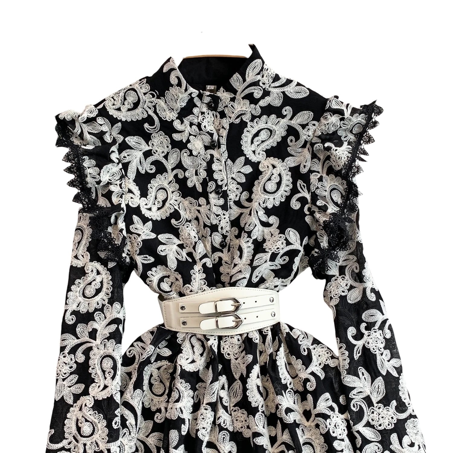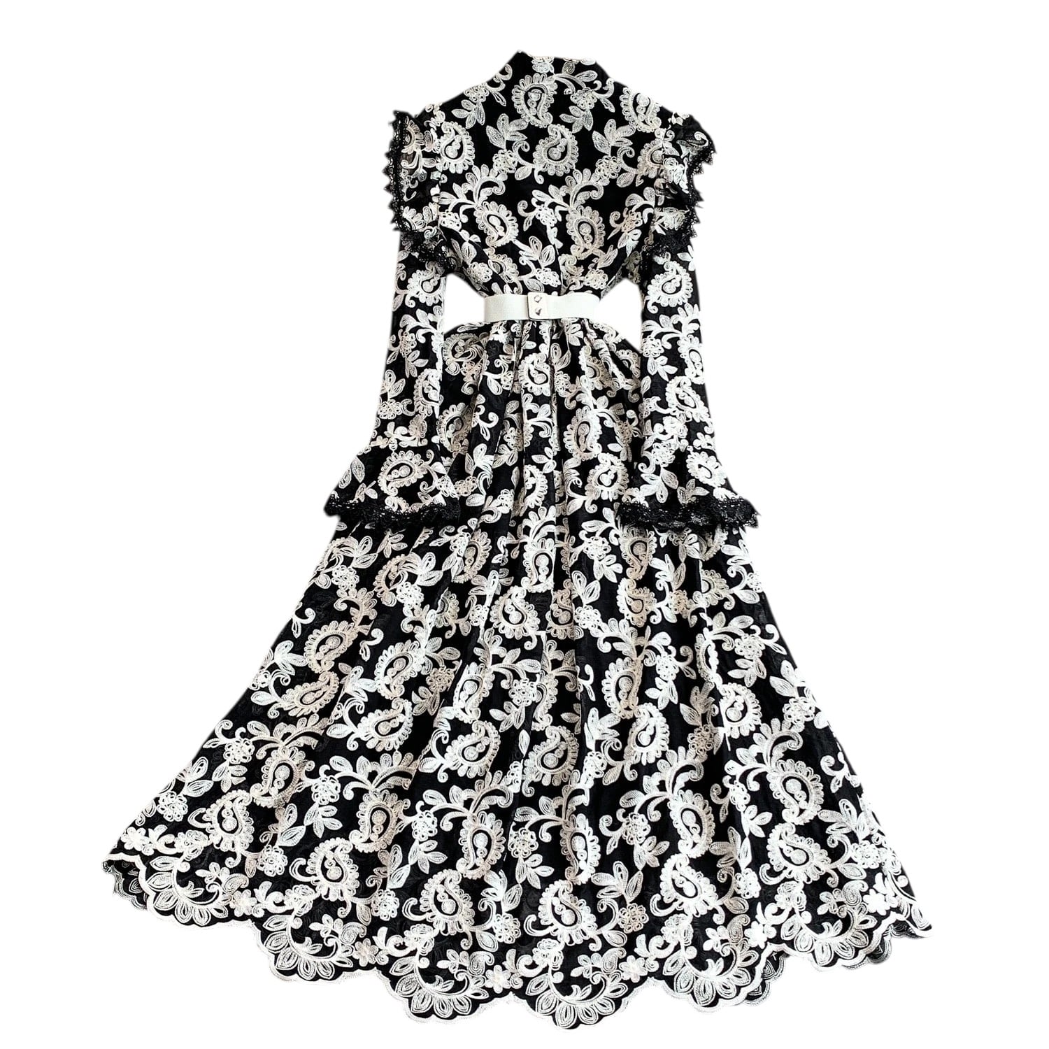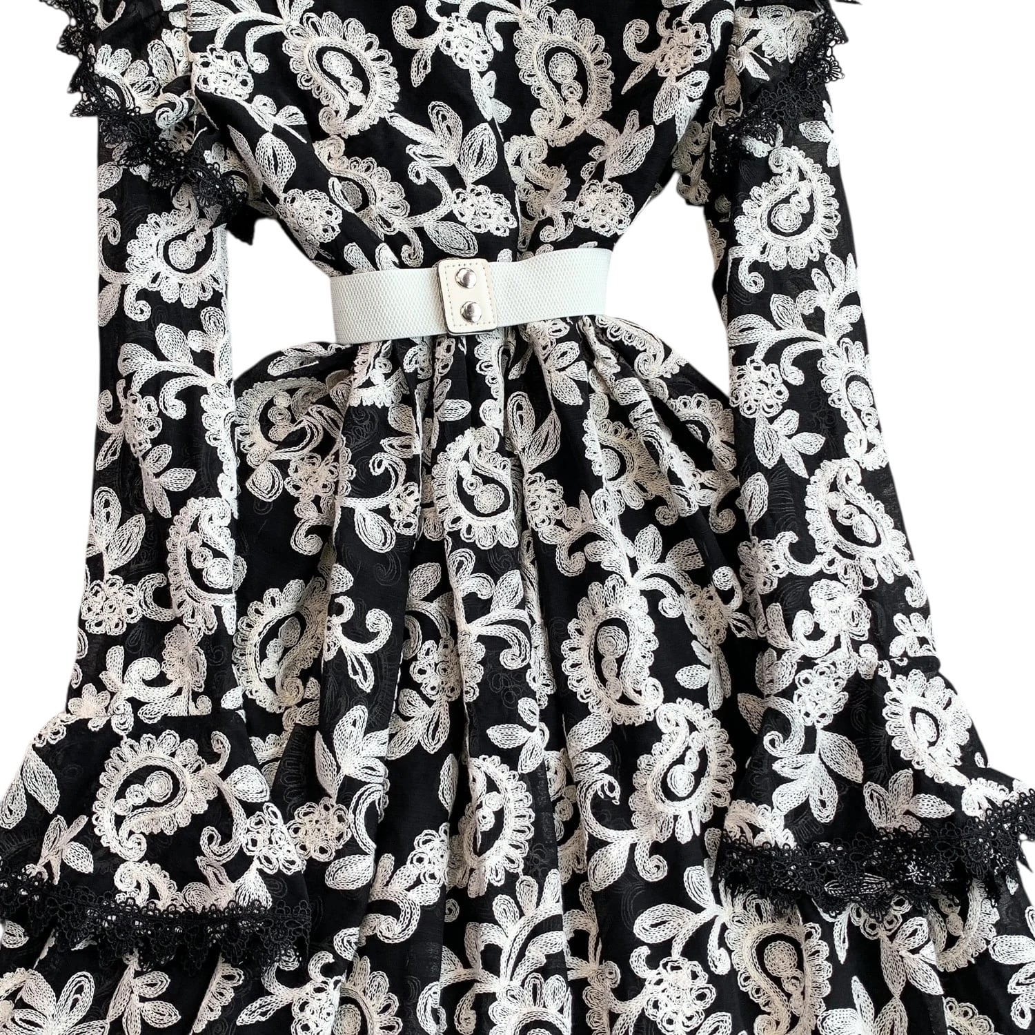 ■ディテール ペイズリー/エンブロイダリー/スタンドカラー/ベルスリーブ/スカラップヘム/ベルト