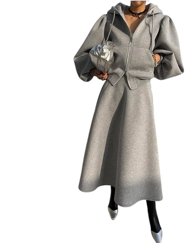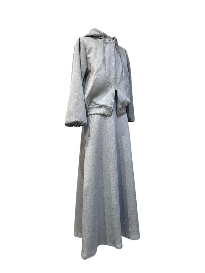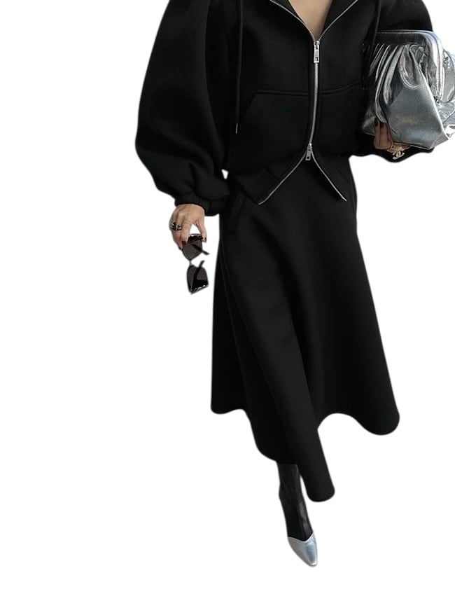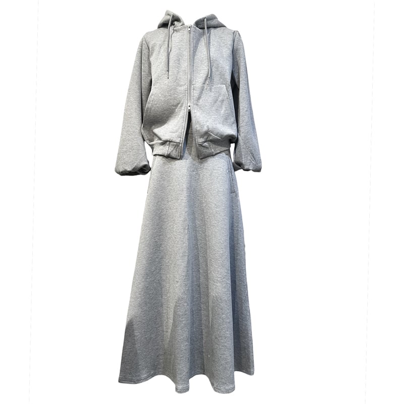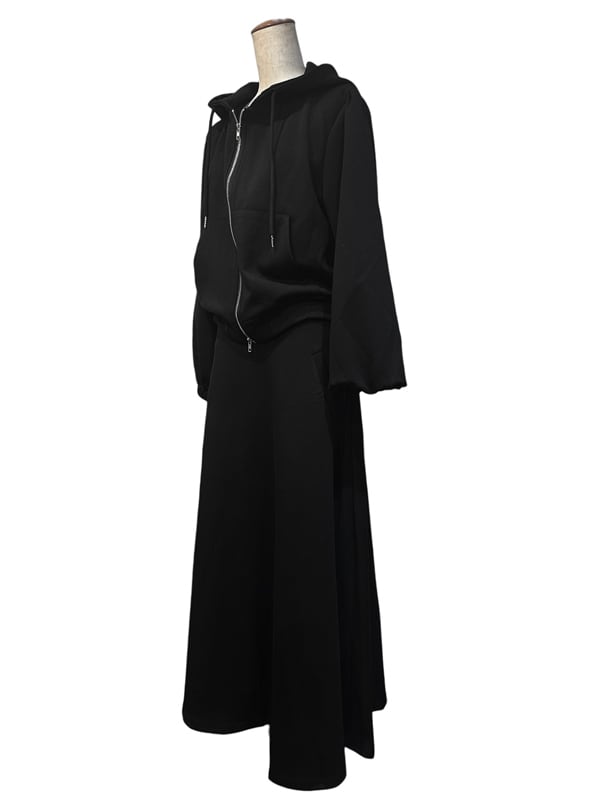 ■ディテール スウェット/スカートセットアップ/ソフトタッチ/フーディ/Wジッパー/パフスリーブ/ロングスカート/フレアシルエット/スカートクロージャー:サイドジッパー