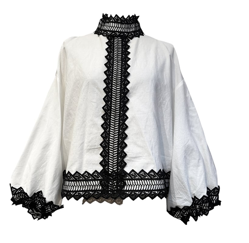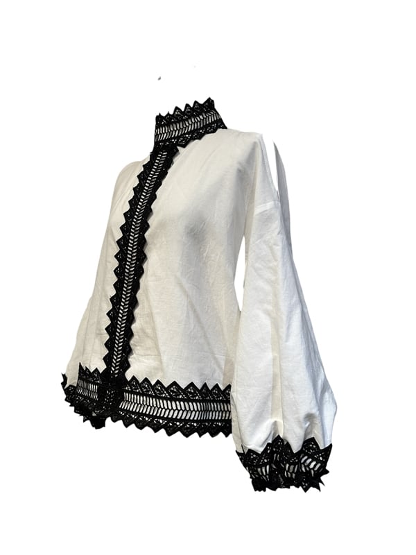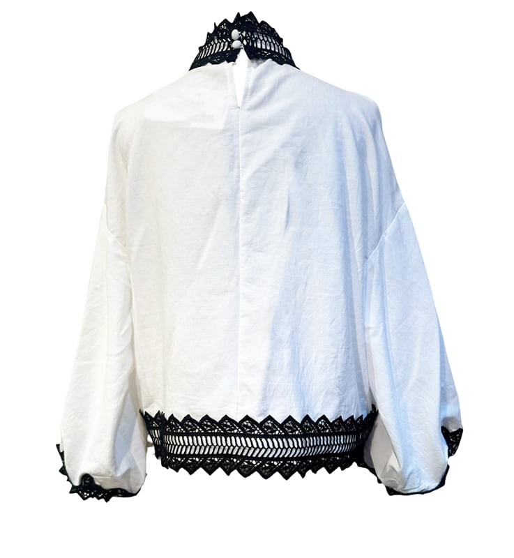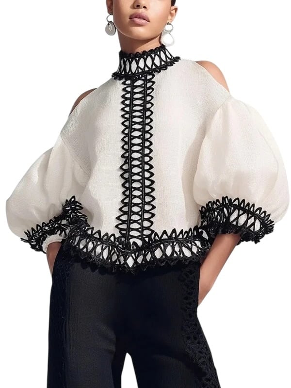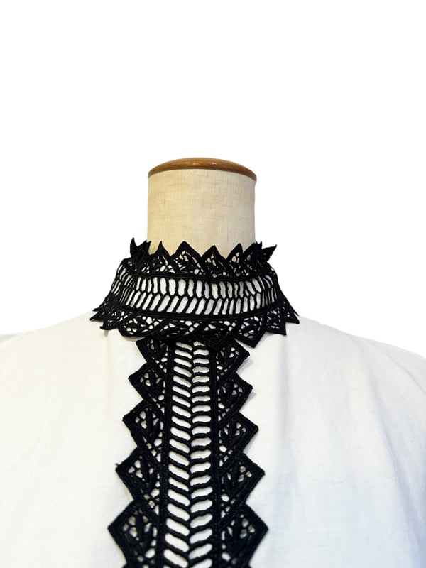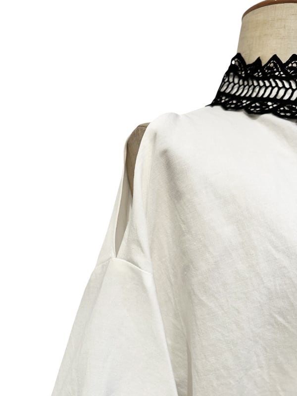 ■ディテール クロス/エンブロイダリー/スタンドカラー/オープンショルダー/バックジッパー/袖口ゴムのギャザー