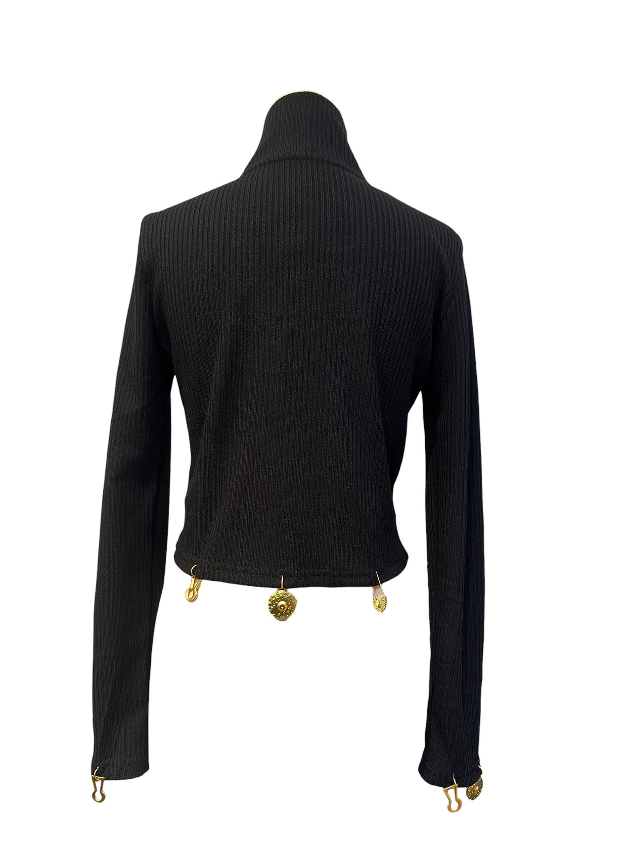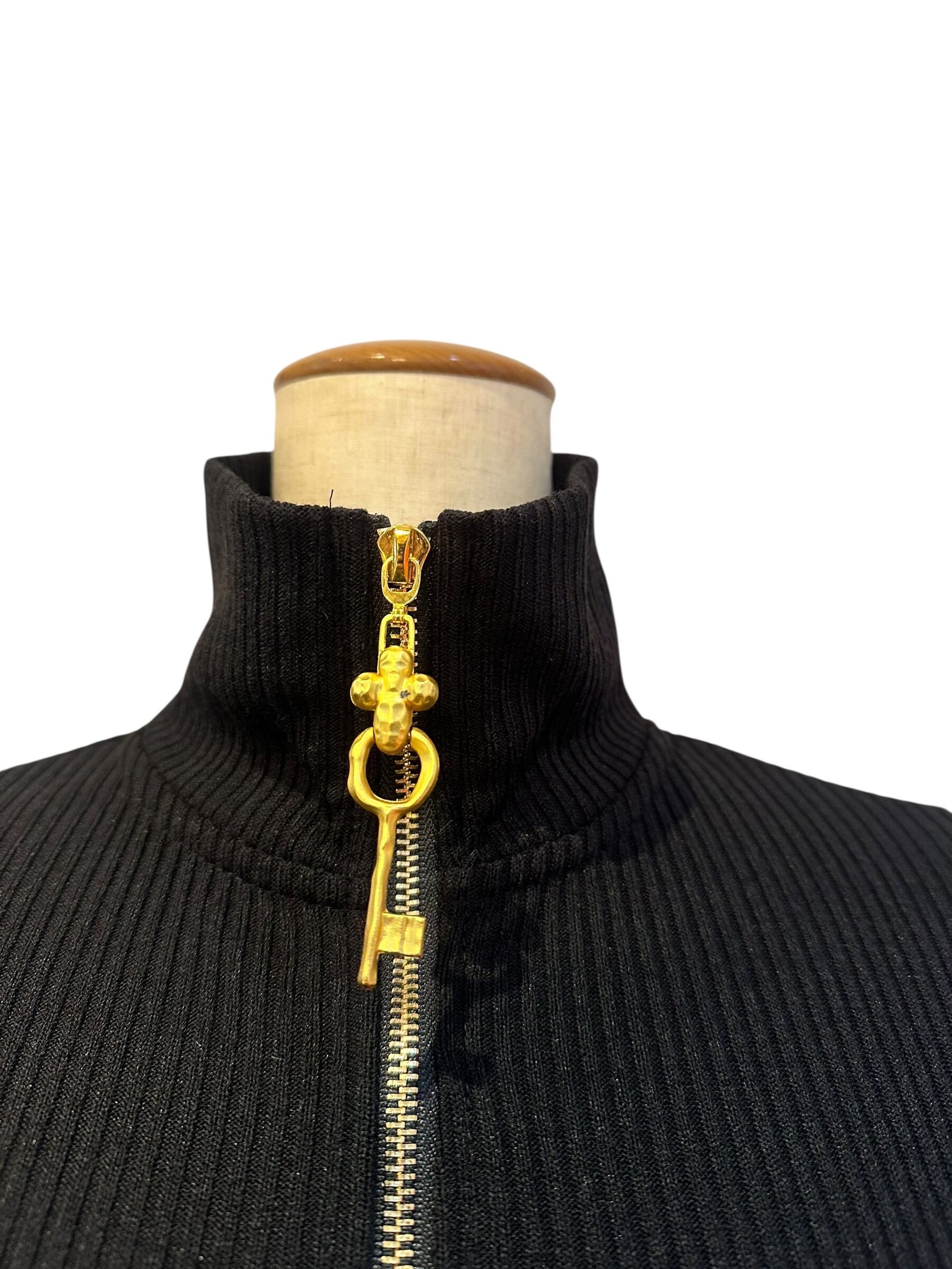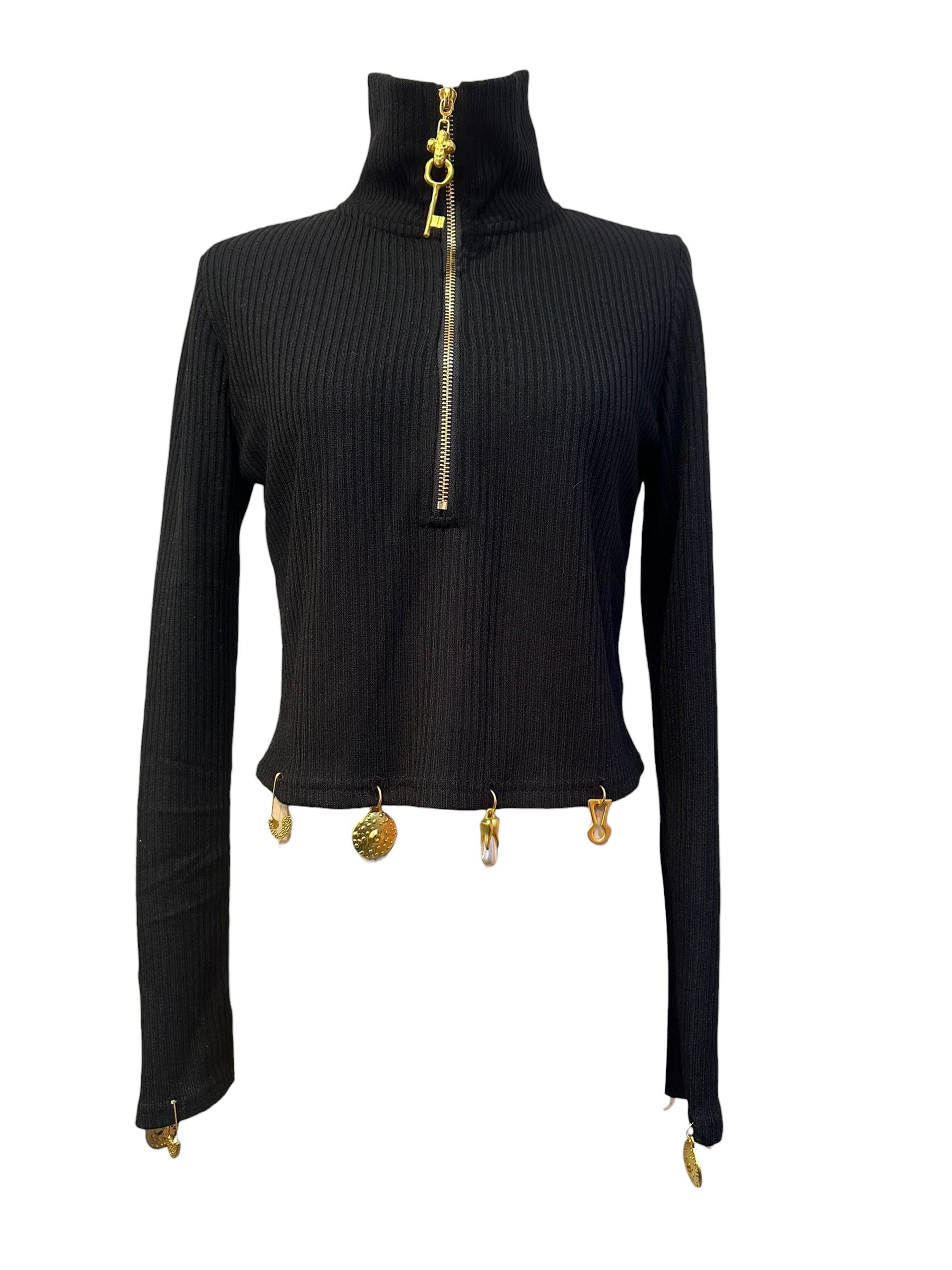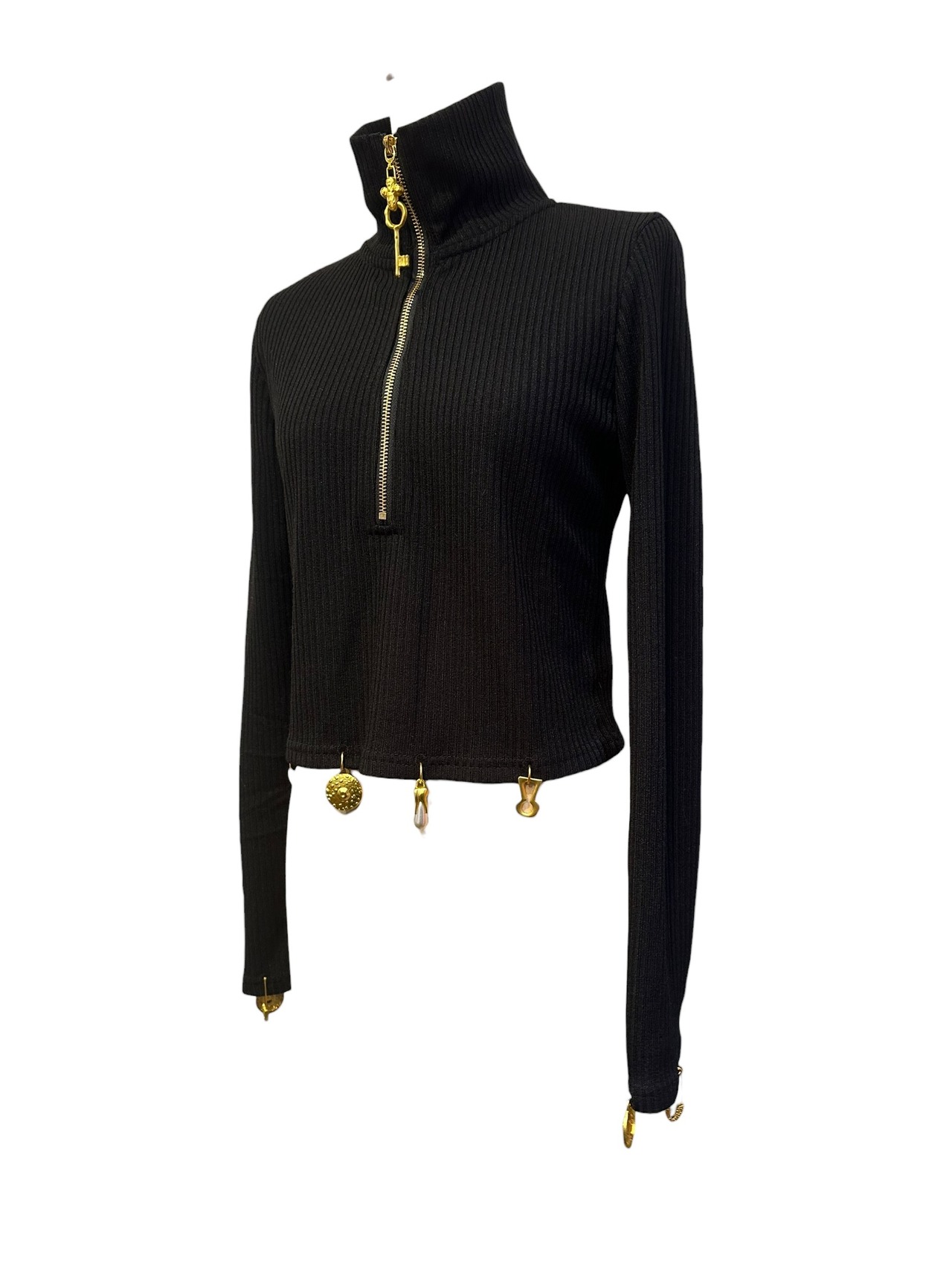 ■ディテール リブカットソー/スタンドカラー/ジッパー/メタルチャーム/ストレッチ