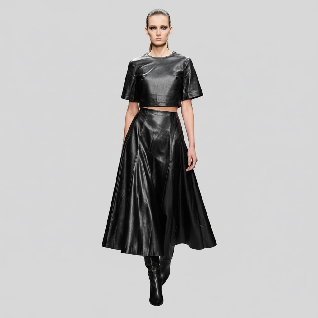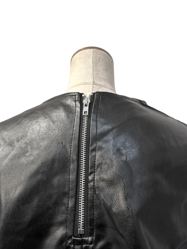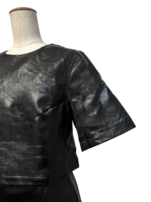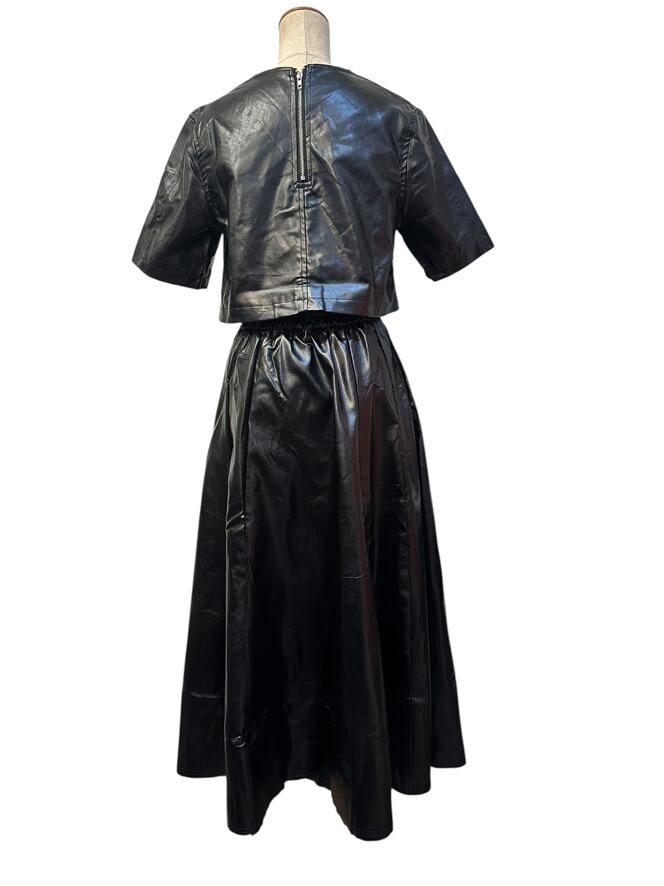 ■ディテール エコレザー/スカートセットアップ/半袖トップス/トップス丈短め/クルーネック/フジッパー/レアスカート/ウエスト後ろゴムのギャザー