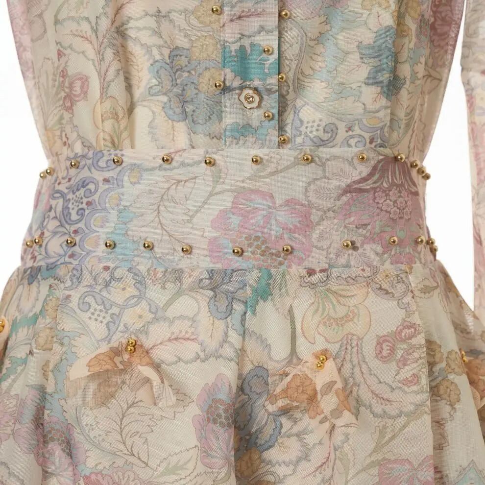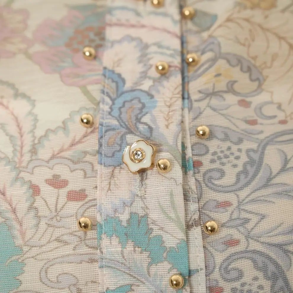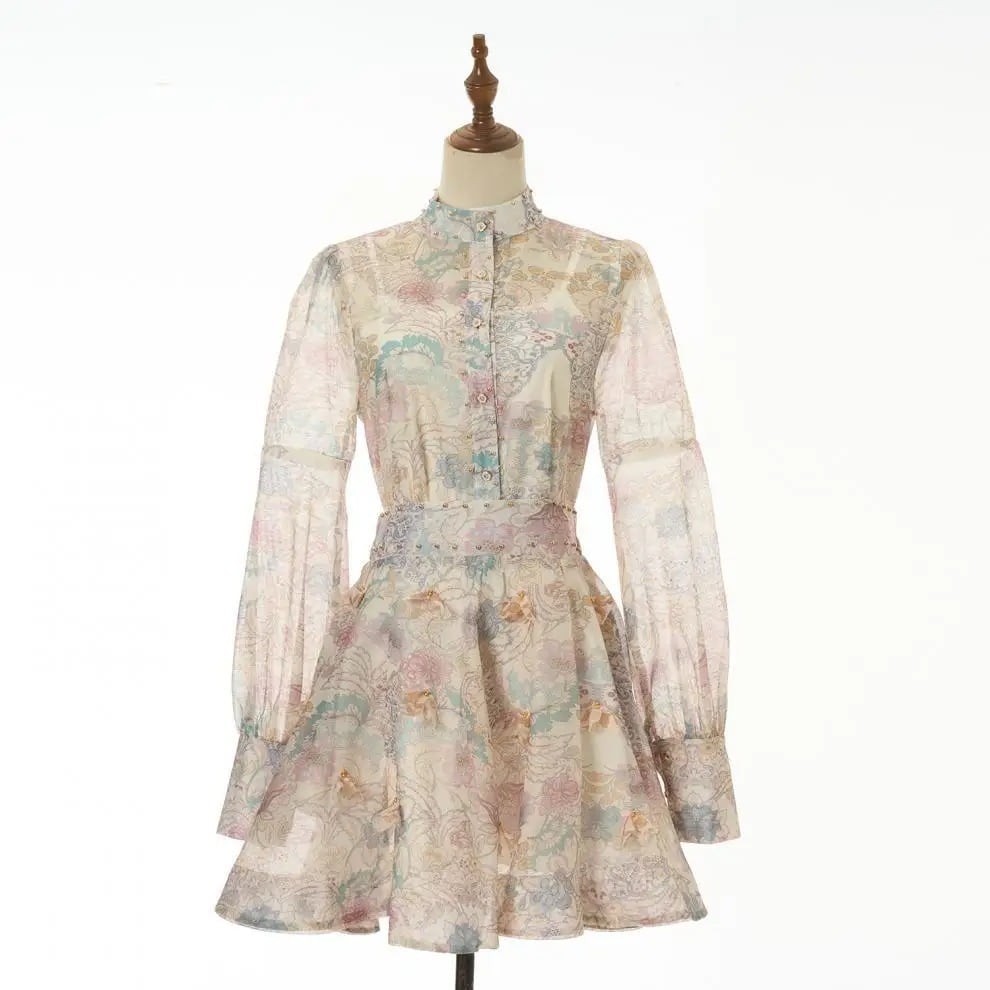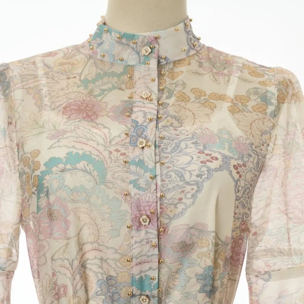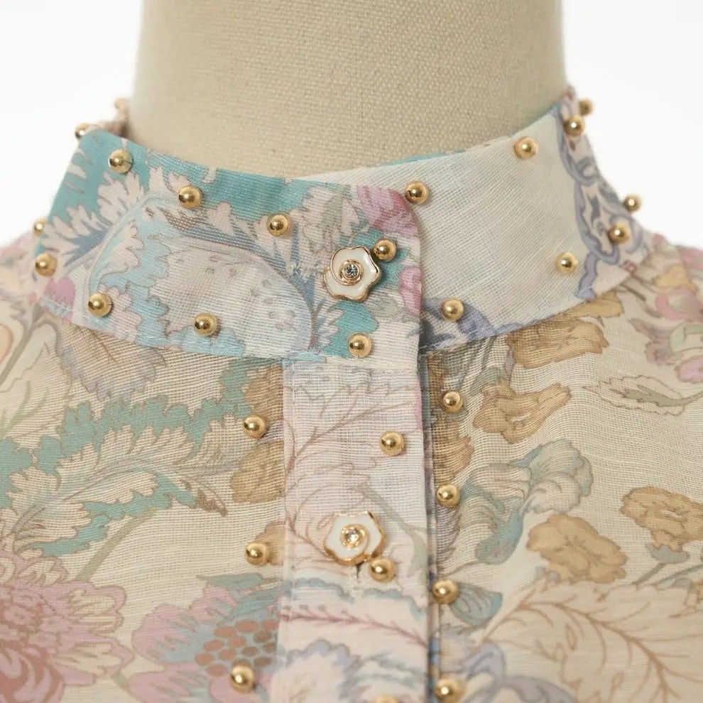 ■ディテール スカートセットアップ/チャイニーズカラー/スタッズトリム/フラワーボタン/フレアスカート/ジッパー/インナーキャミソール