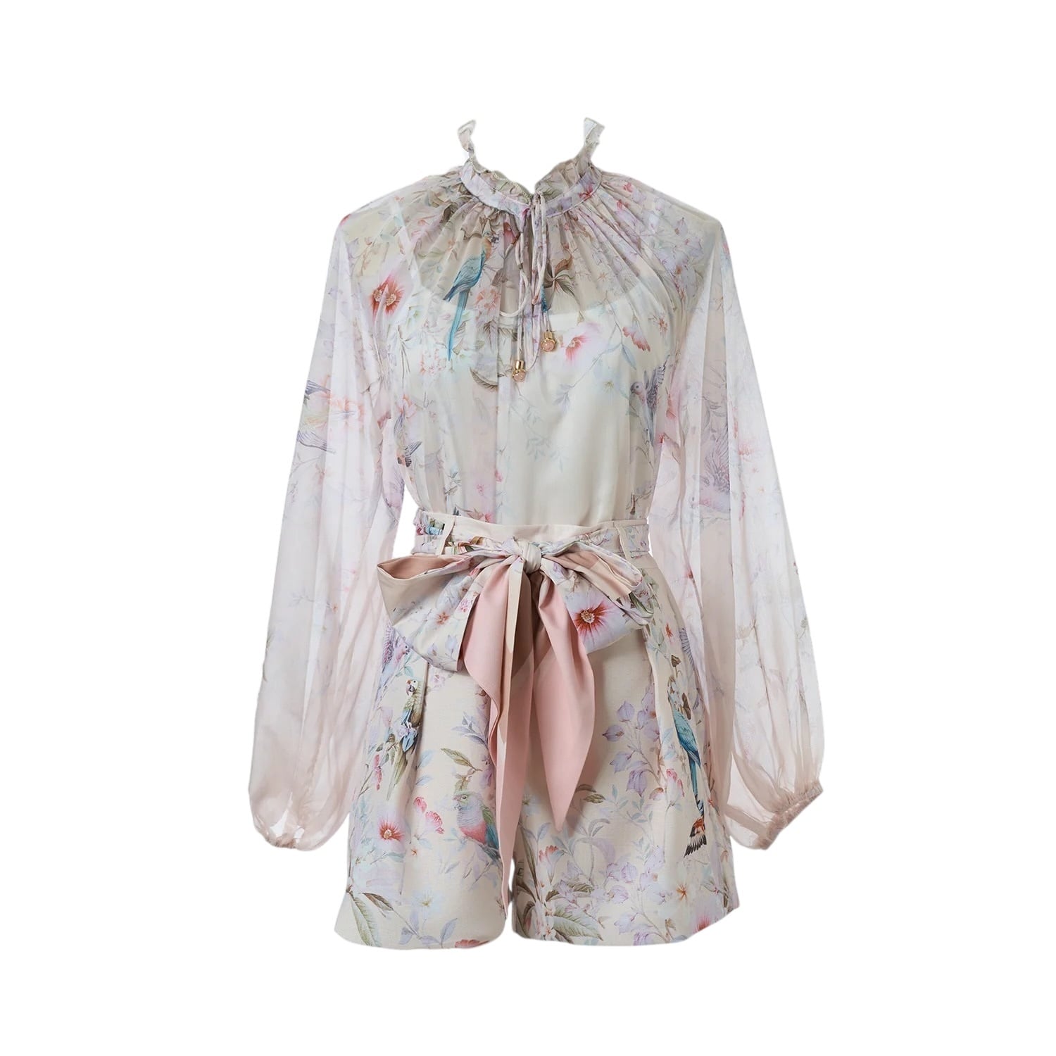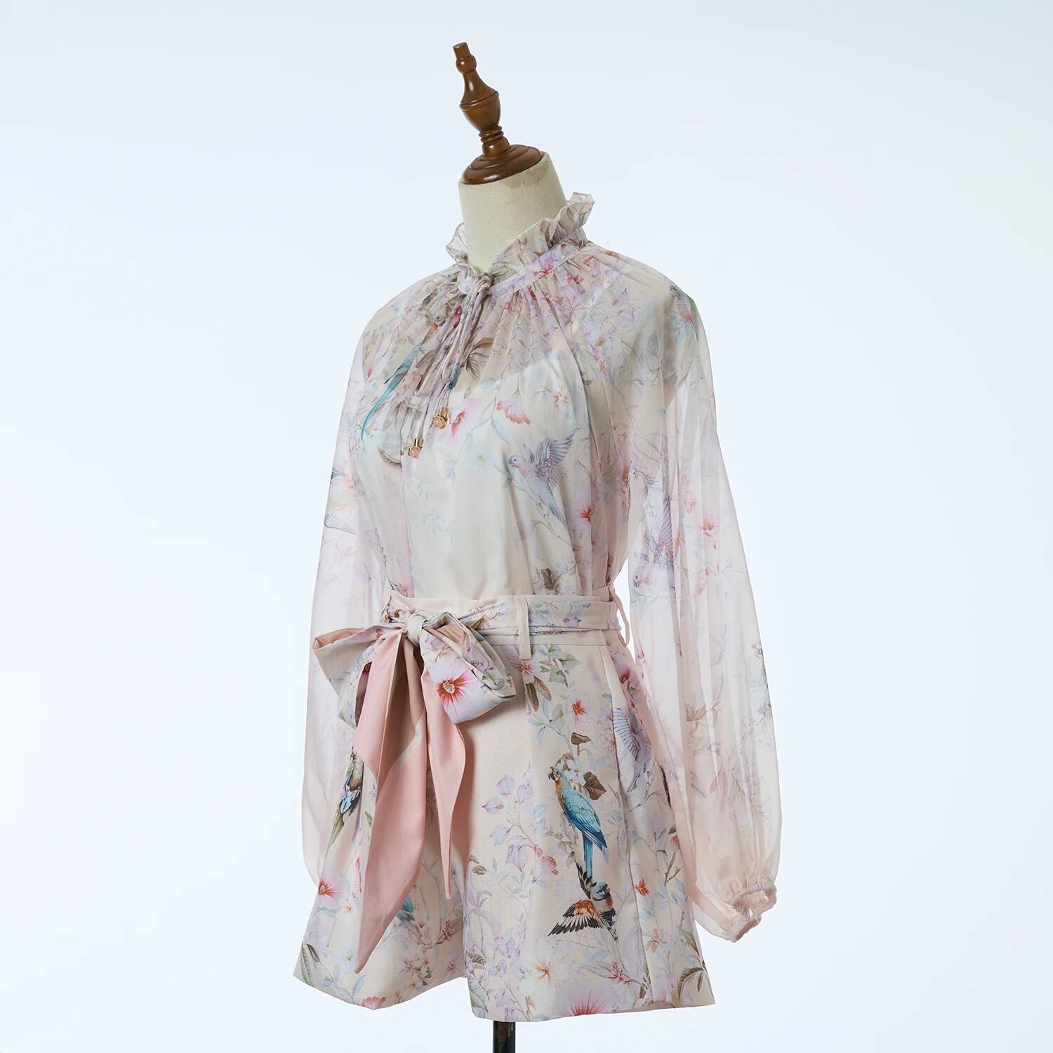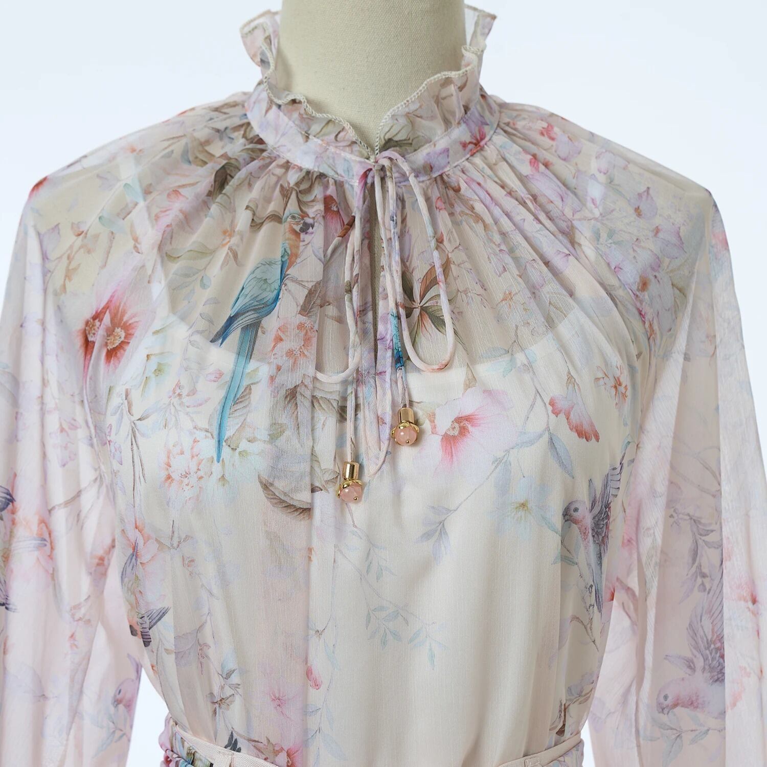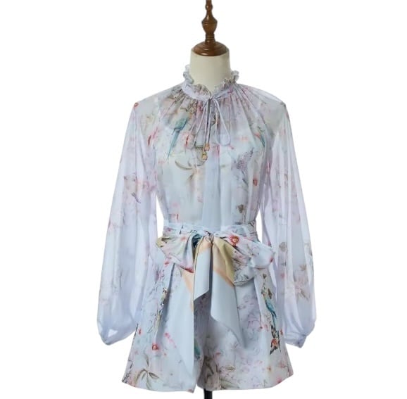 ■ディテール シフォン/Floral・Birdパターン/インナーキャミソール/フリルカラー/プルオーバー/ラグランスリーブ