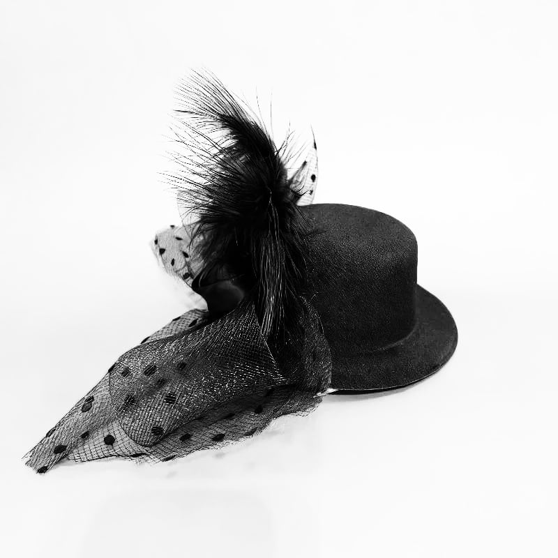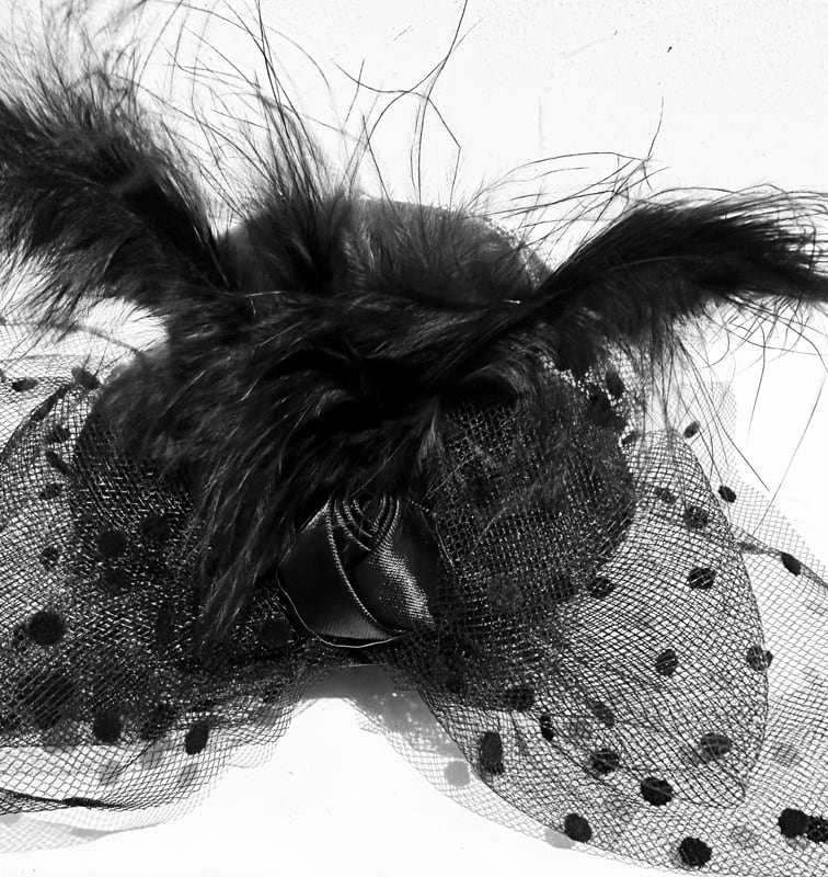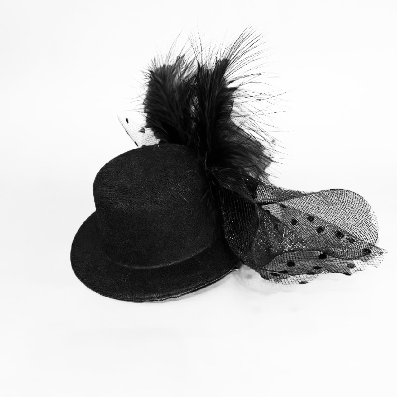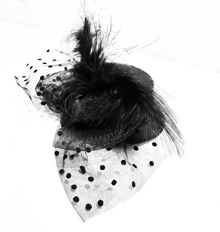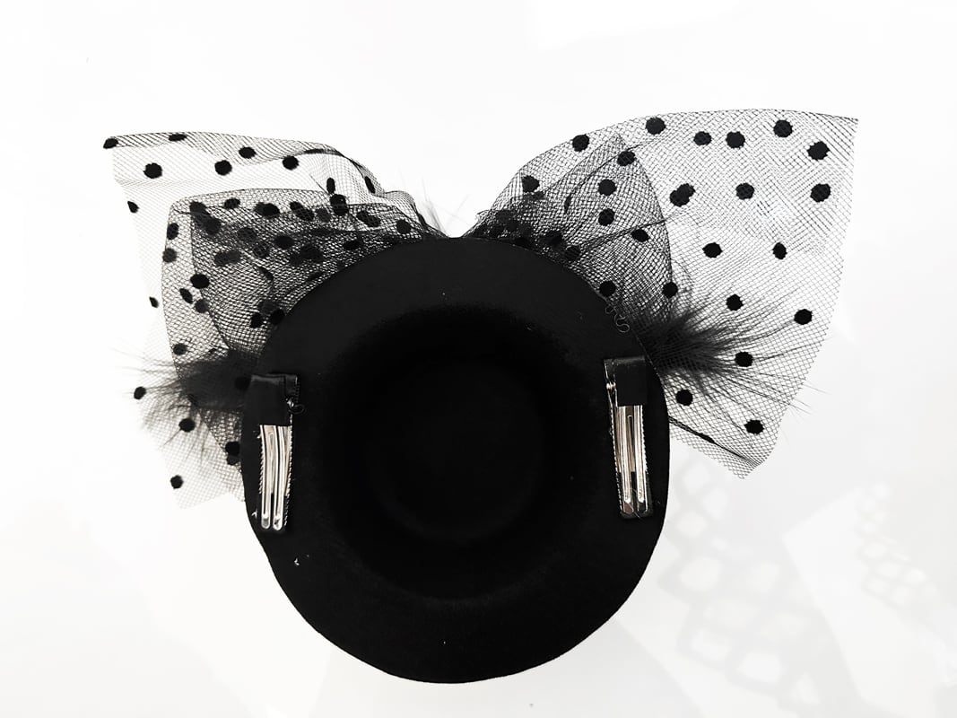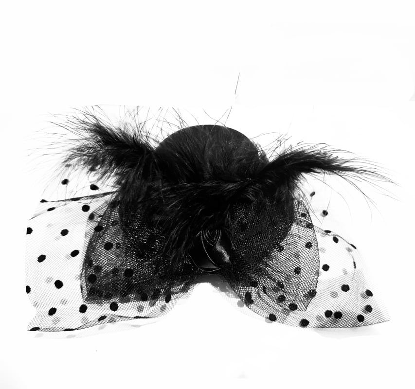 ■ディテール ヘッドドレス/ファシネーター/内側にクリップ/ドットチュール/ミニハット/サテンコサージュ/フェザー