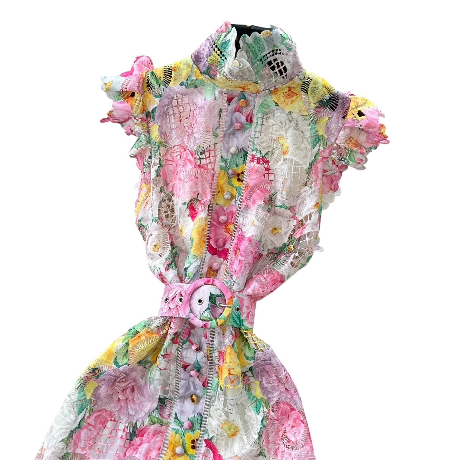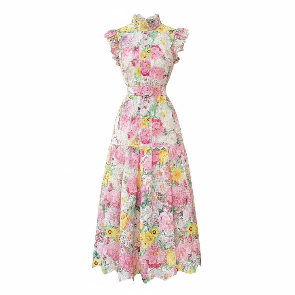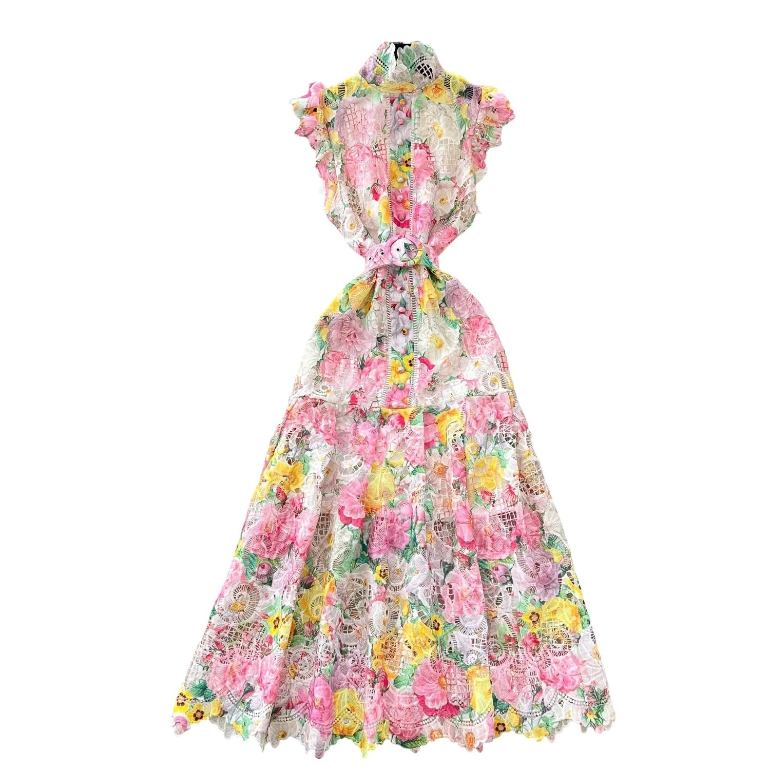 ■ディテール カットアウト/レース/チャイニーズカラー/ラッフルショルダー/ベルト/フルレングスの裏地あり