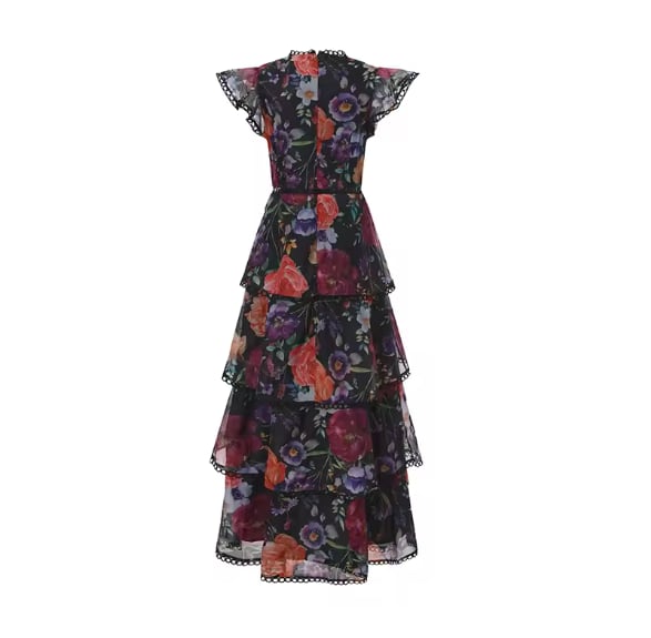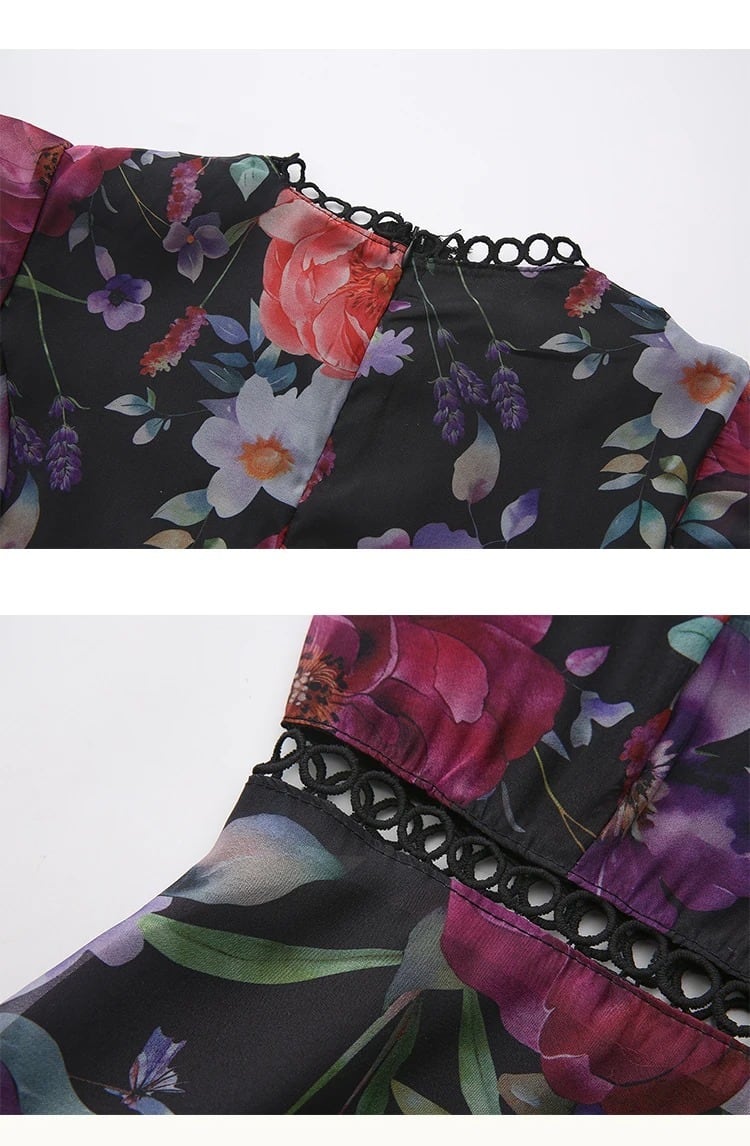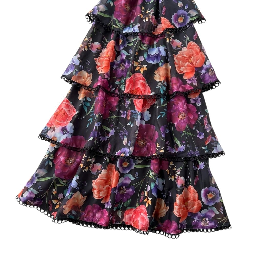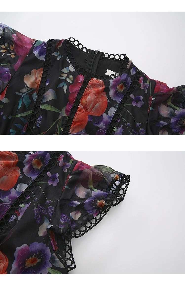 ■ディテール メタリックシフォン/フラワーパターン/ティアード/レーストリム/ジッパー