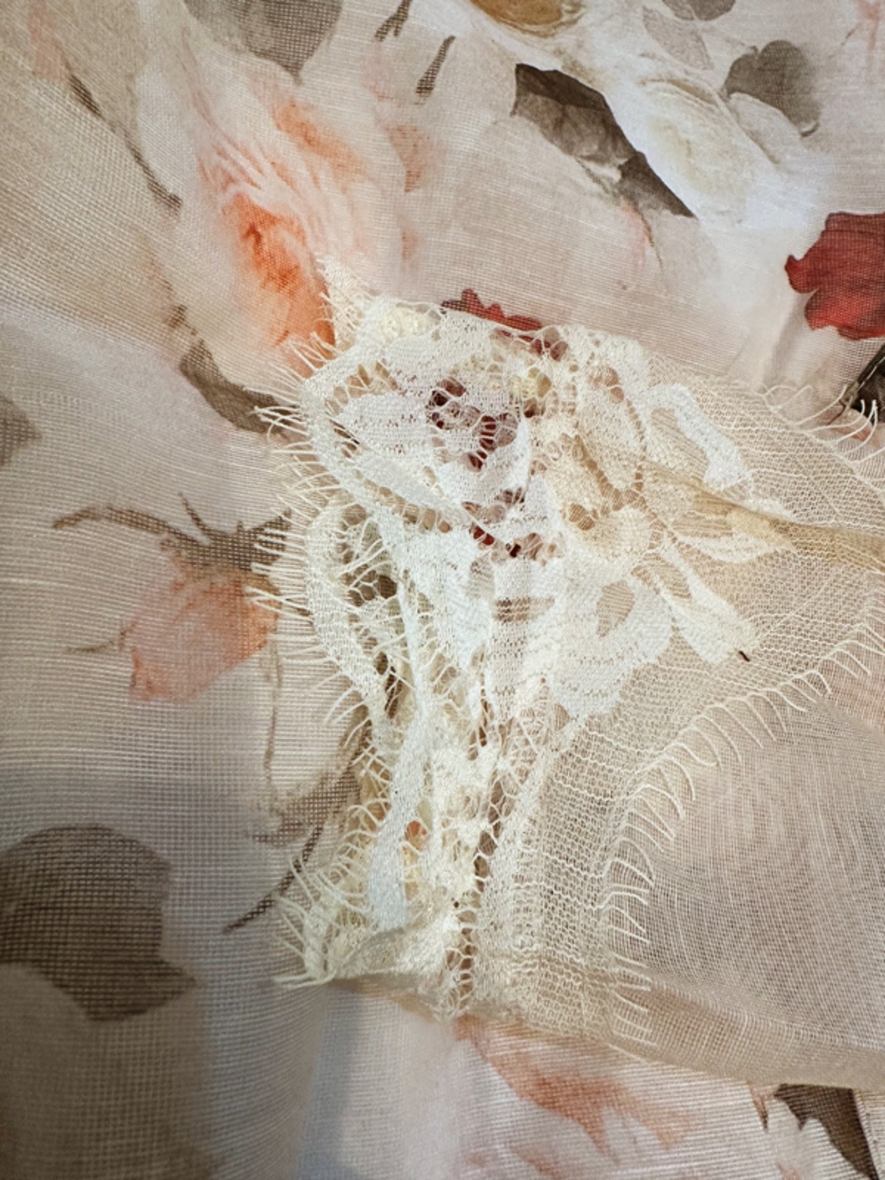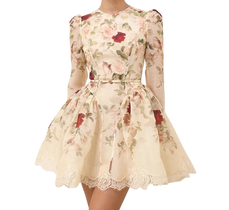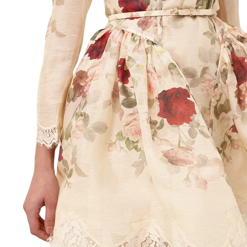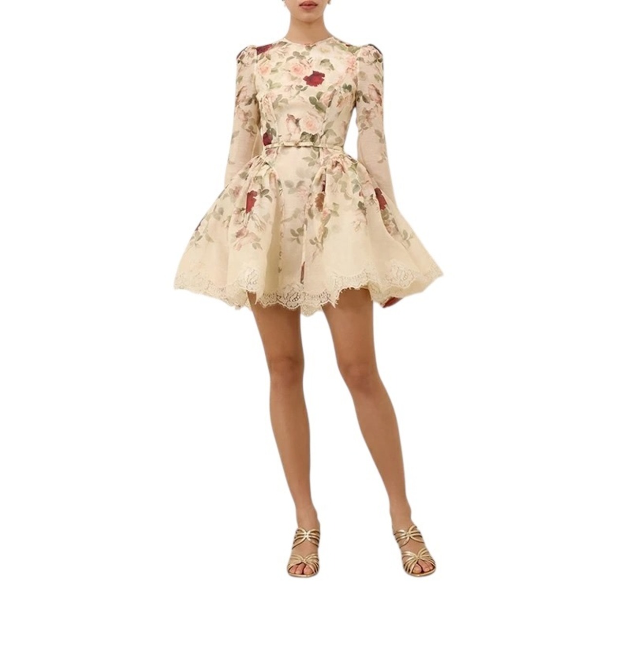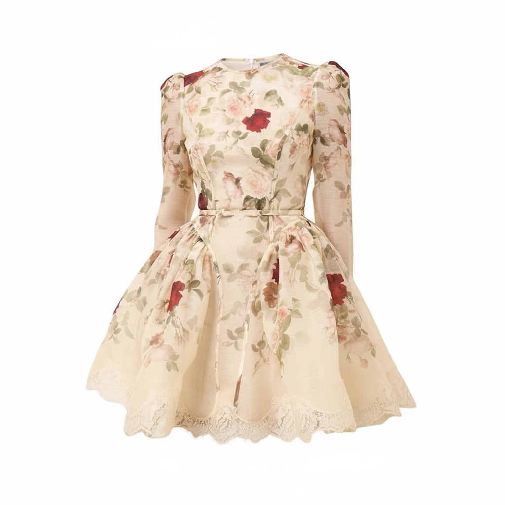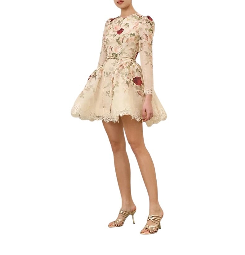 ■ディテール レーストリム/ウエスト下にタック/パフスリーブ/クルーネック/ベルト/ジッパー/裏地あり