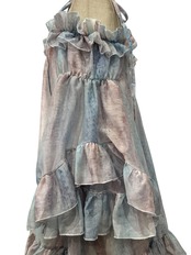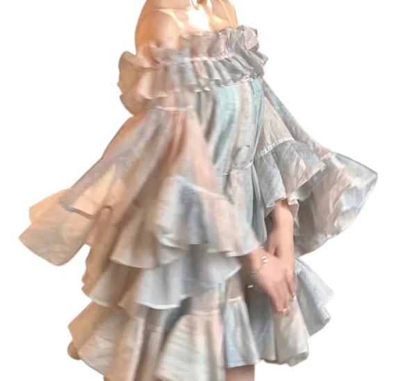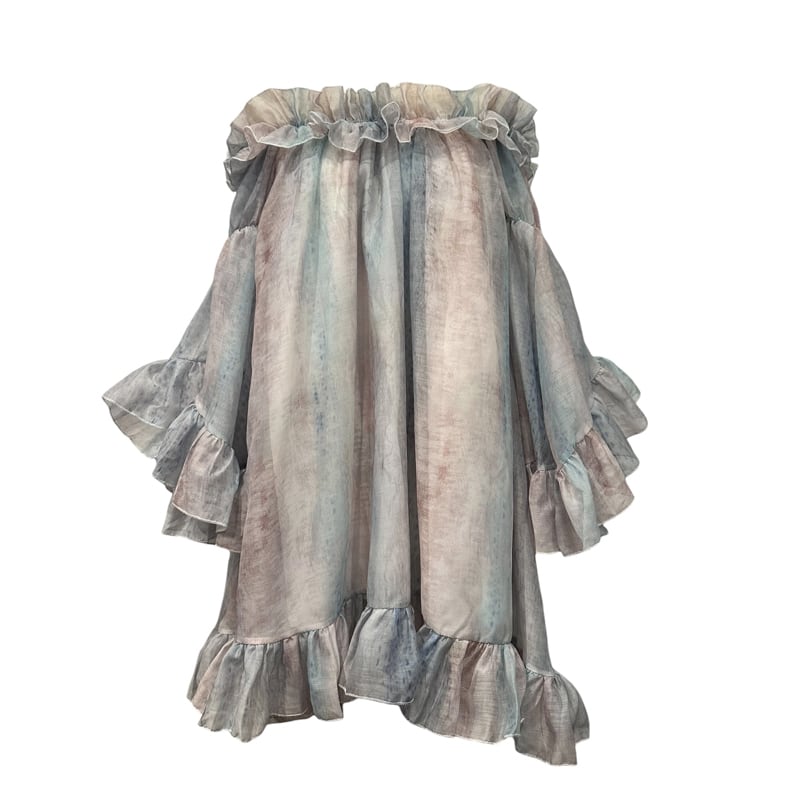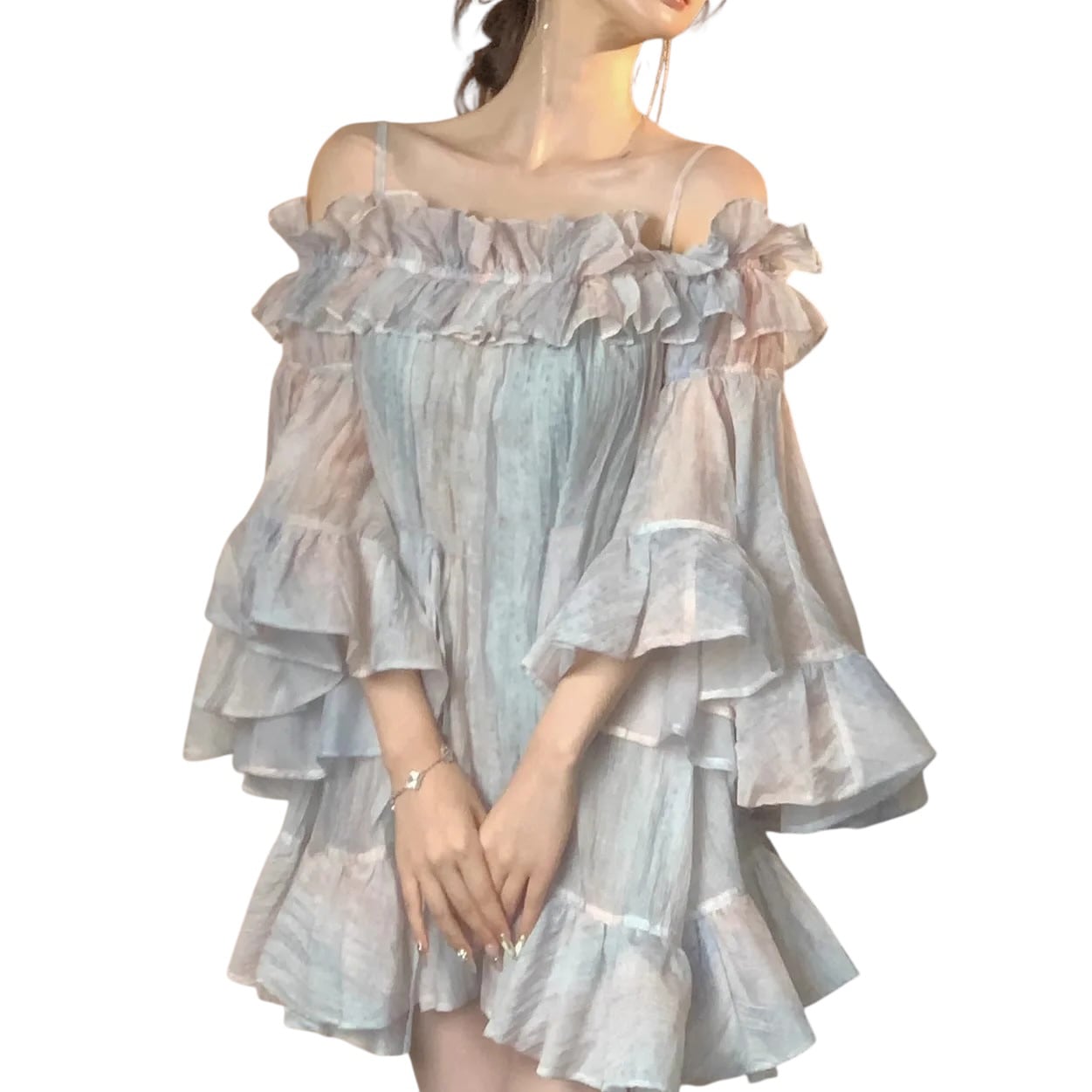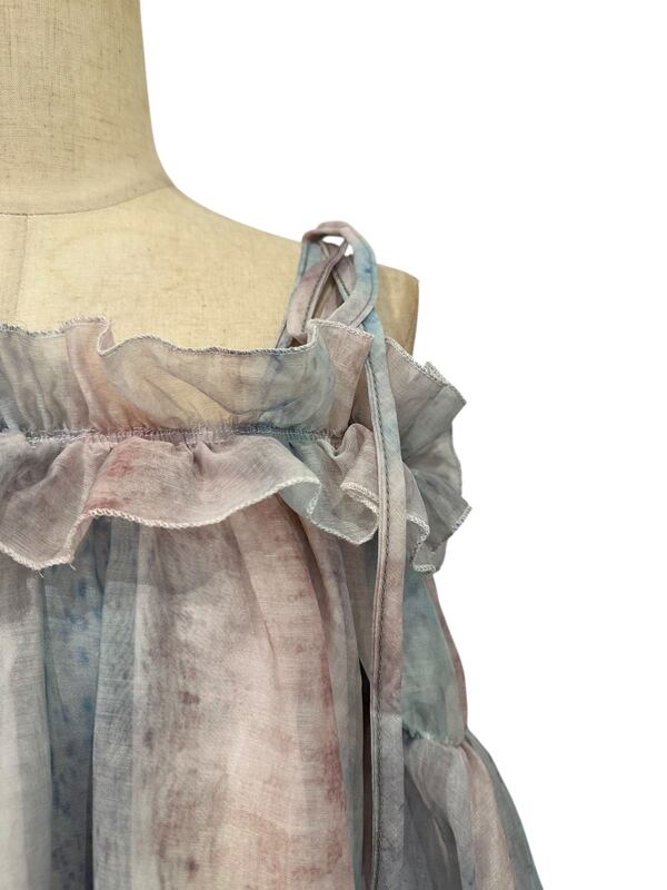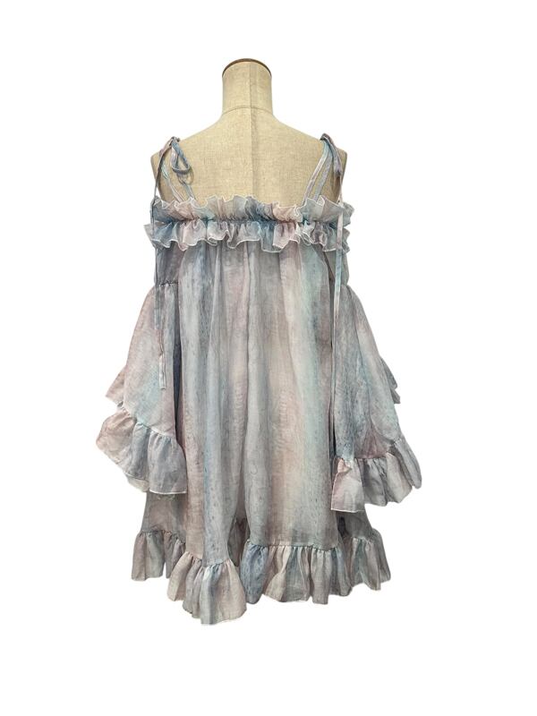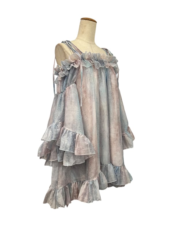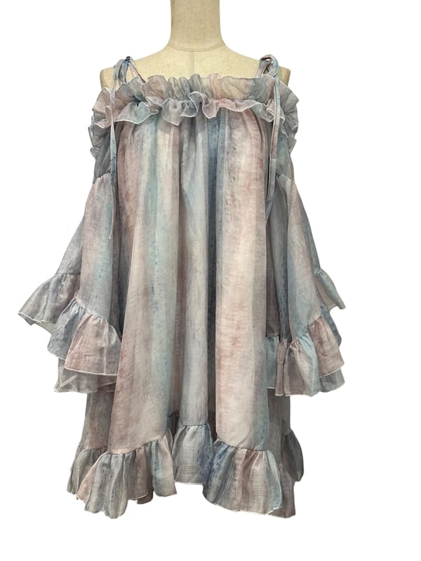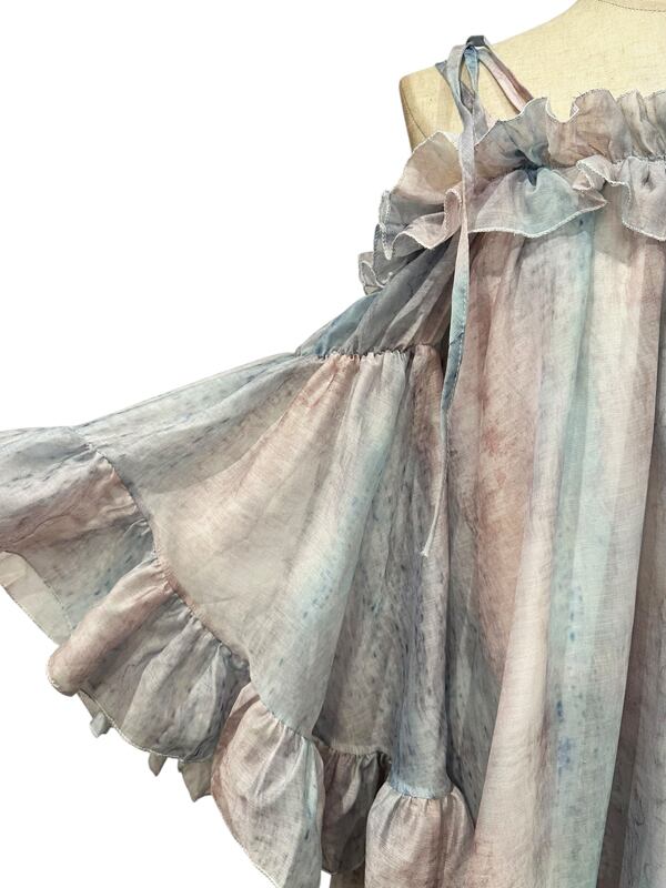 ■ディテール クロス/マーブル模様/ラッフル/ベルスリーブ/肩紐は取り外し可能/オフショルダー