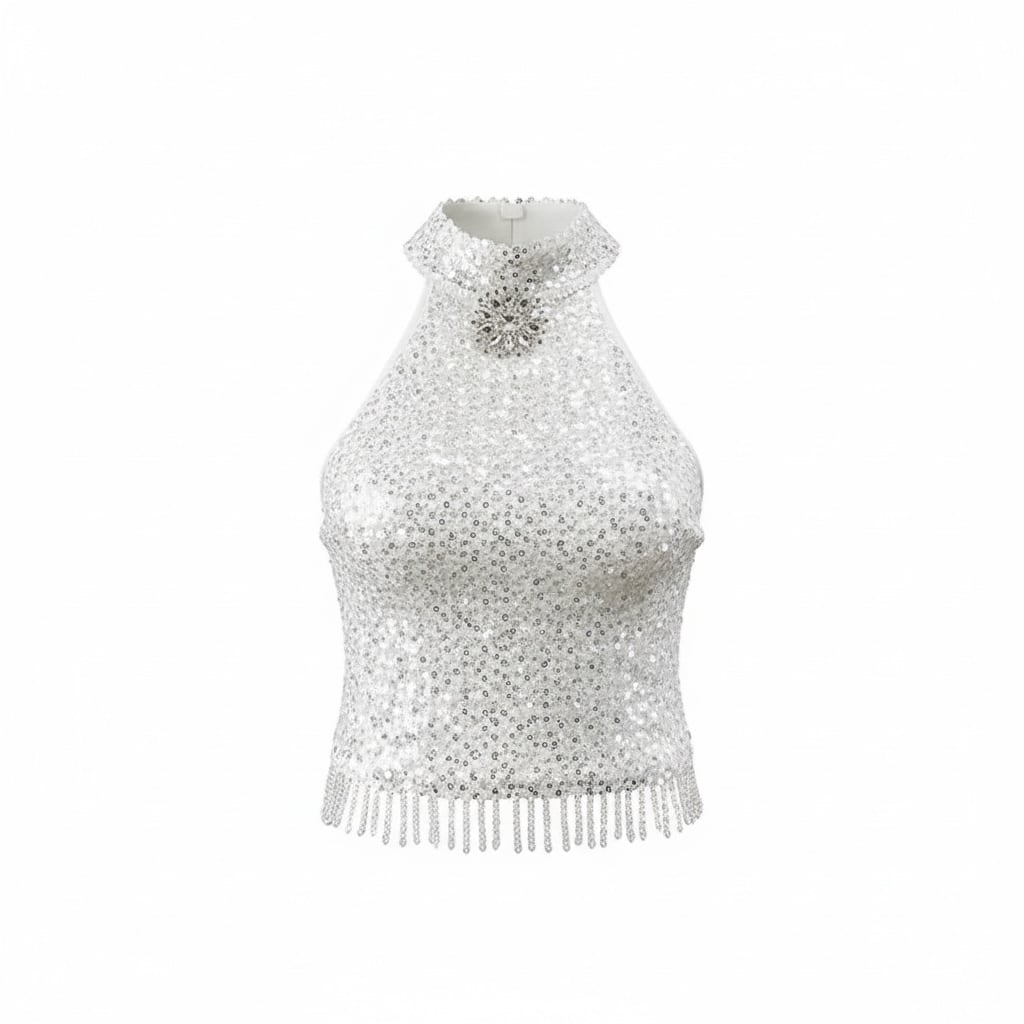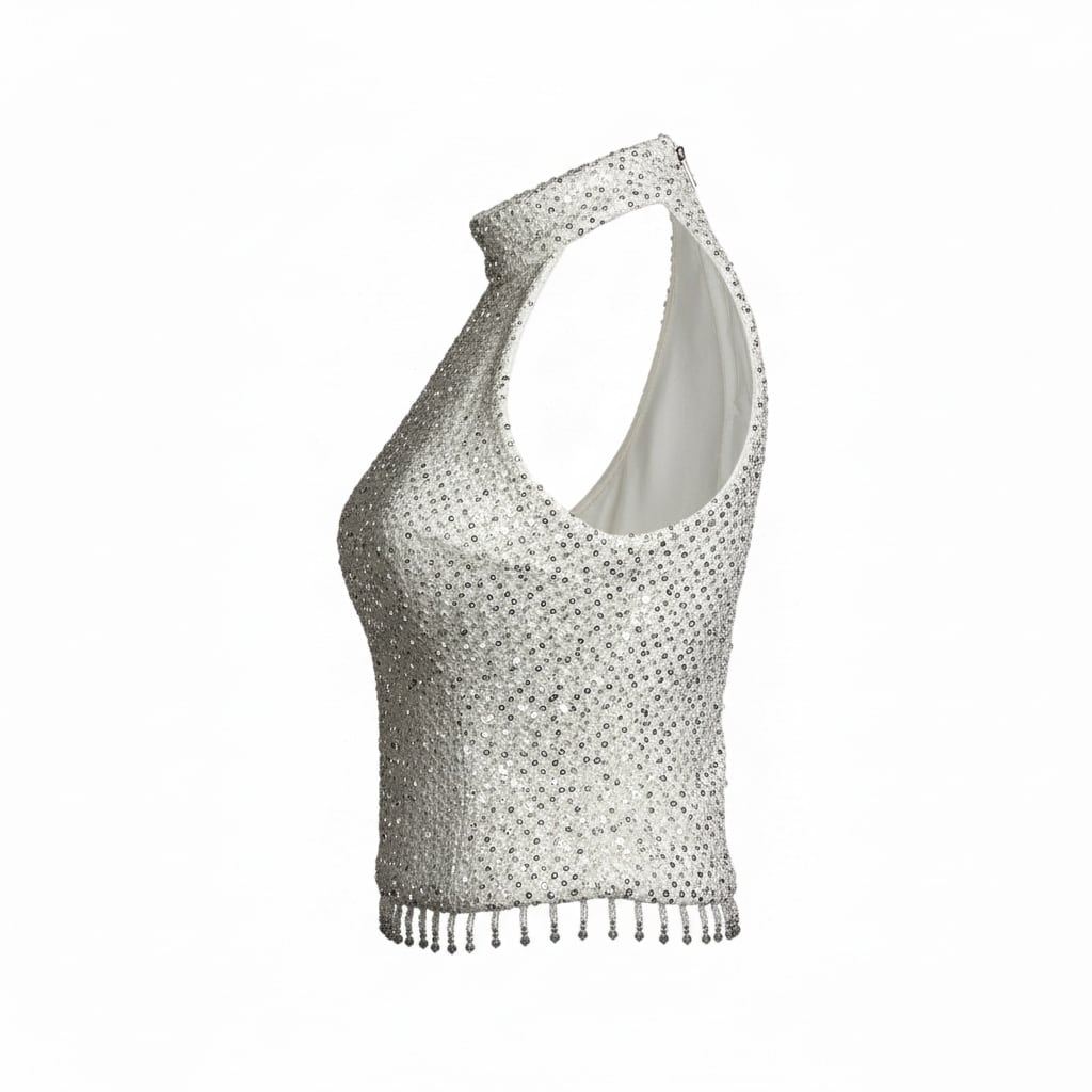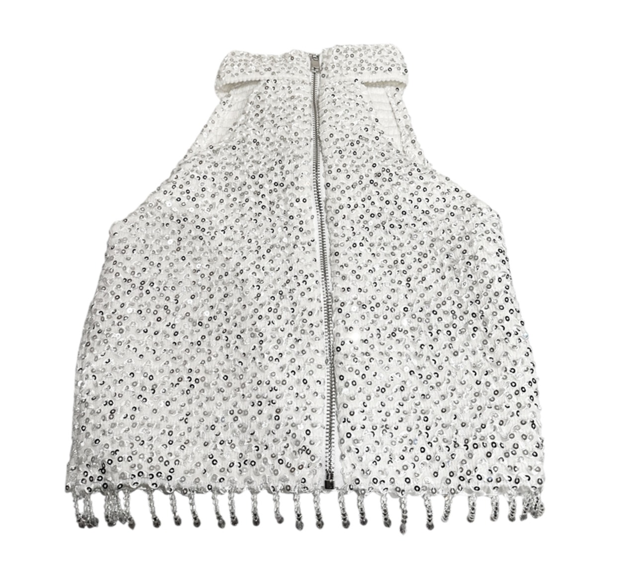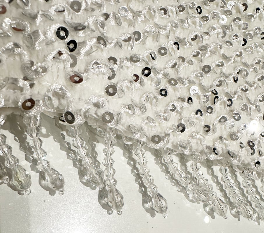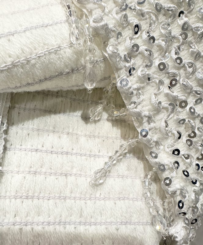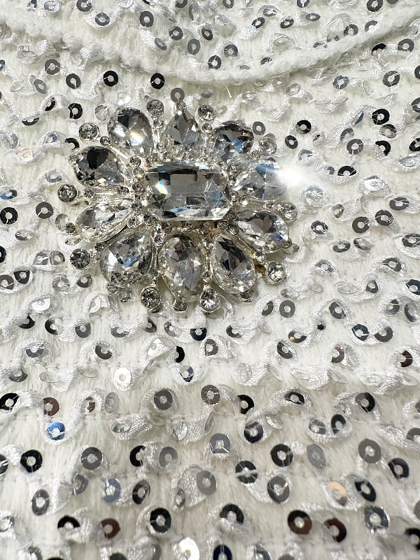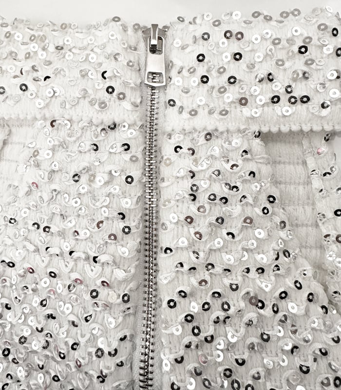 ■ディテール 厚手ニット/フロントの裾にビーズフリンジ/ストレッチ/ジッパー/スパンコール/ビジューブローチ/ジッパー