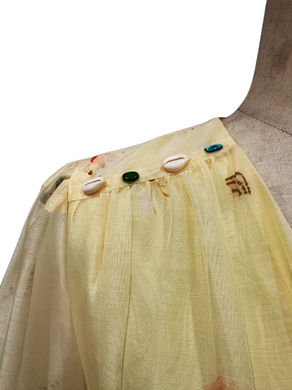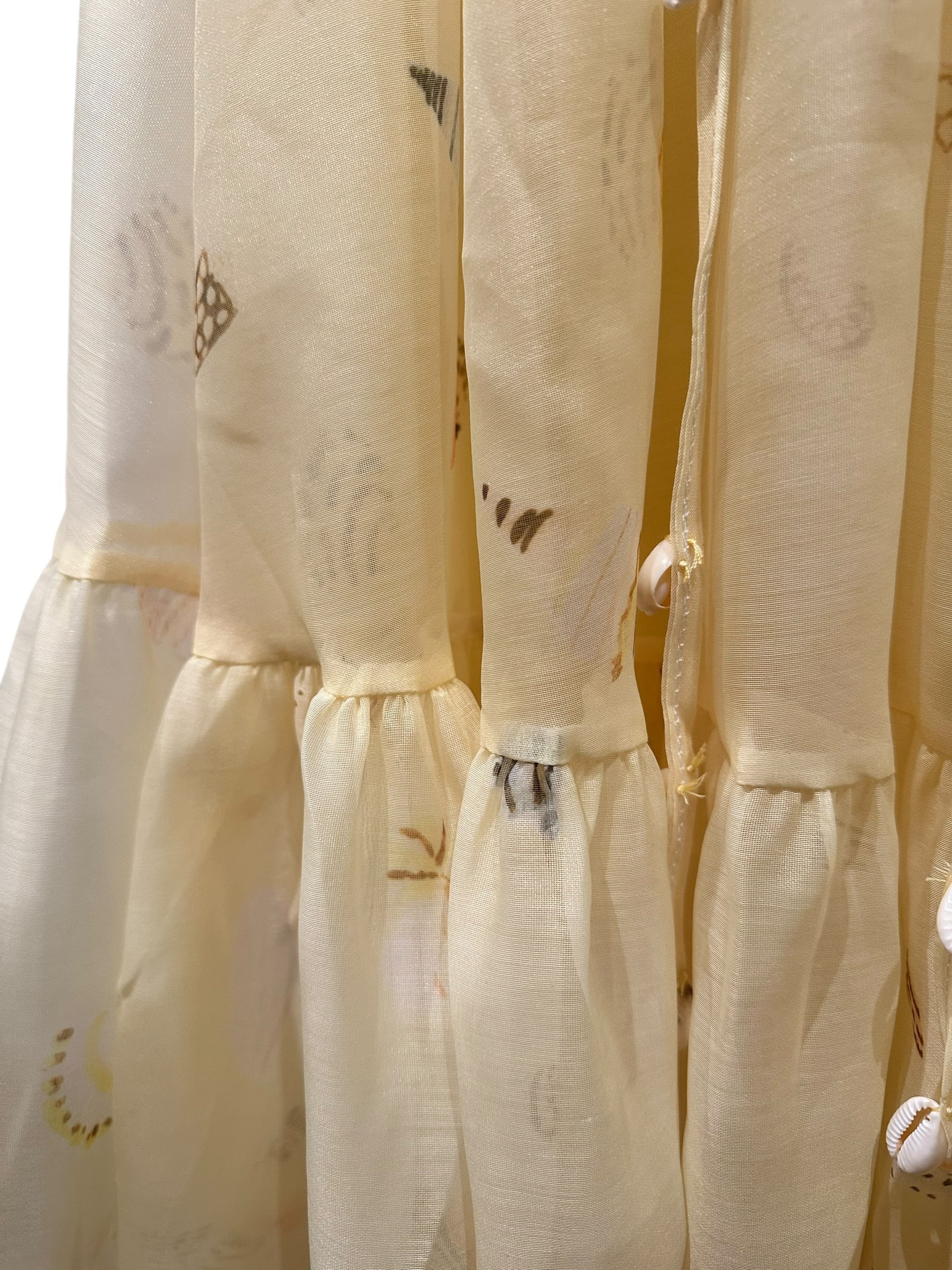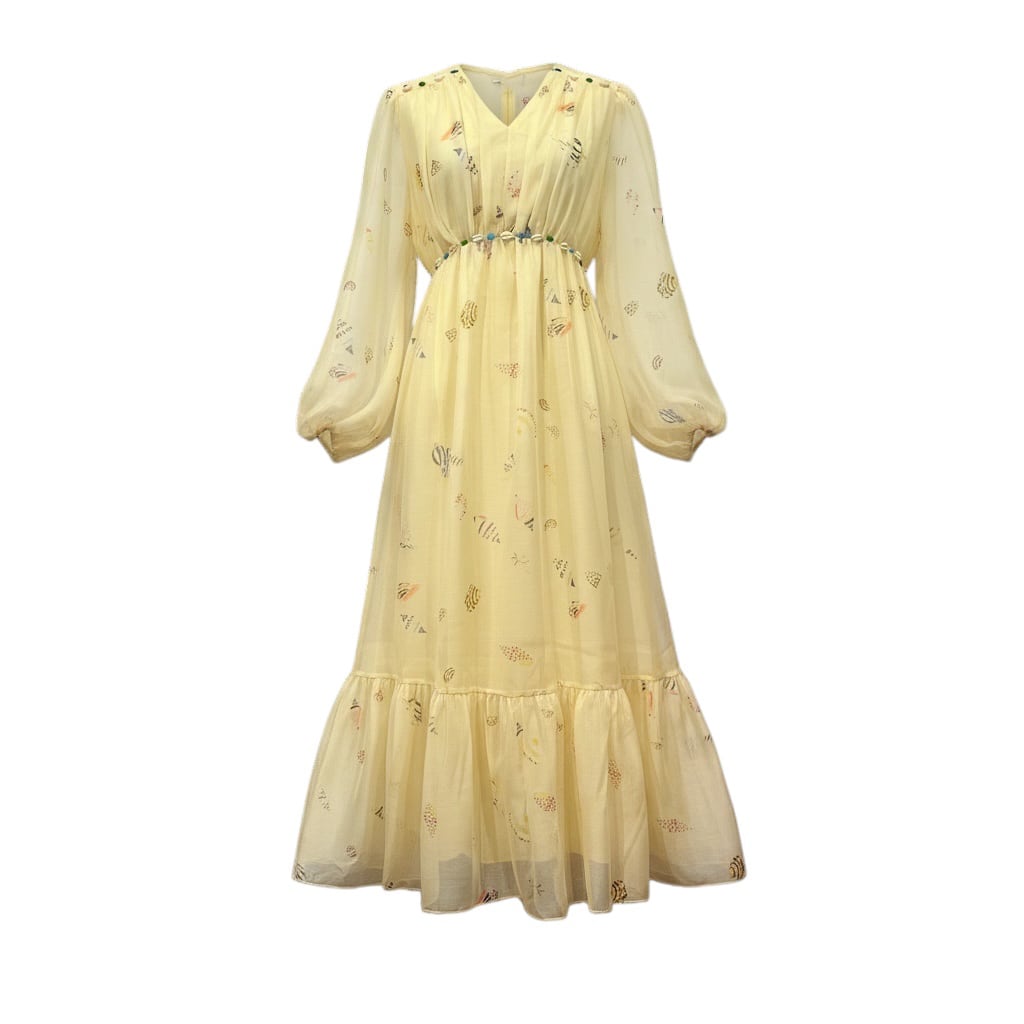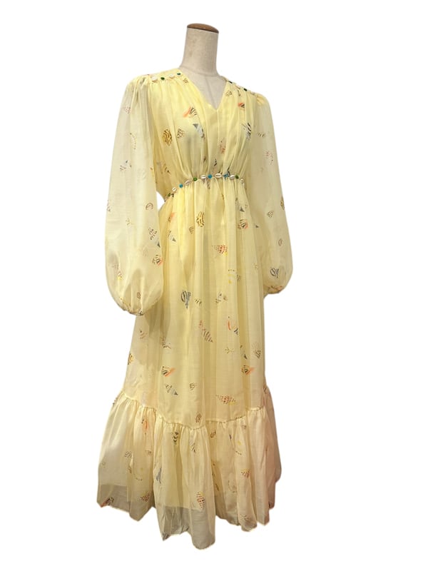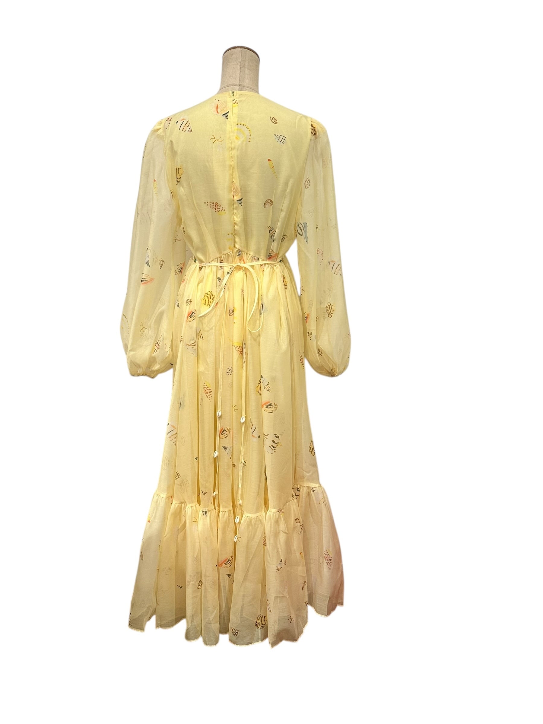 ■ディテール シェルモチーフの装飾/シェルパターン/パフスリーブ/Vネック/バックジッパー/裏地あり