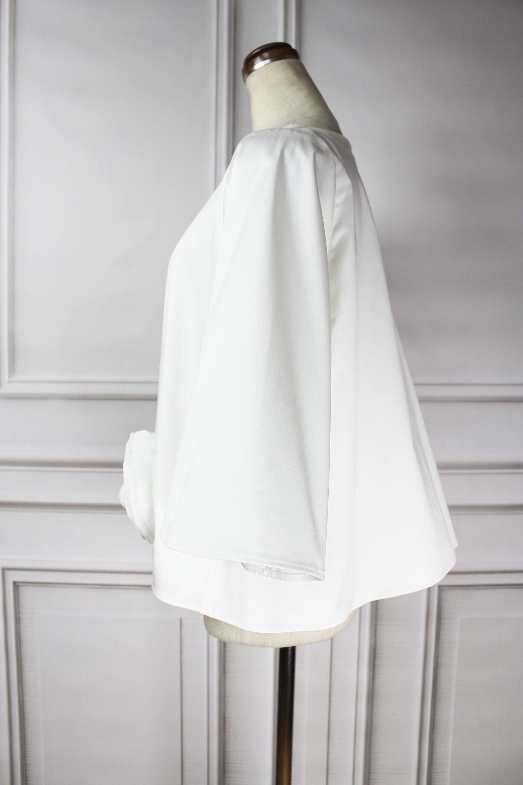 ふんわりと広がるバックスタイルに、ベルスリーブのフレアーシルエットが軽やかな印象を与えます。