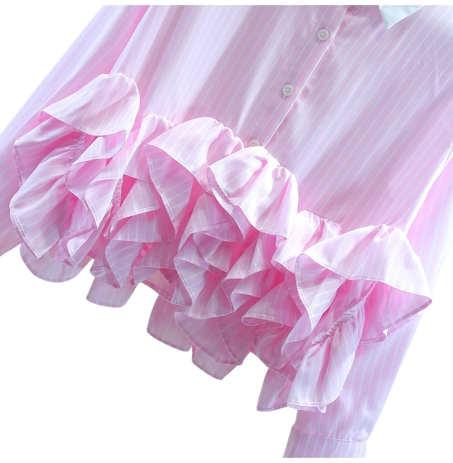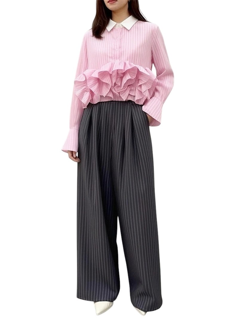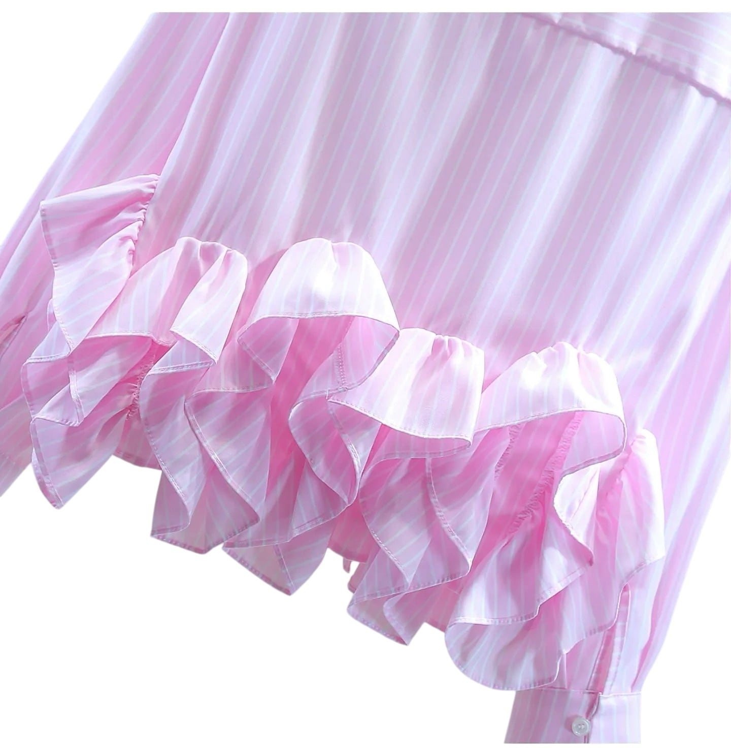 ■ディテール ストライプシャツ/クロス/ラッフルヘム/クラシックカラー