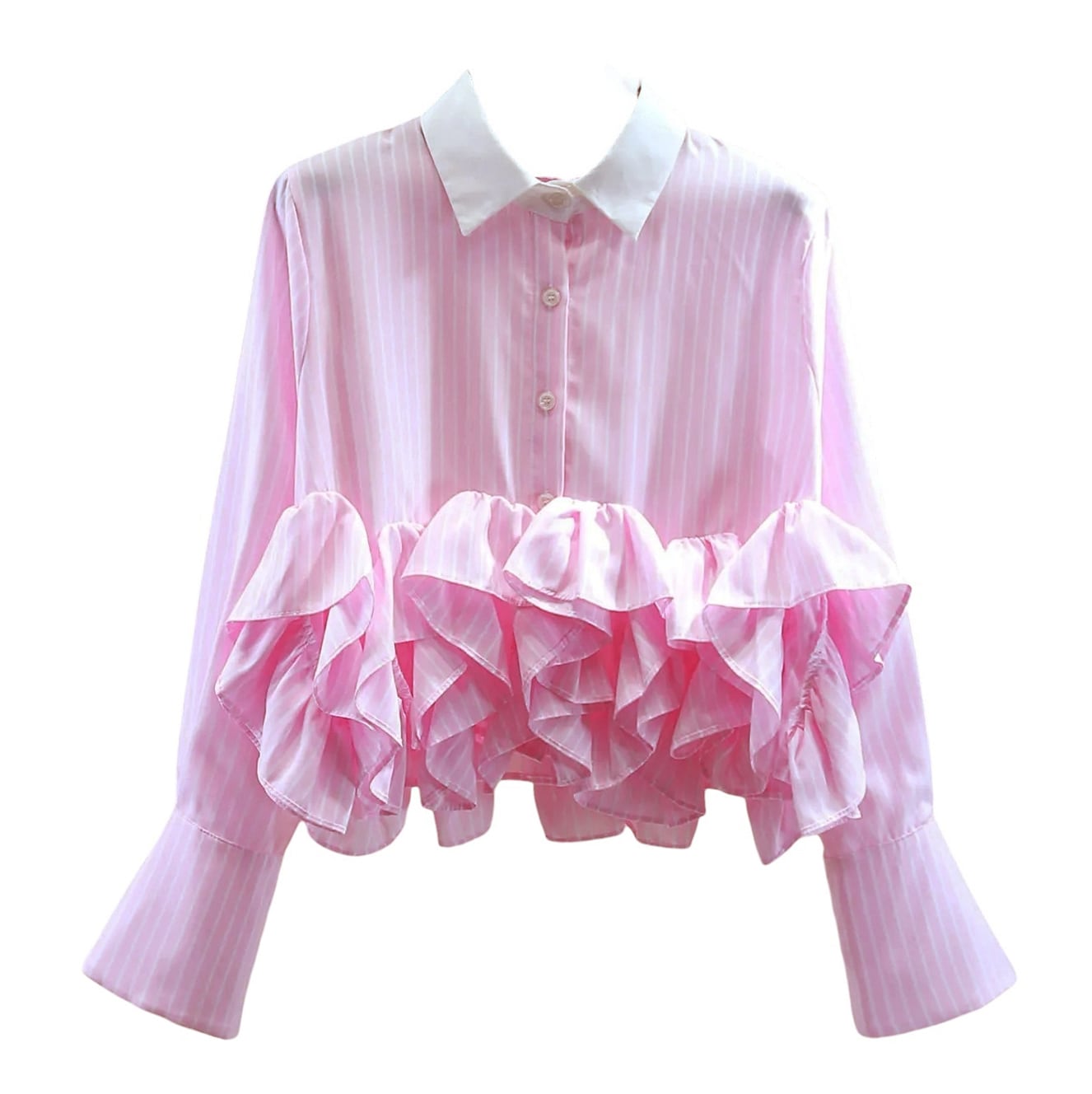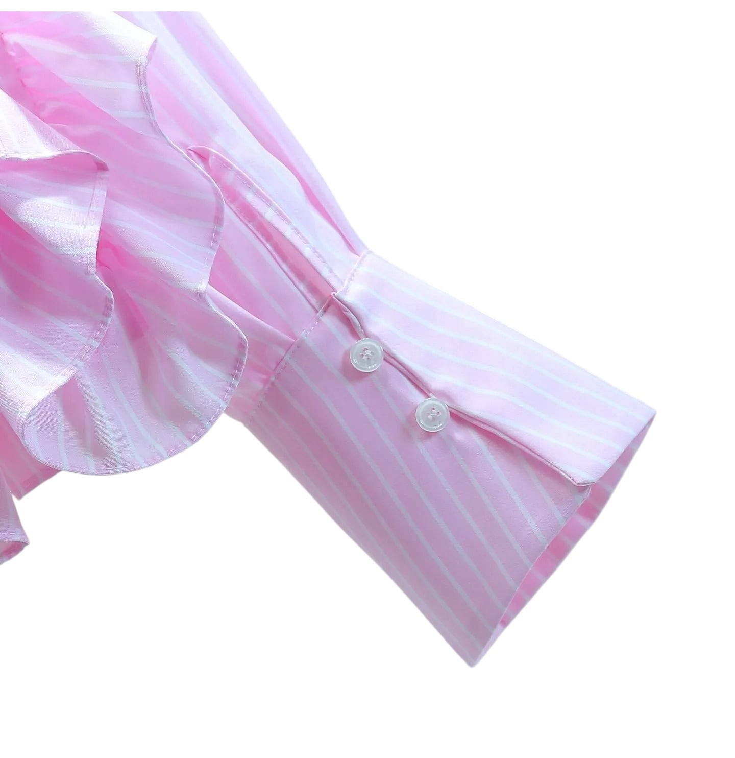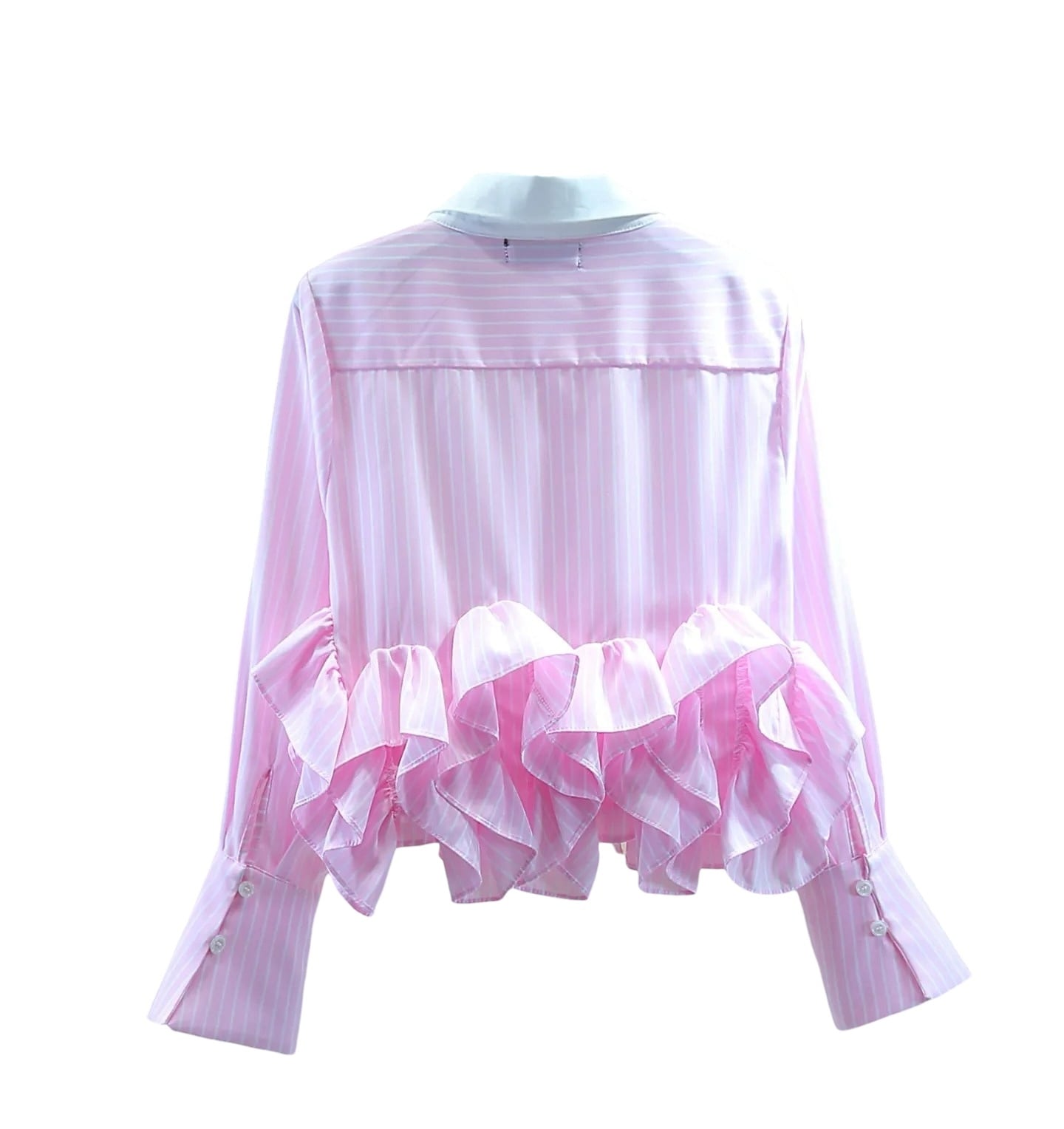■ディテール ストライプシャツ/クロス/ラッフルヘム/クラシックカラー