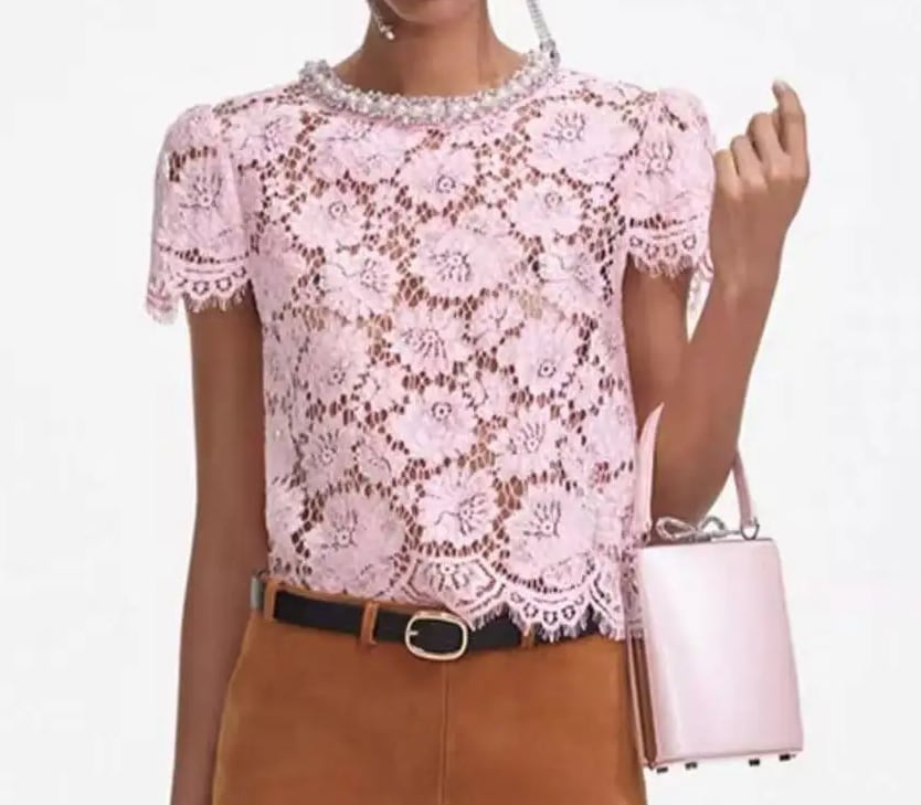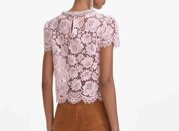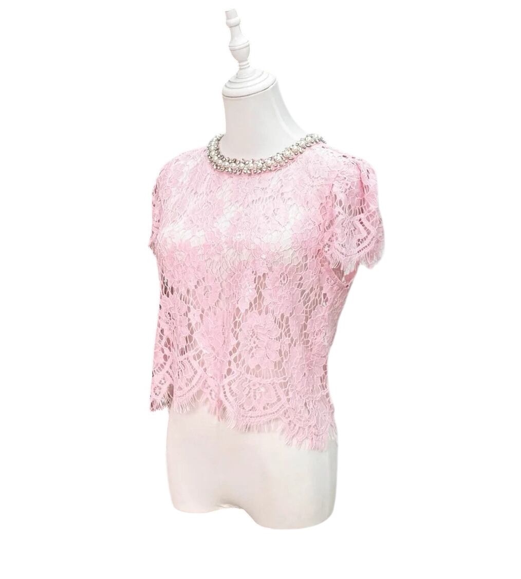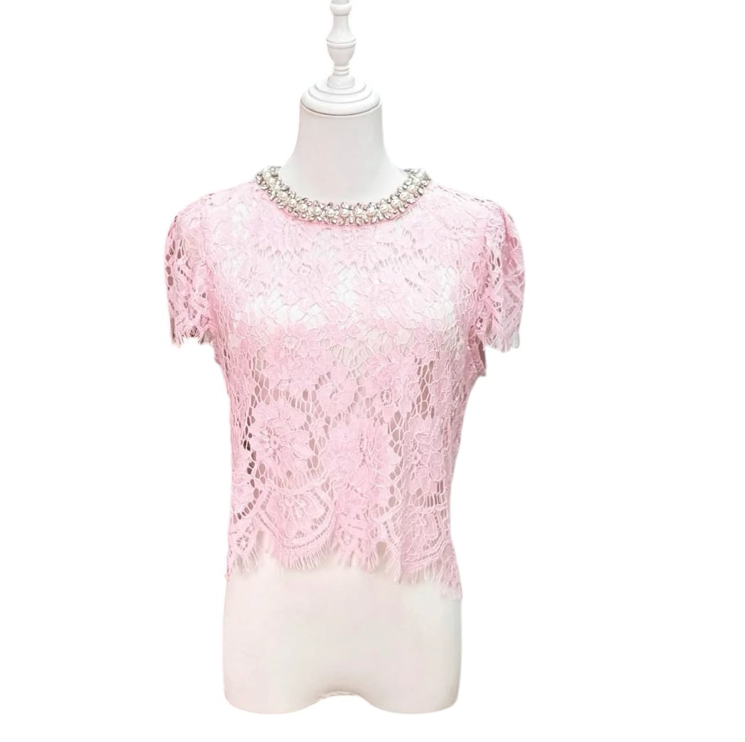 カットアウト/レース/パフスリーブ/プルオーバー/パールビジュートリム/裏地あり